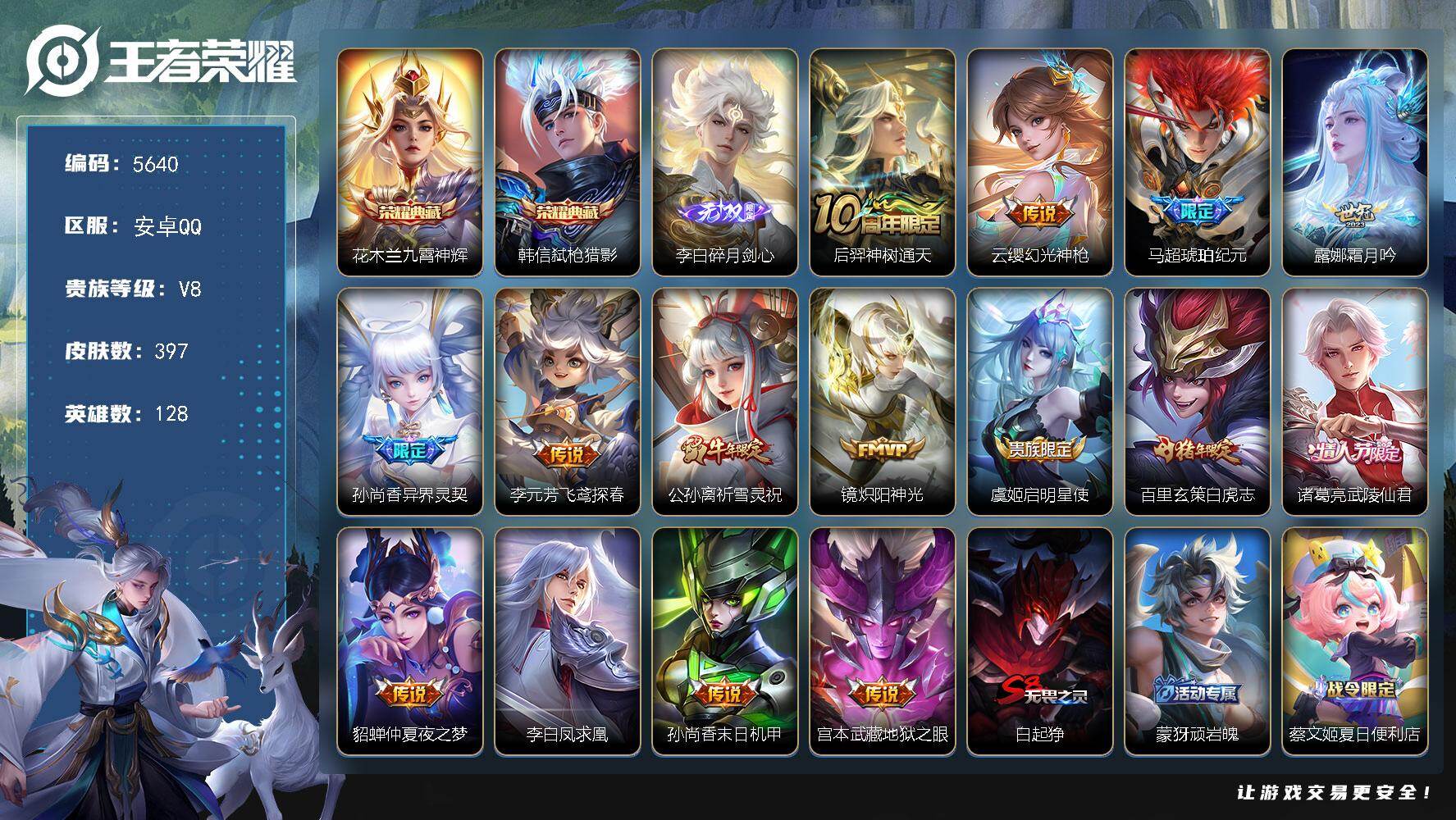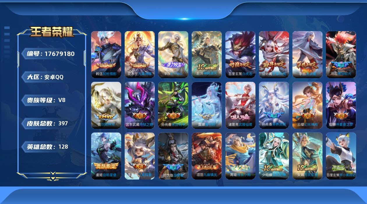 325-[17679180]金标敖隐 幽冥眼 香香机甲 金色貂蝉安卓手Q155区397皮2典藏15传说1无双V8 营地ID344057836永恒钻石III【无双皮肤】:碎月剑心【荣耀典藏】:弑枪猎影,九霄神辉【优质限定皮肤】:神威,祈雪灵祝,白虎志,至尊宝,凤求凰【传说皮肤】:神树通天,琥珀纪元,飞鸢探春,霜月吟,地狱之眼,幻光神枪,启明星使,异界灵契,祈雪灵祝,炽阳神光,末日机甲,仲夏夜之梦,白虎志,凤求凰,武陵仙君【史诗皮肤】:百晓客,罗小黑战记,九幽镇关,青蛇,巫礼祀神,妄想食味,万