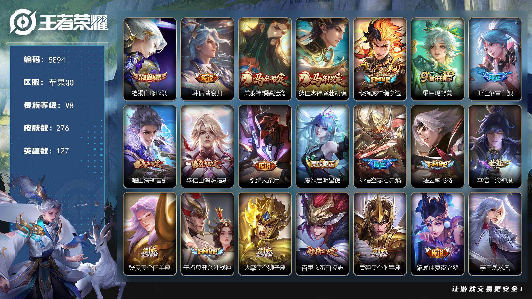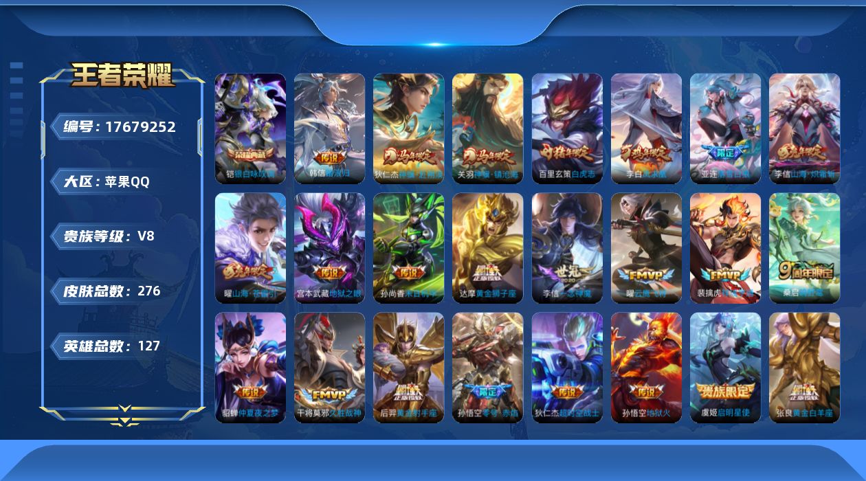 394-[17679252]贵族8-贵族积分70457-276皮1典藏24传说0无双 苹果手Q143区276皮1典藏24传说0无双V8 营地ID1897297413绝世王者【荣耀典藏】:银白咏叹调【优质限定皮肤】:凤求凰,白虎志,山海·苍雷引,山海·炽霜斩【传说皮肤】:凤求凰,踏浪归,神骥·镇沧海,白虎志,神骥·赴朔漠,落雪白狼,黄金白羊座,祥瑞亨通,末日机甲,久胜战神,鸣野蒿,启明星使,山海·苍雷引,山海·炽霜斩,仲夏夜之梦,绛天战甲,地狱之眼,超时空战士,黄金狮子座,云鹰飞将,一念神魔,零