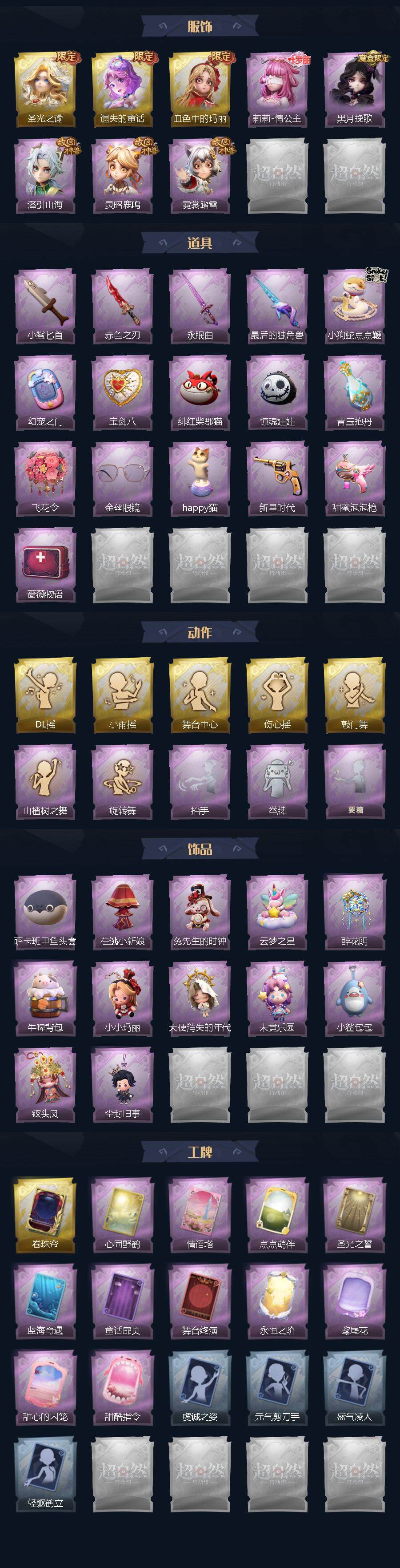 薇薇安-圣光之谕,小黄-遗失的童话,爱丽丝-血色中的玛丽,莉莉-情公主,薇薇安-黑月挽歌,逍遥-泽引山海,阿念-灵昭鹿鸣,小黄-霓裳踏雪,刺刀-小鲨匕首,刺刀-赤色之刃,桃木剑-永眠曲,桃木剑-最后的独角兽,长鞭-小狗蛇点点鞭,传送按钮-幻宠之门,腰包-宝剑八,腰包-绯红柴郡猫,腰包-惊魂娃娃,黄牛能量饮料-青玉抱丹,额外的背包-飞花令,夜视仪-金丝眼镜,音响-happy猫,转轮手枪-新星时代,电击枪-甜蜜泡泡枪,急救包-蔷薇物语,DL摇,小雨摇,舞台中心,伤心摇,敲门舞,山楂树之舞,旋转舞,抬