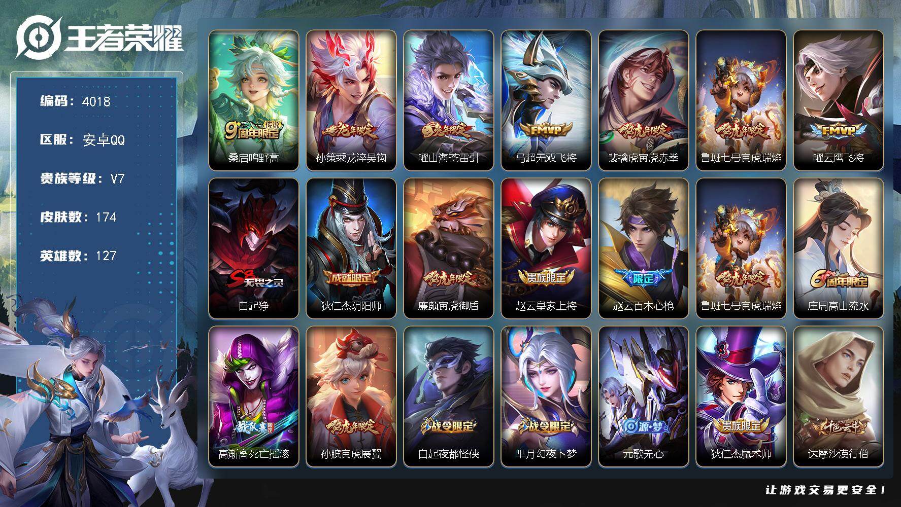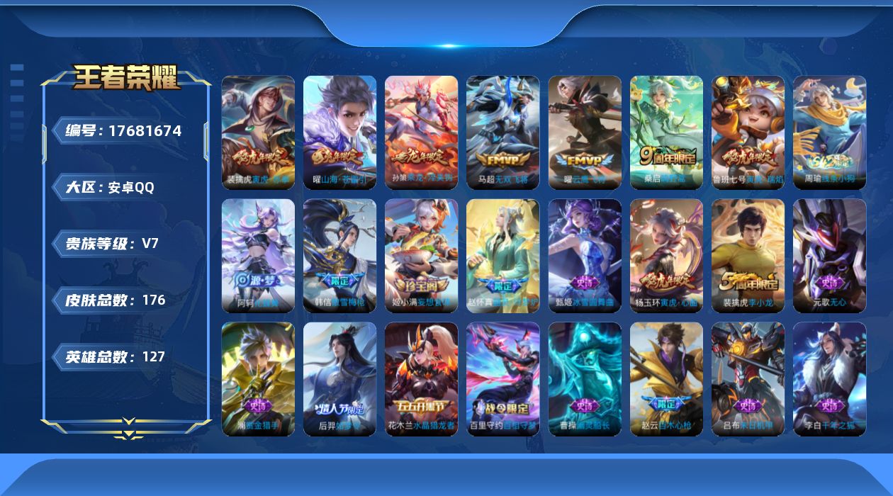 258-[17681674]贵族7-贵族积分28168-174皮0典藏7传说 九位数QQ 万战裴擒虎 安卓手Q231区174皮0典藏7传说0无双V7 营地ID322934755非凡王者【优质限定皮肤】:山海·苍雷引,无双飞将【传说皮肤】:鸣野蒿,乘龙·淬吴钩,山海·苍雷引,云鹰飞将,无双飞将,寅虎·瑞焰,寅虎·赤拳【史诗皮肤】:黎明之约,化蝶舞,末日机甲,器灵·浮梦炉,月团寄思,百相守梦,高山流水,天才门将,龙骑士,暗隐猎兽者,妄想食味,德古拉伯爵,乱世虎臣,冰雪圆舞曲,原初追逐者,江河有