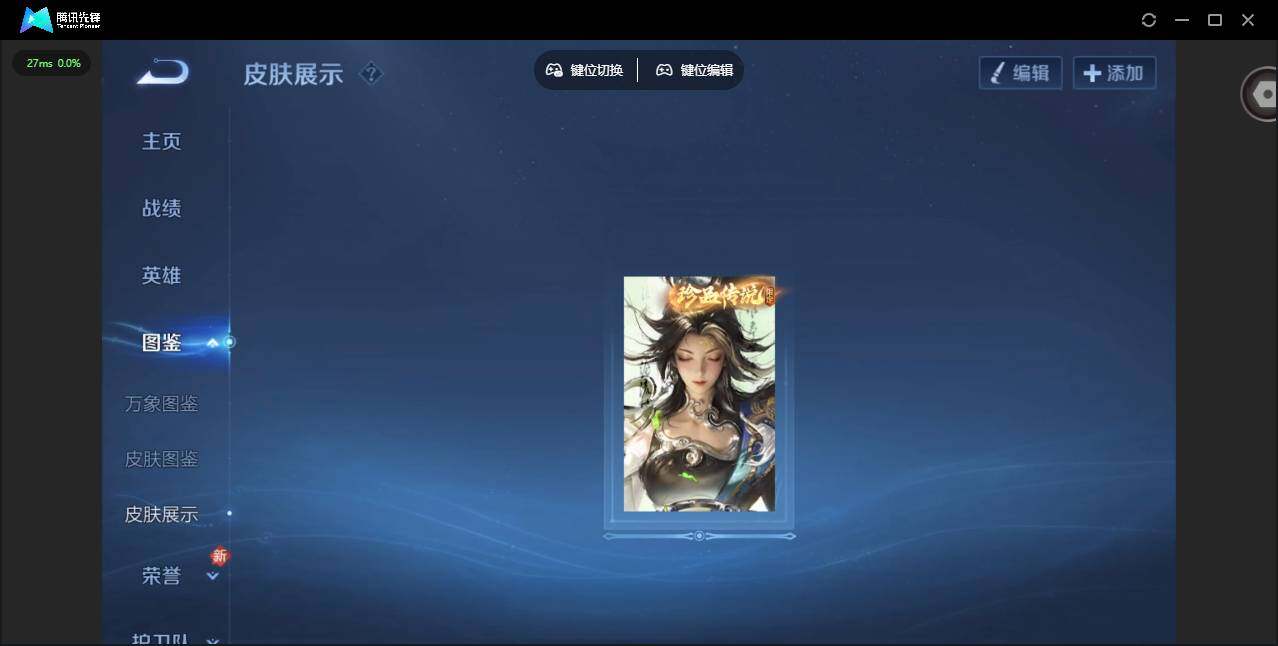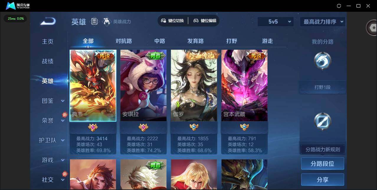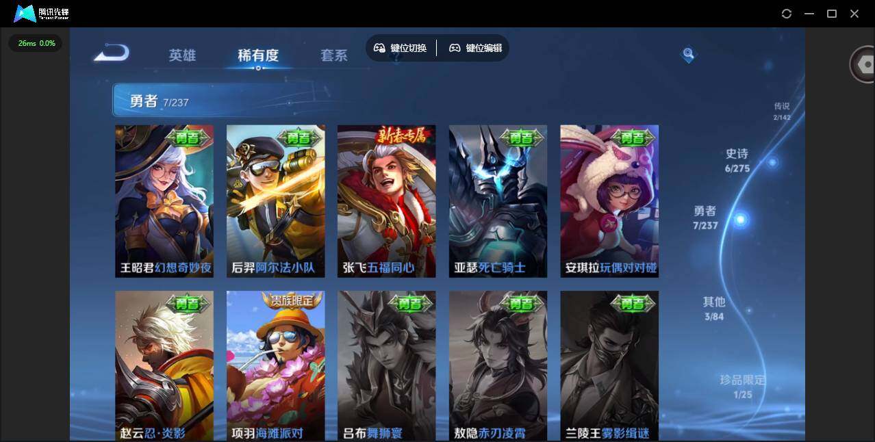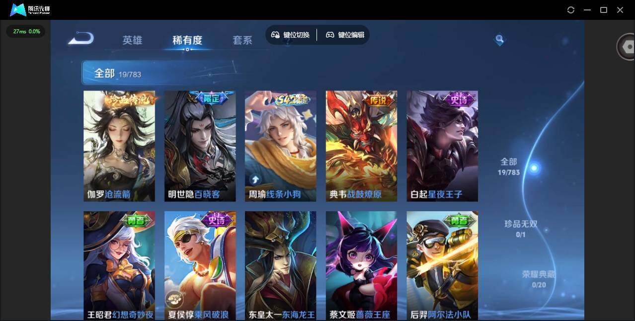 贵族等级: V4 英雄数: 39 皮肤数: 19 珍品传说: 沧流箭 传说皮: 地狱之眼,典韦战鼓燎原