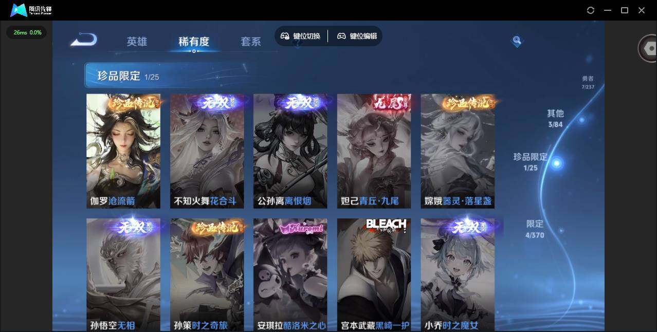 贵族等级: V4 英雄数: 39 皮肤数: 19 珍品传说: 沧流箭 传说皮: