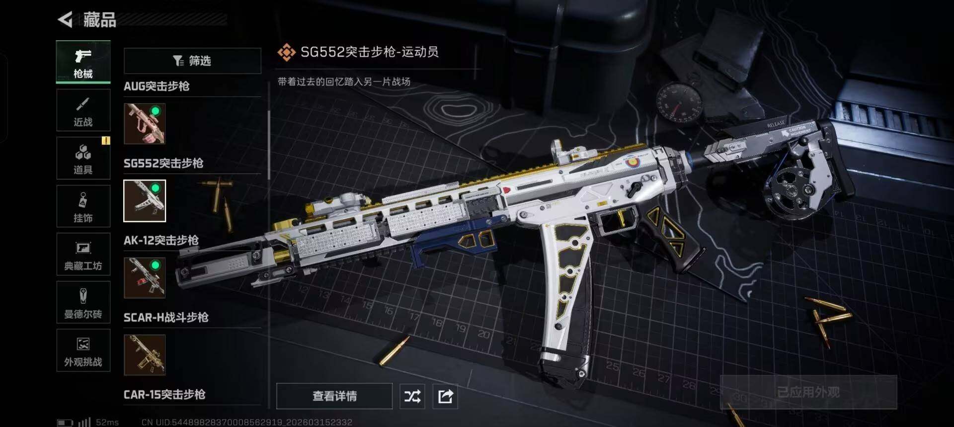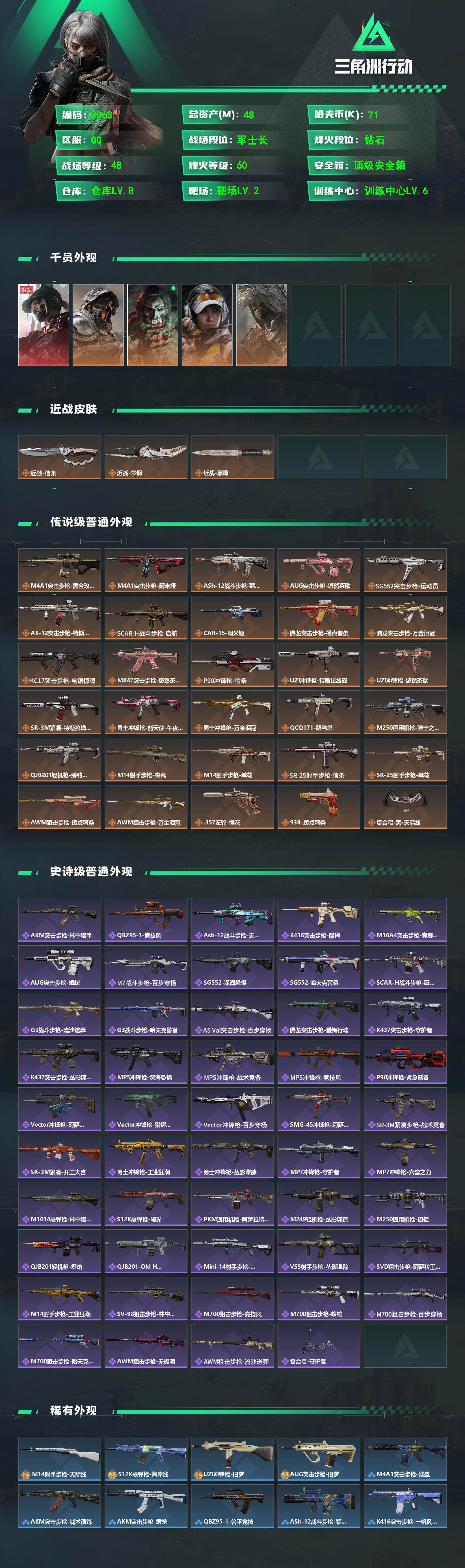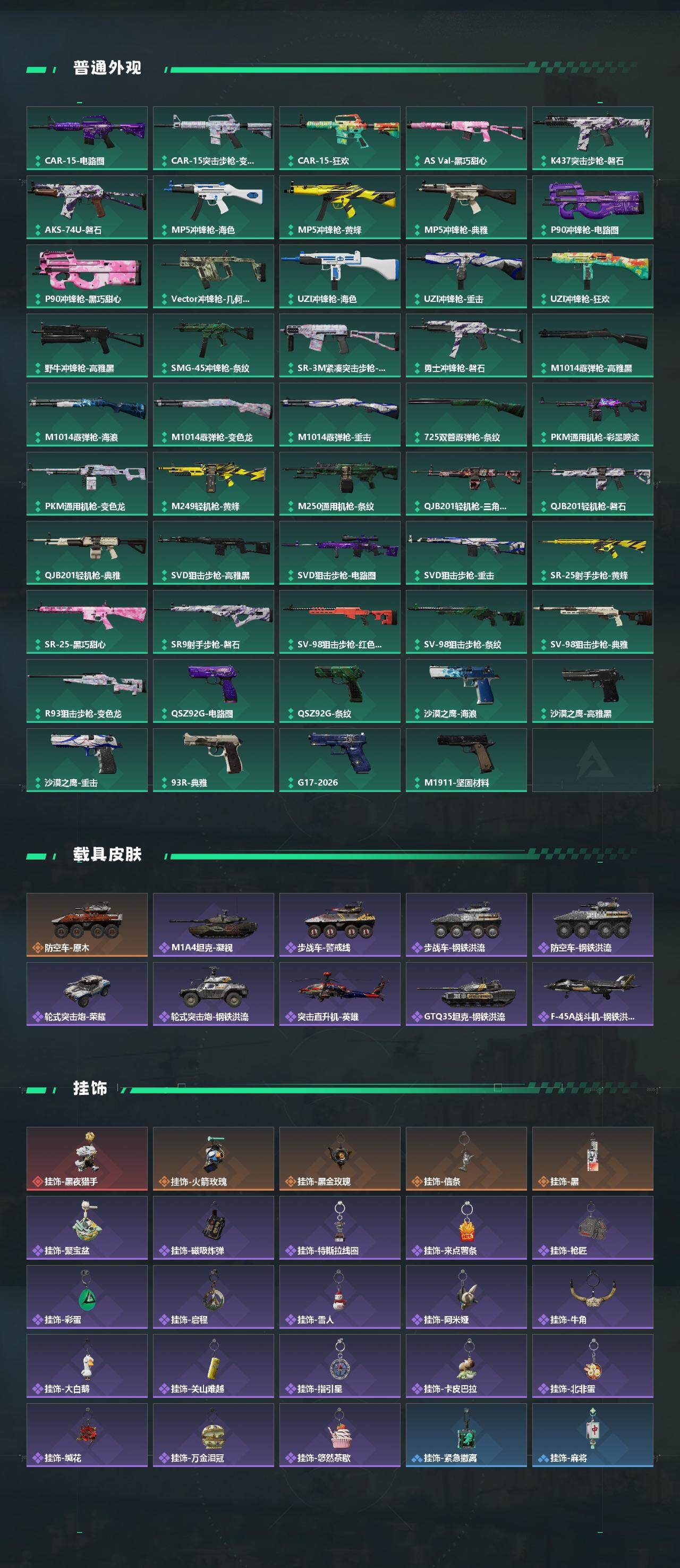 【传说外观】:M4A1突击步枪-蚀金玫瑰,M4A1突击步枪-阿米娅,ASh-12战斗步枪-鹅鸭杀,AUG突击步枪-悠然茶歇,SG552突击步枪-运动员,AK-12突击步