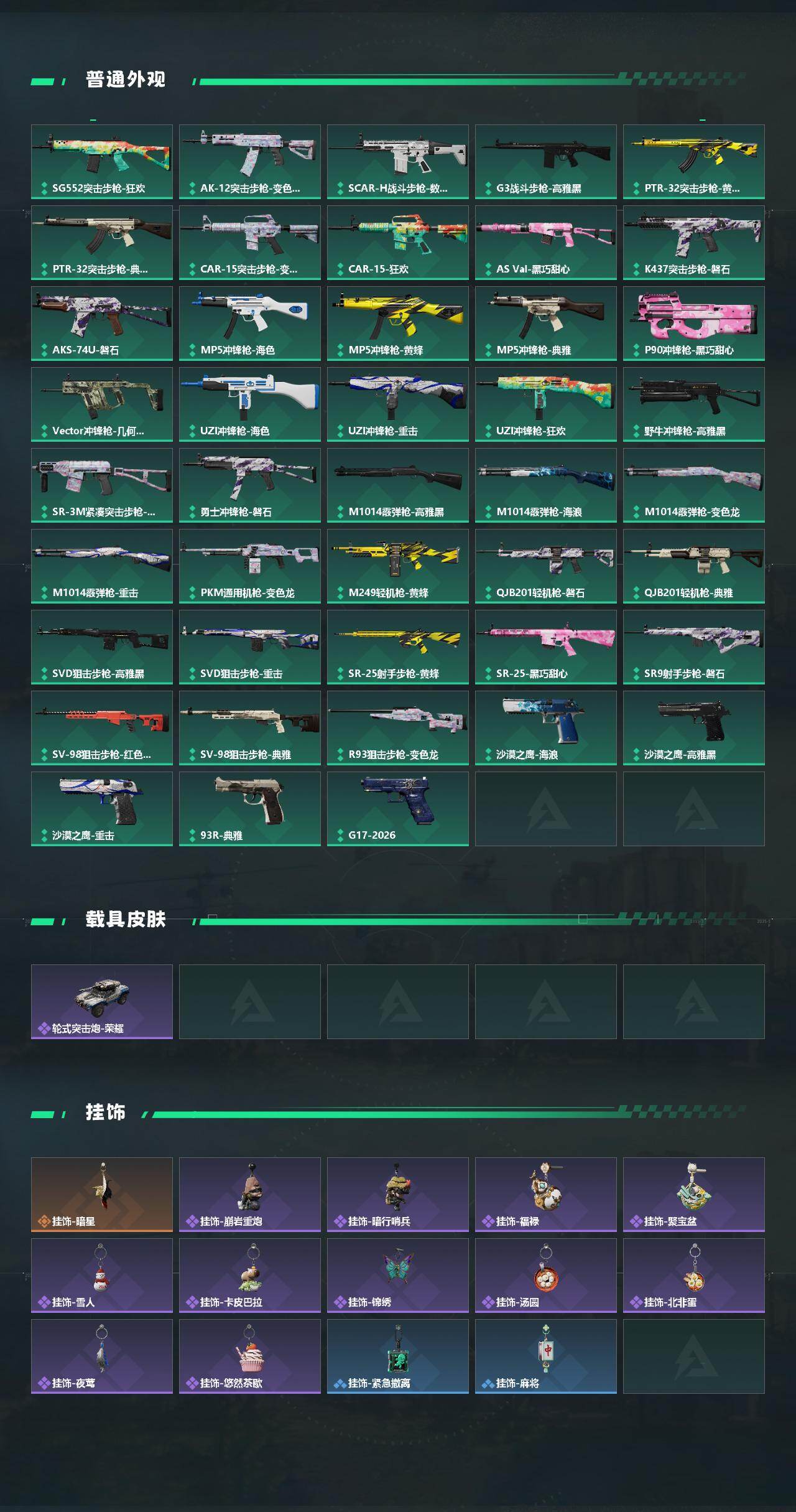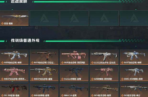 【传说外观】:AKM突击步枪-锦绣,K416突击步枪-行动记录,AUG突击步枪-悠然茶歇,SG552突击步枪-运动员,K437突击步枪-锦绣,MK47突击步枪-悠然茶歇,MK47突击步枪-暗星,Vector冲锋枪-夜莺,UZI冲锋枪-悠然茶歇,SMG-45冲锋枪-锦绣,SR-3M紧凑突击步枪-暗