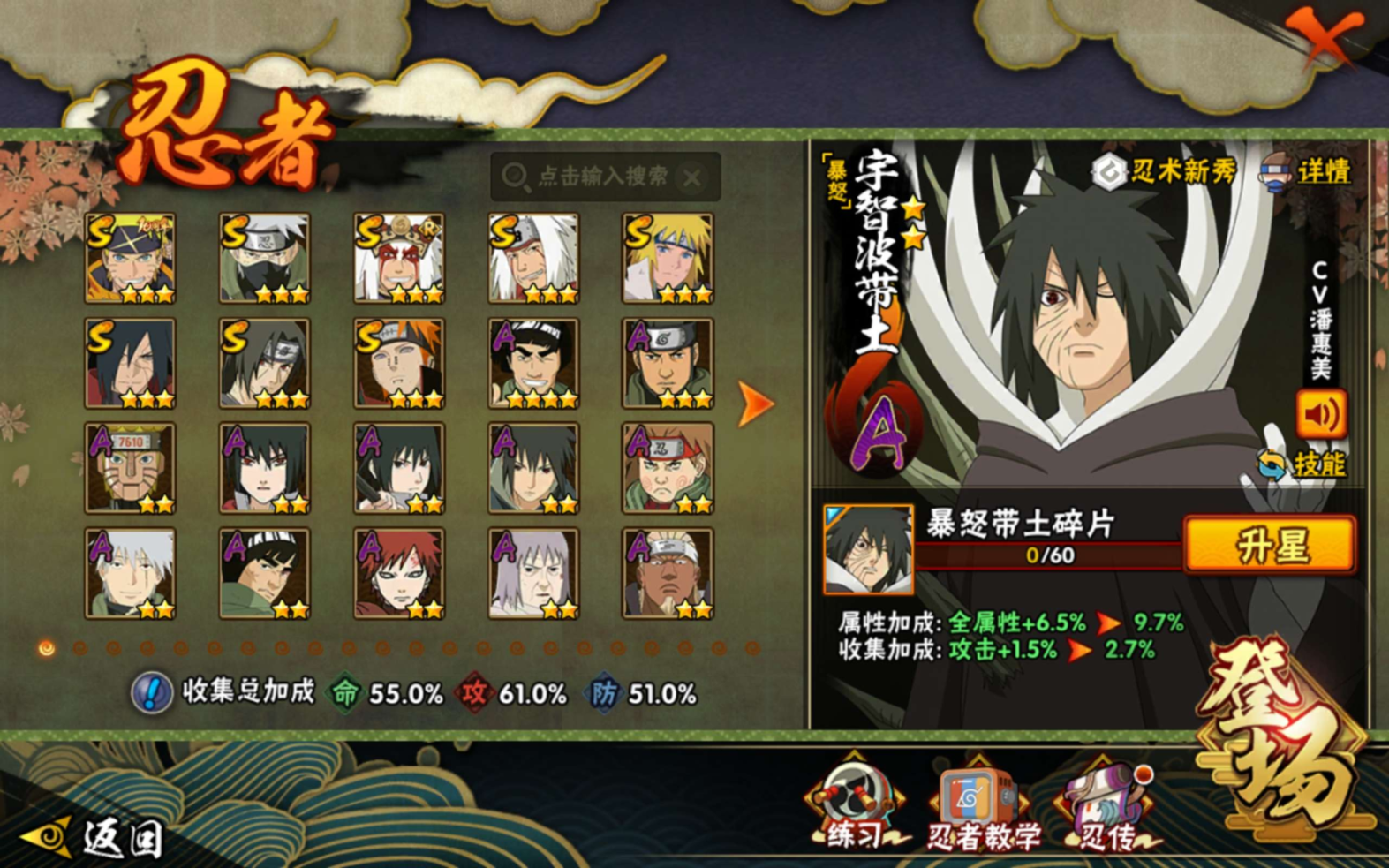【S级忍者】旗木卡卡西「须佐能乎」(3星),自来也「传说中的三忍」(3星),宇智波斑「秽土转生·解」(3星),自来也「舞之豪杰」(3星),宇智波鼬「须佐能乎」(3星),漩涡鸣人·宇智波佐助(3星),佩恩「天道」(3星),波风水门(3星
