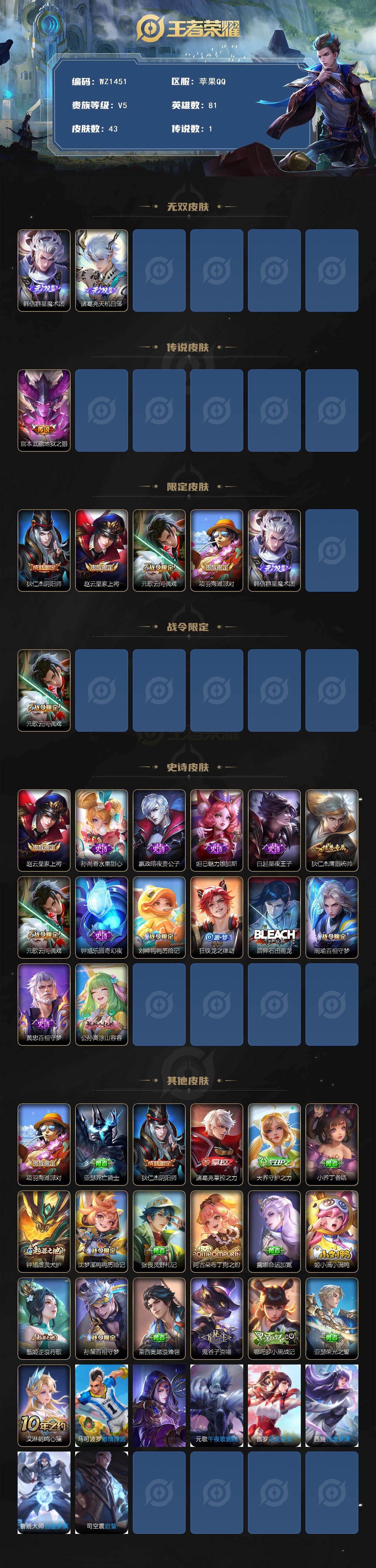 【秒换绑】苹果Q-V3-最强王者段位-81英雄-43皮肤-2无双-1传说-14史诗