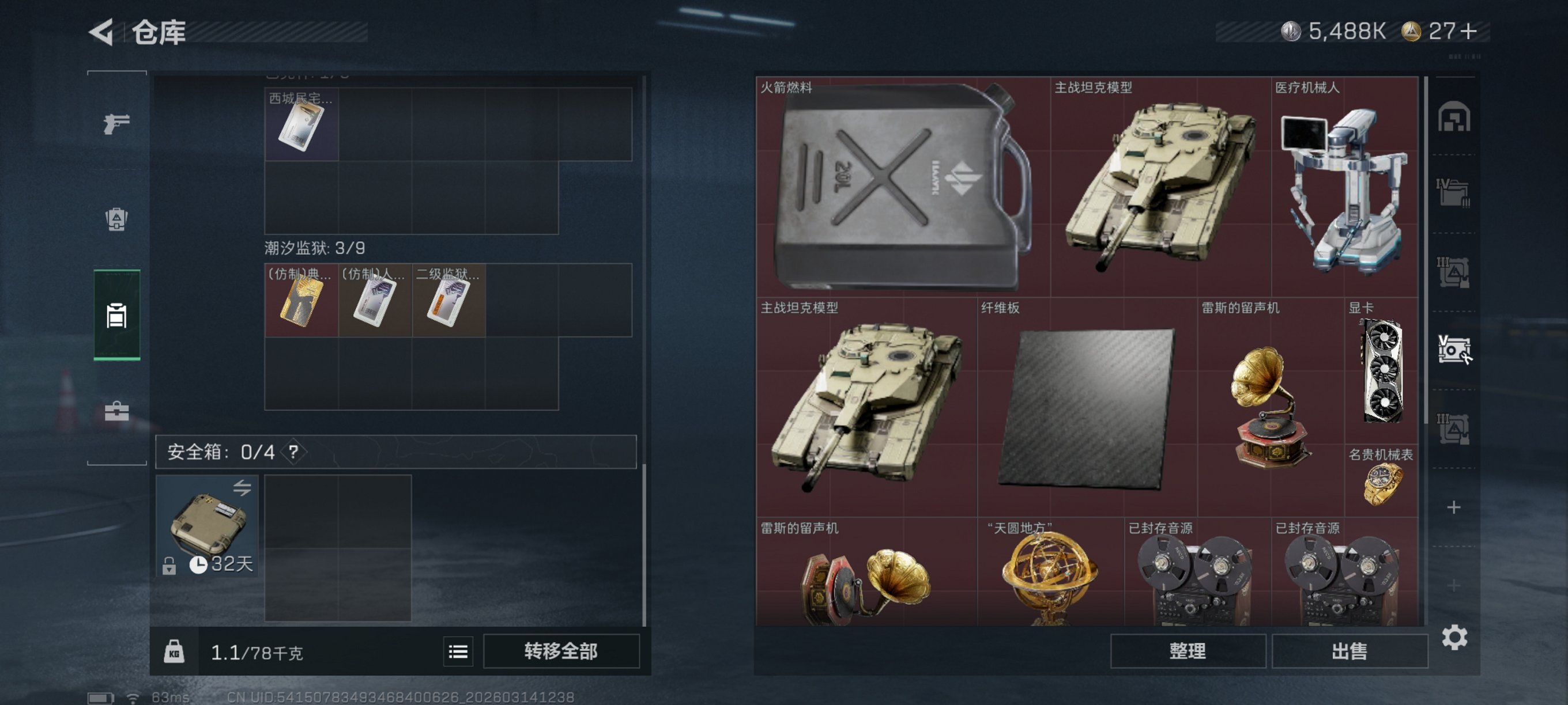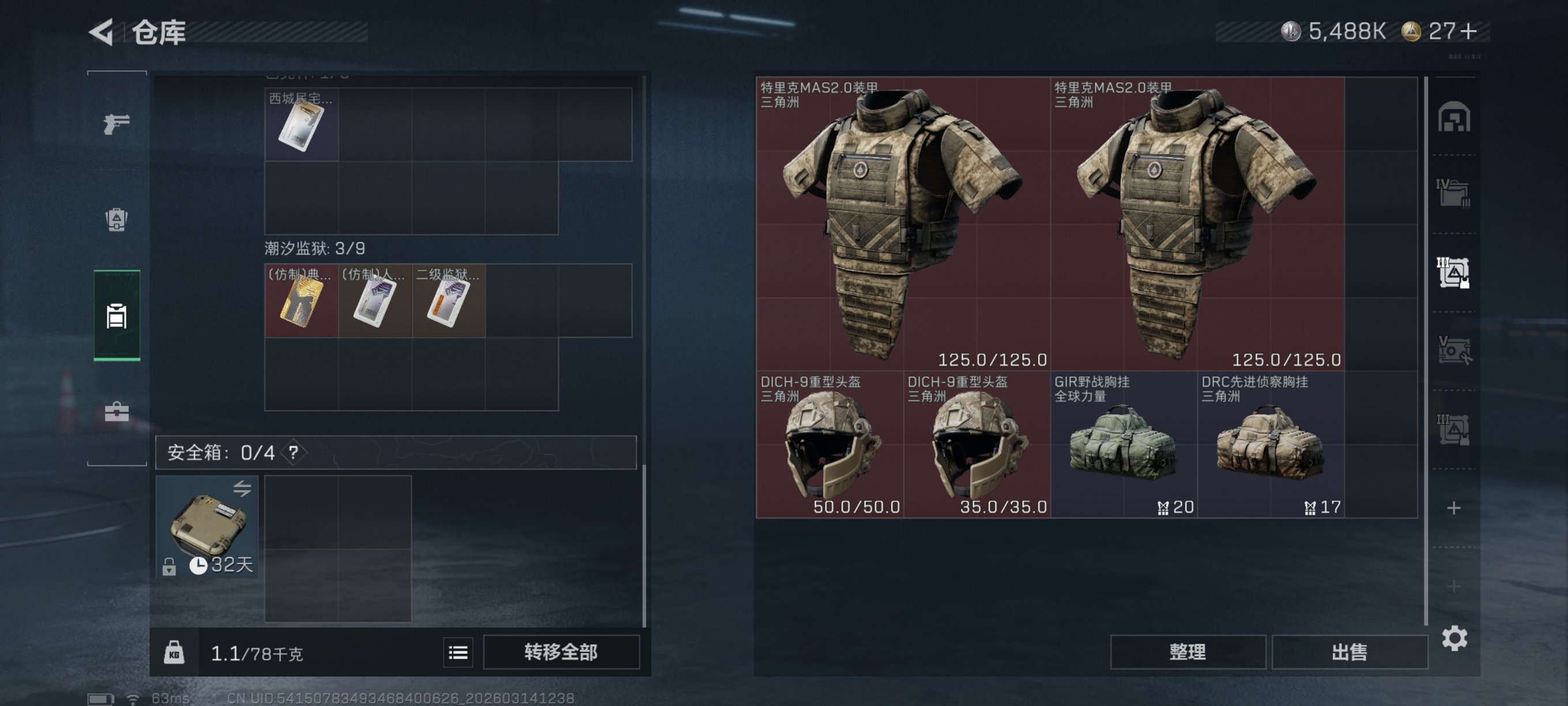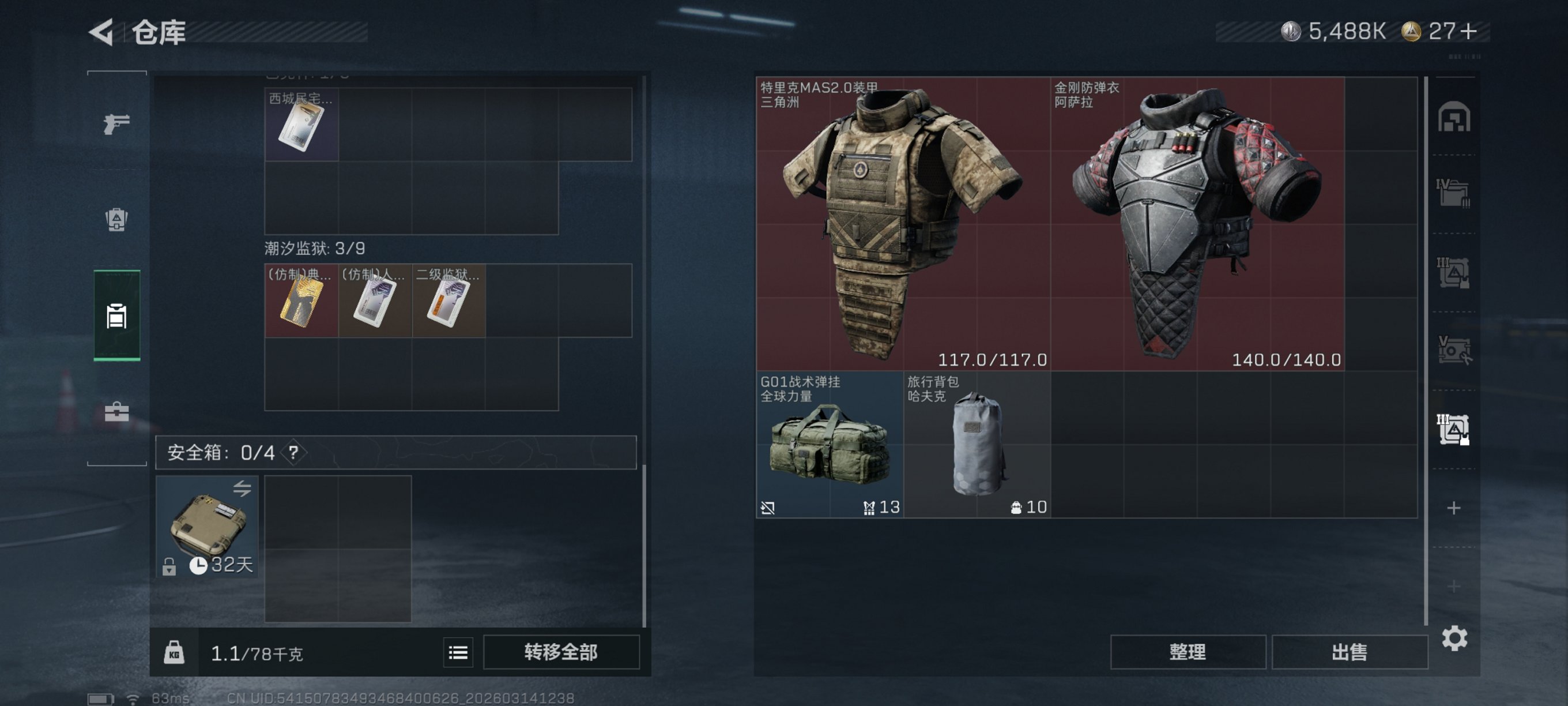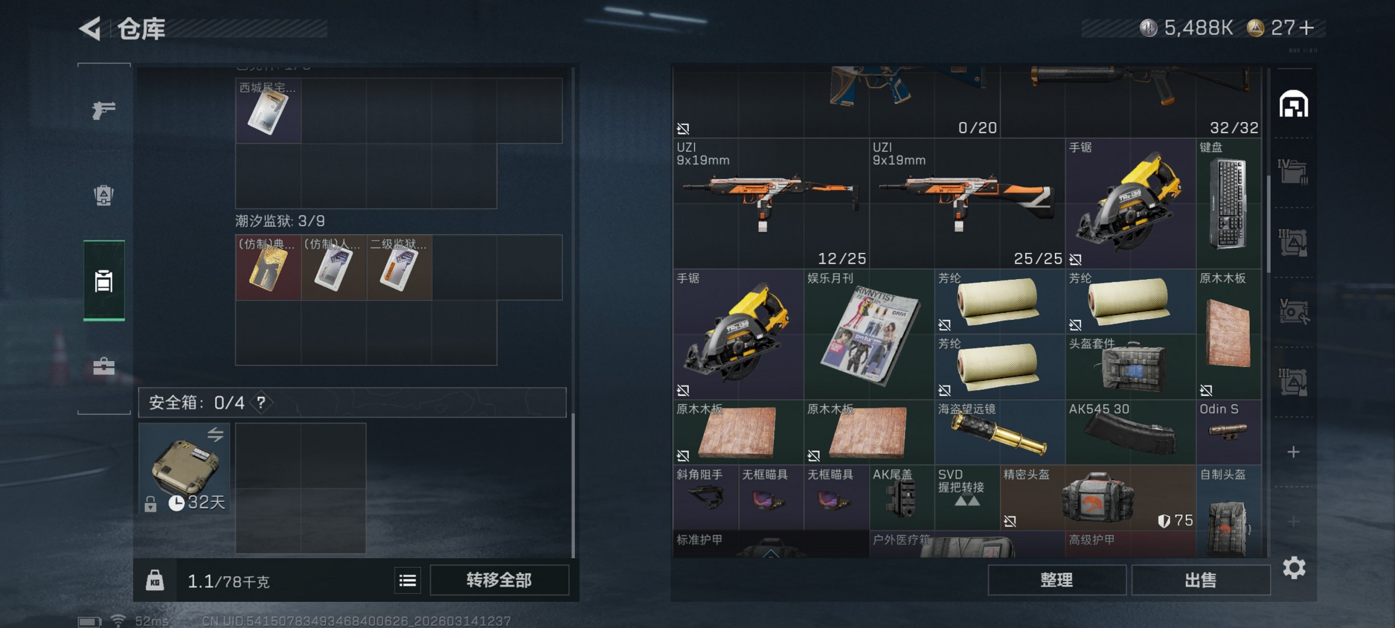 【电锯惊魂 总资产77M,哈夫币5,488K,行动等级:60,近战数量:1,仓