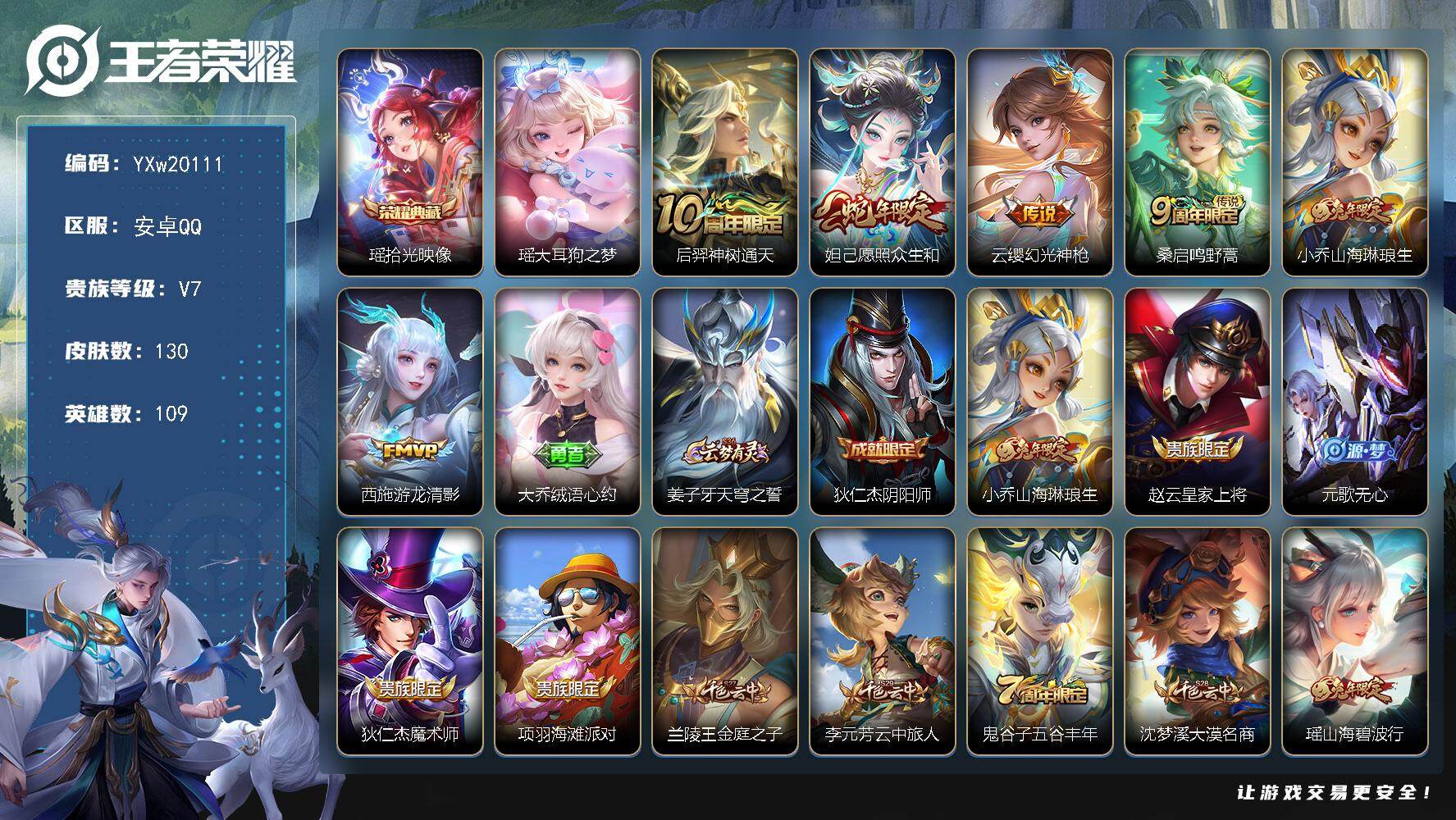 【精品女号·拾光映像·大耳狗之梦·愿照众生和·山海琳琅生·游龙清影·至美乘鲤谣·山海碧波行·财神纳福天幕·可二次】YXw20111-安卓Q-109英雄-130皮肤-0王者印记-72铭文-贵族积分2w【贵族7】【1典藏·1珍品·6传说·1天幕·8按键】【因赛季更新游戏段付以上号为准!】