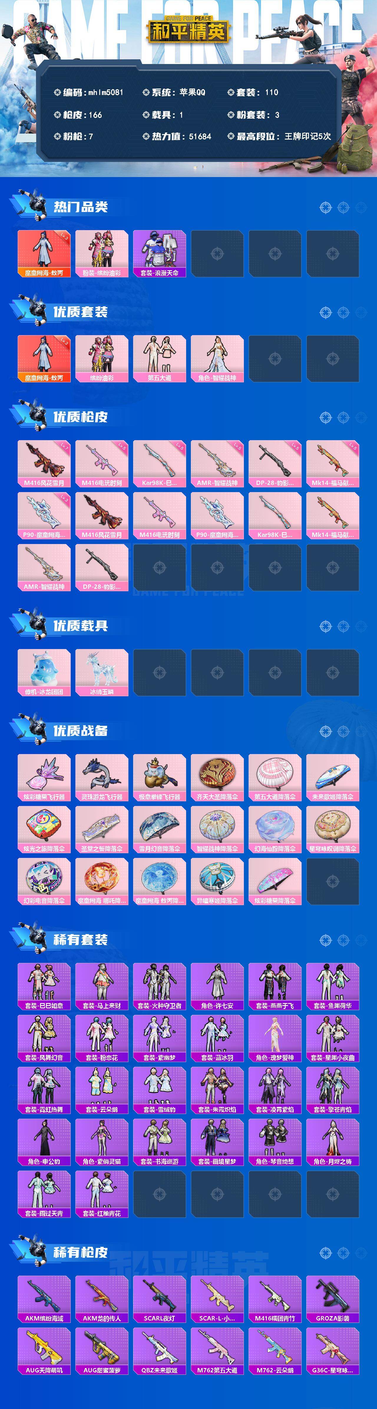 【mhlm5081】苹果 手Q-1神装-3粉装-7特效枪-1载具-3粉色飞行器-51684热力值-5王牌印记-110套装-166枪皮