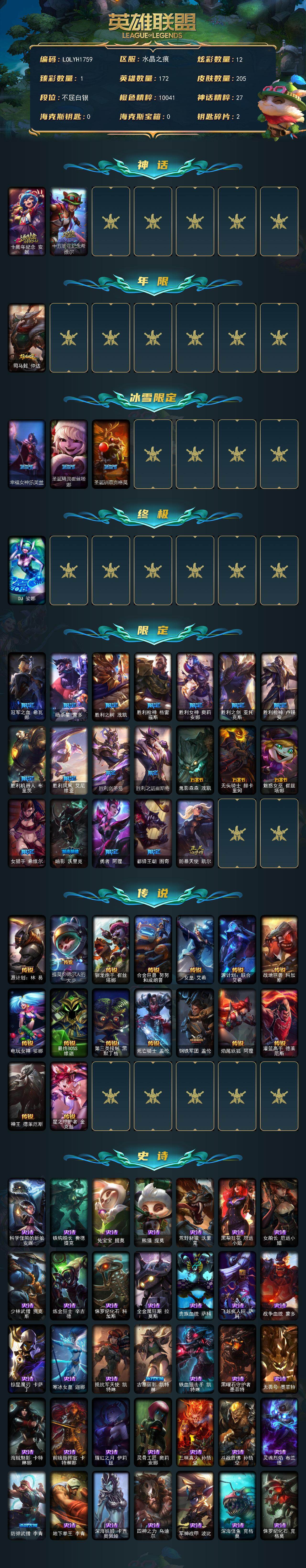 【LOLYH1759】172英雄/205皮肤/1终极/2神话/23限定/1臻彩/12炫彩/16传说/57史诗/白银/十周年纪念安妮/十五周年纪念希维尔/魔女阿卡丽虚荣/司马懿仲达/幸福女神乐芙兰/圣诞精灵崔丝塔娜/圣诞驯鹿克格莫/DJ娑娜/冠军之血希瓦娜/暗杀星蒙多/胜利之树茂凯/胜利枪神格雷福斯/胜利女神奥莉安娜/胜利之剑亚托克斯/胜利枪神卢锡安/胜利机器人布里茨/胜利凤凰艾尼维亚/胜利剑圣易/胜利之运崔斯特/鬼影森森茂凯/无头骑士赫卡里姆/魅惑女巫崔丝塔娜/女猎手希维尔/暗影沃里克/勇者阿狸