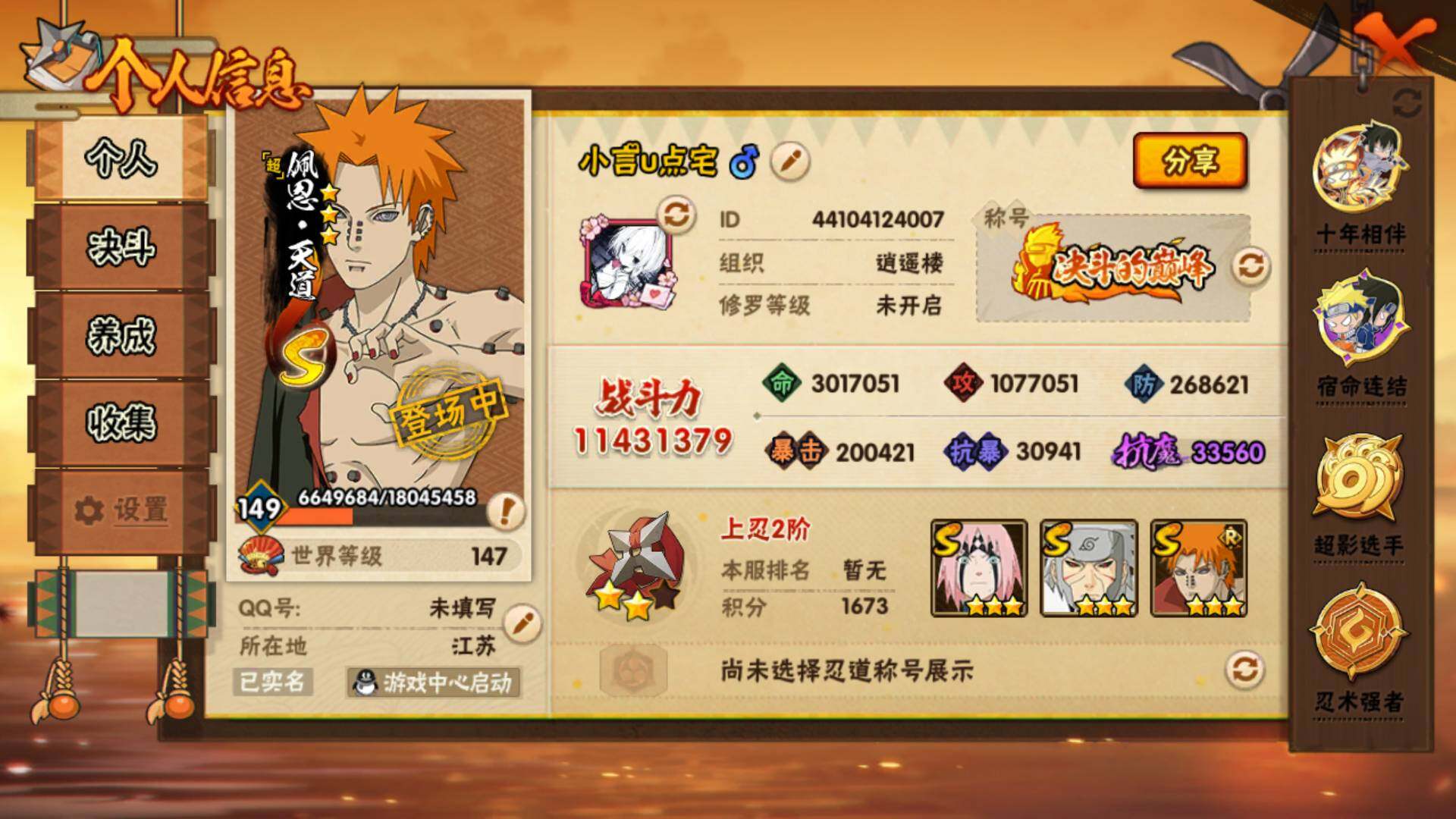 (可免费转苹果)V11,25S,43A,1143万战力,热门A疾风佐助,百豪樱,最终章雏田,忍战我爱罗,泳装小南,泳装照美冥,暴怒带土。S碎片传说自来也70片,日斩41片,大蛇丸78片,百豪纲手94,柱间44片,神驹斑60片,自来也67片,水门77片,二代水影44片,YY