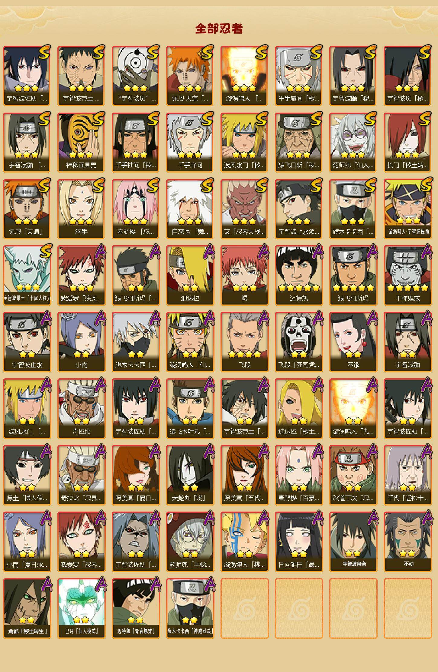 【S级忍者】:长门「秽土转生」(3星),猿飞日斩「秽土转生」(3星),波风水门「秽土转生」(3星),千手扉间「秽土转生」(3