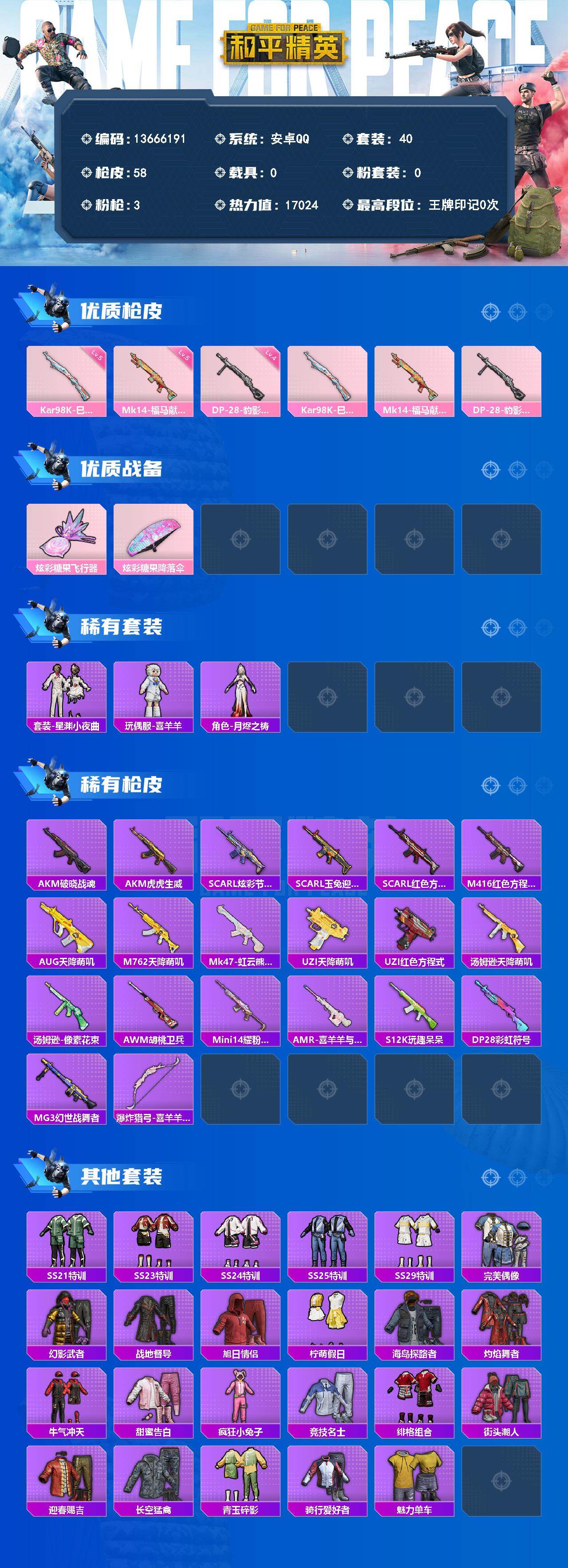 40套装/枪械3/装备80/战备30/热力值17024/五级Kar98K-巳巳如意/五级Mk14-福马献瑞/四级DP-28-豹影疾电/Kar98K-巳巳如意/Mk14-福马献瑞/DP-28-豹影疾电/炫彩糖果飞行器/炫彩糖果降落伞/套装-炫彩糖果/套装-星渊小夜曲/玩偶服-喜羊羊/角色-月烬之祷/AKM-破晓战魂/AKM-虎虎生威/SCAR-L-炫彩节奏/SCAR-L-玉兔迎春/SCAR-L-红