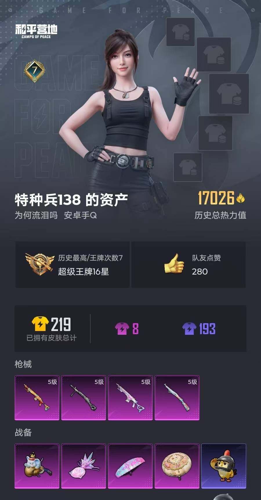 34套装/枪械4/装备78/战备41/王牌印记7/热力值17026/五级Kar