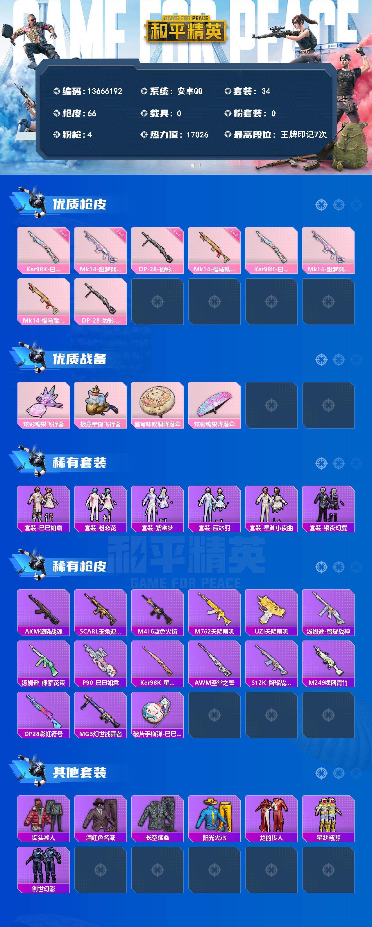 34套装/枪械4/装备78/战备41/王牌印记7/热力值17026/五级Kar98K-巳巳如意/五级Mk14-甜梦熊击/五级Mk14-福马献瑞/五级DP-28-豹影疾电/Kar98K-巳巳如意/Mk14-甜梦熊击/Mk14-福马献瑞/DP-28-豹影疾电/炫彩糖果飞行器/极意拳锋飞行器/星穹咏叹调降落伞/炫彩糖果降落伞/巳巳如意/套装-雪国风尚/套装-炫彩糖果/套装-粉恋花/套装-紫幽梦/套装-