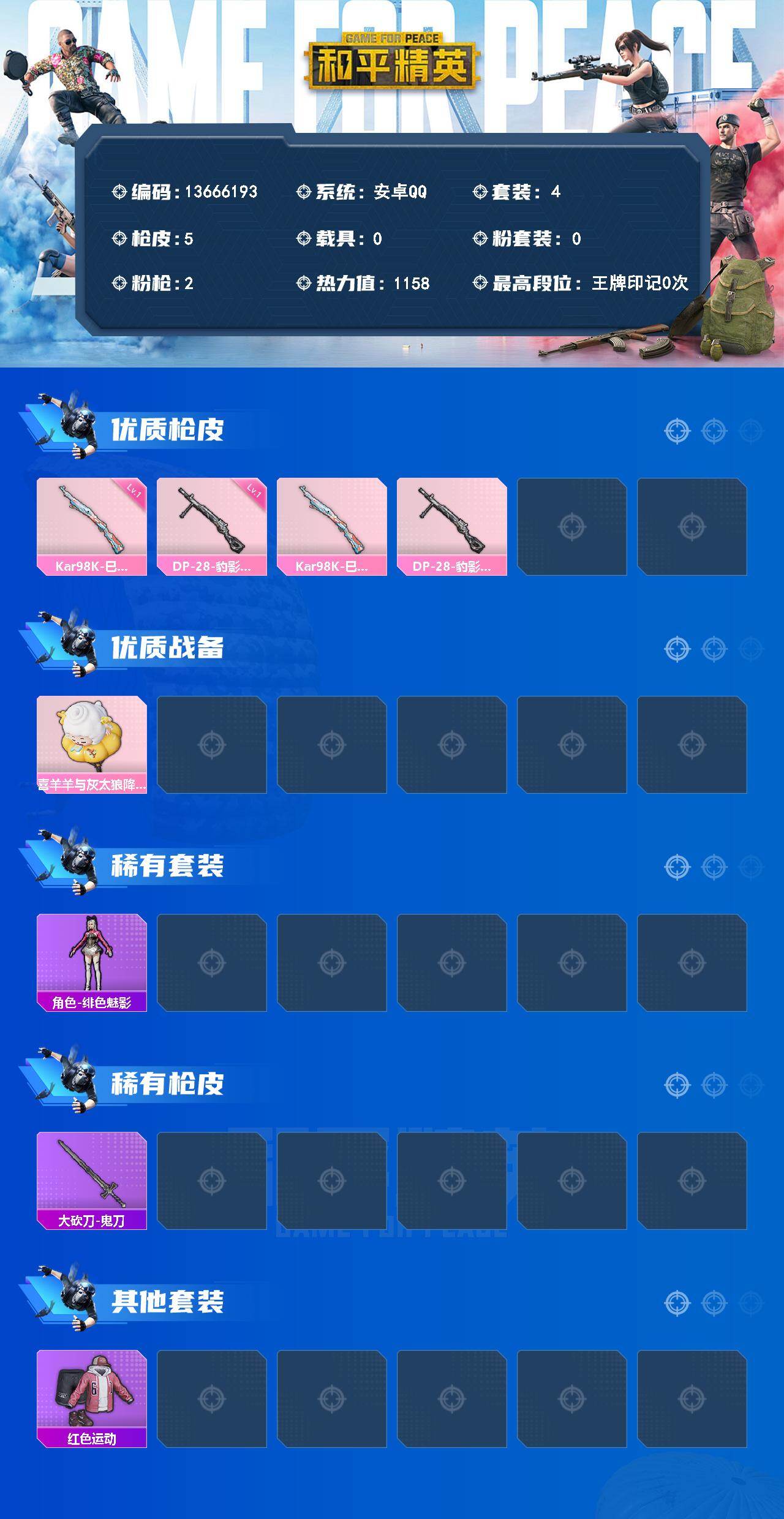 4套装/枪械2/装备10/战备12/热力值1158/一级Kar98K-巳巳如意/一级DP-28-豹影疾电/Kar98K-巳巳如意/DP-28-豹影疾电/喜羊羊与灰太狼降落伞/角色-绯色魅影/大砍刀-鬼刀/红色运动