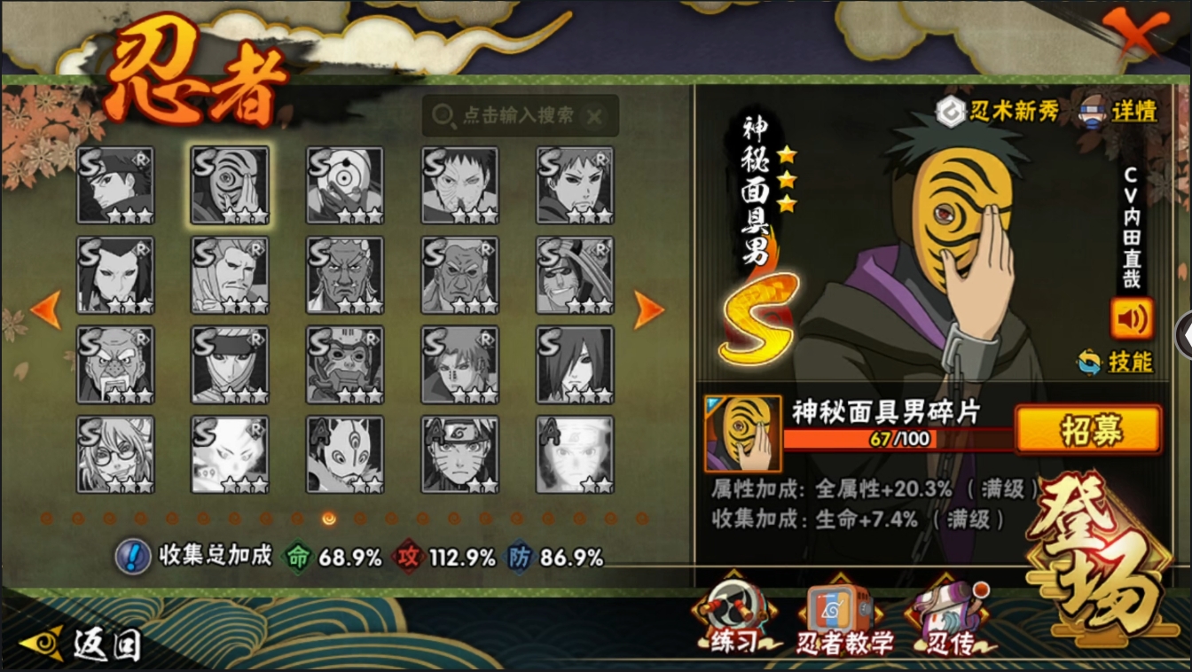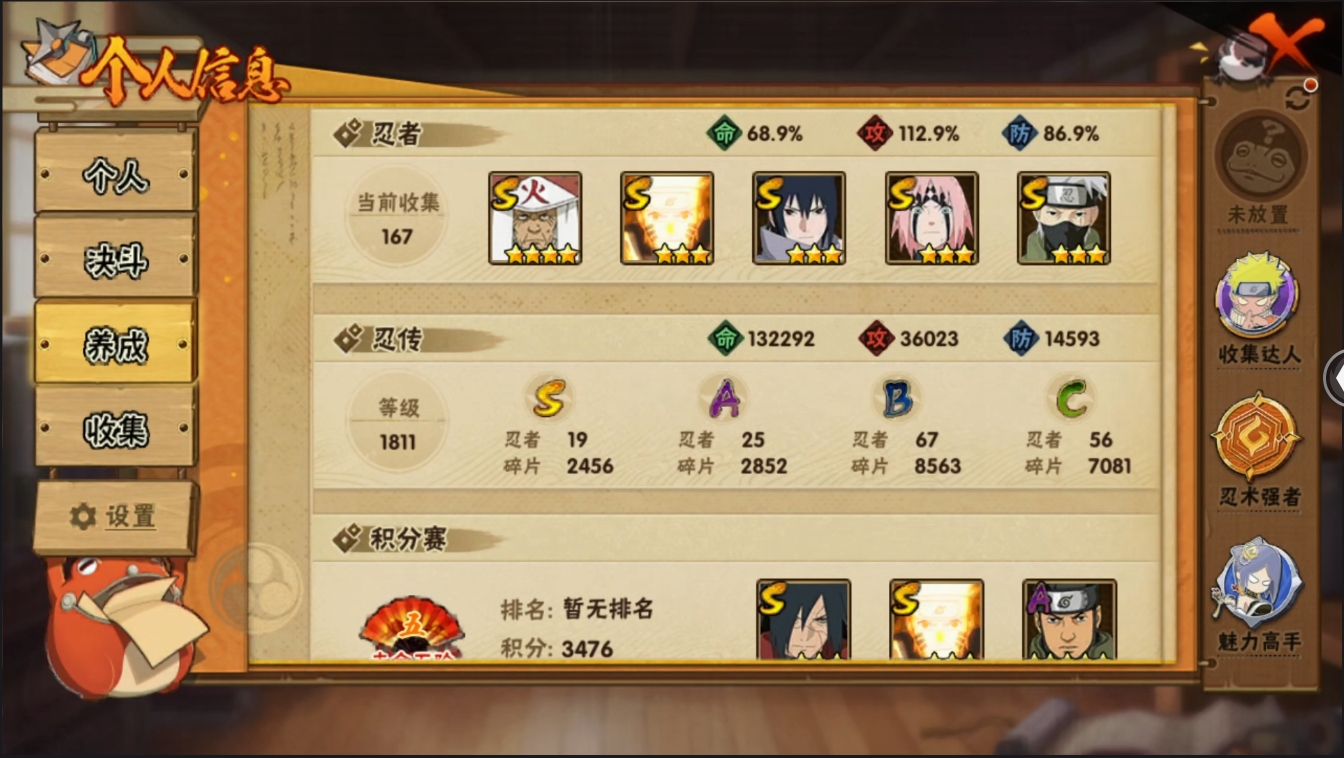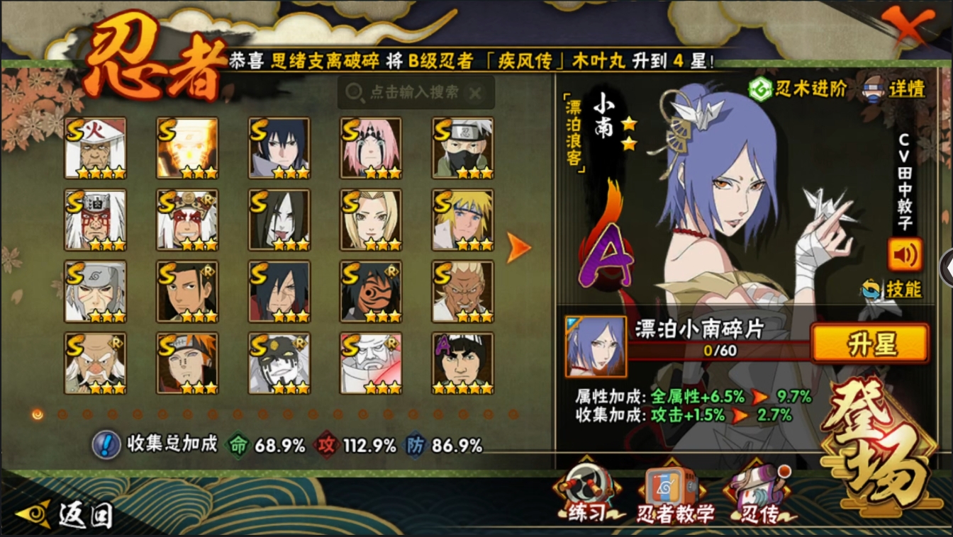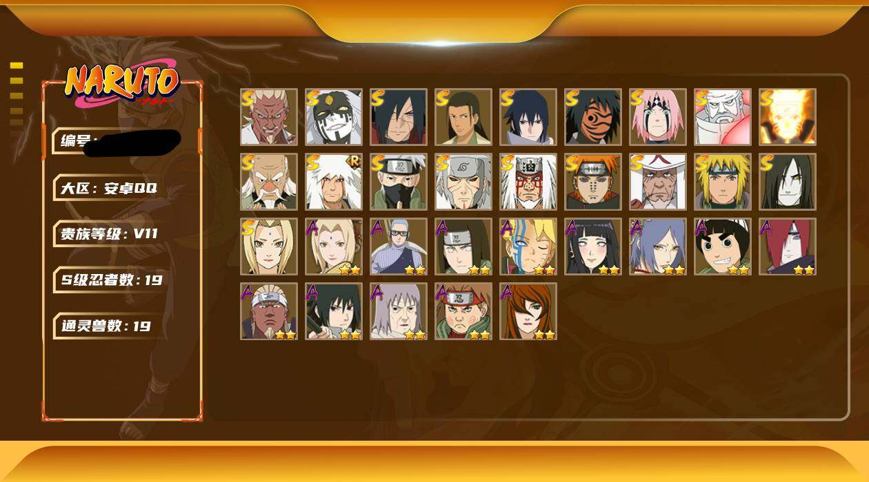 【编号96932可秒换绑】店长推荐特价处理精品号19S级忍者数-26A级忍者数【S级忍者】:千手扉间「秽土转生」(3星),宇智波斑「秽土转生·解」(3星),大野木「忍界大战」(3星),春野樱「忍界大战」(3星),艾「忍界大战」(3星),旗木卡卡西「须佐能乎」(3星),千手柱间「木叶创立」(3星),自来也「仙人模式」(3星),自来也「舞之豪杰」(3星),大蛇丸(3星),纲手(3星),猿飞日斩(4星),波风水门(3星),神秘面具男「红夜之刃」(3星),漩涡鸣人「九喇嘛连结」(3星),佩恩「天道」(3