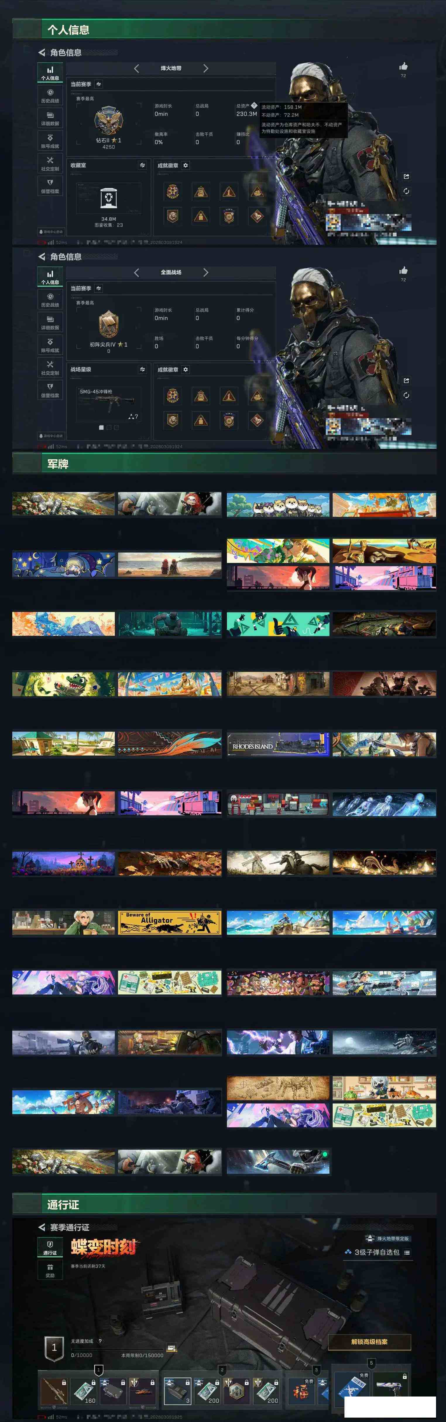 【sjs5589】总资产230m 红狼 露娜 信条 黑海 训练中心7 靶场 7 sjs5589 烽火地带段位: 钻石 全面战场段位: 上等兵 总资产: 230000000 哈夫币: 2922000 干员外观: 红狼-蚀金玫瑰,无名-夜鹰(S4),蜂医-送葬人·无题密令(S5),露娜-黑·天际线,深蓝-不破誓约(S6),红狼-电锯惊魂 传说武器皮肤: M4A1突击步枪-蚀金玫瑰,QJB201轻机枪-黑海,MP5冲锋枪-黑海,近战-黑海,AK-12突击步枪-夜鹰,SMG45冲锋枪-骑士,725双管