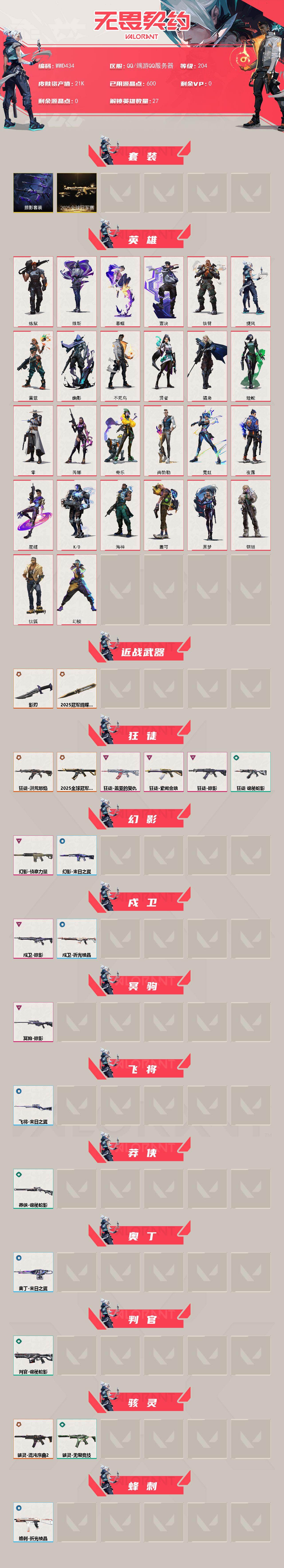 【WWD434】终极*5/卓越*8/皮肤*33/等级*204/段位:未定级/2025全球冠军赛套装/掠影套装/幻棱/炼狱/维斯/暮蝶/钛狐/壹决/铁臂/捷风/雷兹/幽影/不死鸟/贤者/猎枭/蝰蛇/零/芮娜/奇乐/尚勃勒/霓虹/夜露/星礈/K/O/海神/盖可/黑梦/钢锁/近战武器-2025全球冠军赛 蝴蝶刀/近战武器-影刃/狂徒-2025全球冠军赛/狂徒-洪荒怒焰/狂徒-掠影/狂徒-盖亚的复仇/狂徒-紫阙金琅/狂徒-诡秘蛇影/幻影-侦察力量/幻影-末日之翼/戍卫-掠影/戍卫-折光棱晶/冥驹-掠影/