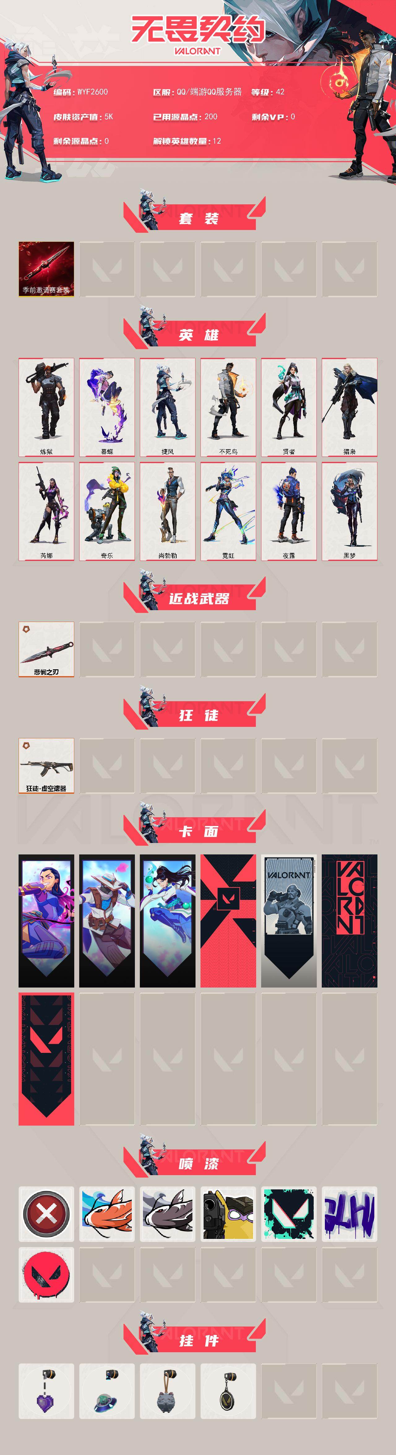 【WYF2600】终极*3/皮肤*14/等级*42/段位:铂金/无畏契约季前邀请赛套装/炼狱/暮蝶/捷风/不死鸟/贤者/猎枭/芮娜/奇乐/尚勃勒/霓虹/夜露/黑梦/近战武器-无畏契约季前邀请赛 悲悯之刃/狂徒-虚空遗器/无畏契约GO!第一卷:芮娜 卡面/无畏契约GO!第一卷:零 卡面/无畏契约GO!第一卷:贤者 卡面/代号红色 卡面/新兵报到 卡面/V契约 卡面/无畏契约 卡面/买装还是存钱 喷漆/红鳞 喷漆/松叶 喷漆/放下武器 喷漆/胜利属于无畏契约 喷漆/GLHF 喷漆/无畏契约 喷漆/薰