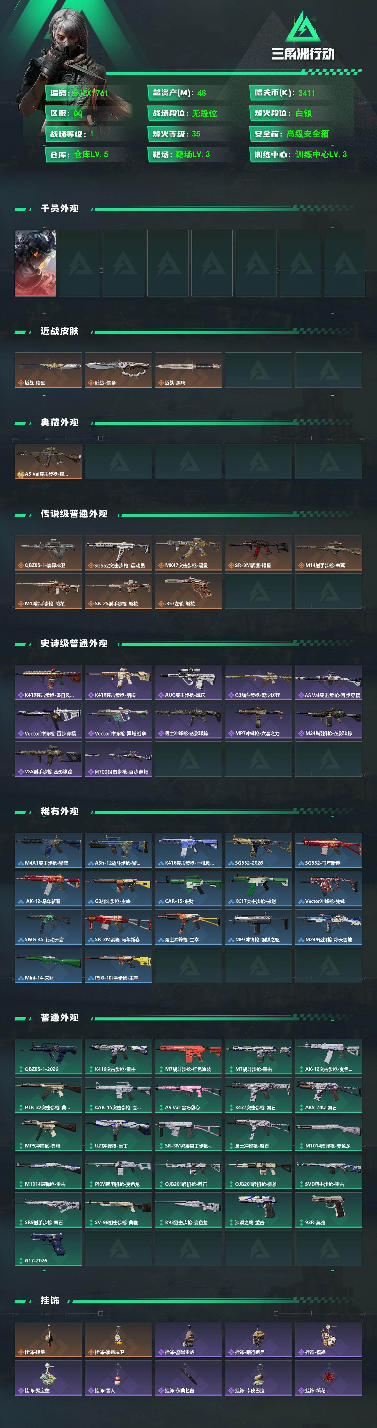【SJZX1761】总资产(M):48M/哈夫币(K):3411K/哈夫币(K):3411K/传说枪皮数:9/全面战场等级:1_段位:无段位/烽火地带等级:35_段位:白银/威龙-凌霄戍卫/近战-暗星/近战-信条/近战-黑鹰/AS Val突击步枪-悬赏令/AS Val突击步枪-悬赏令(优品A)/QBZ95-1突击步枪-凌霄戍卫/SG552突击步枪-运动员/MK47突击步枪-暗星/SR-3M紧凑突击步枪-暗星/M14射手步枪-蛮荒/M14射手步枪-缄花/SR-25射手步枪-缄花/.357左轮-缄花