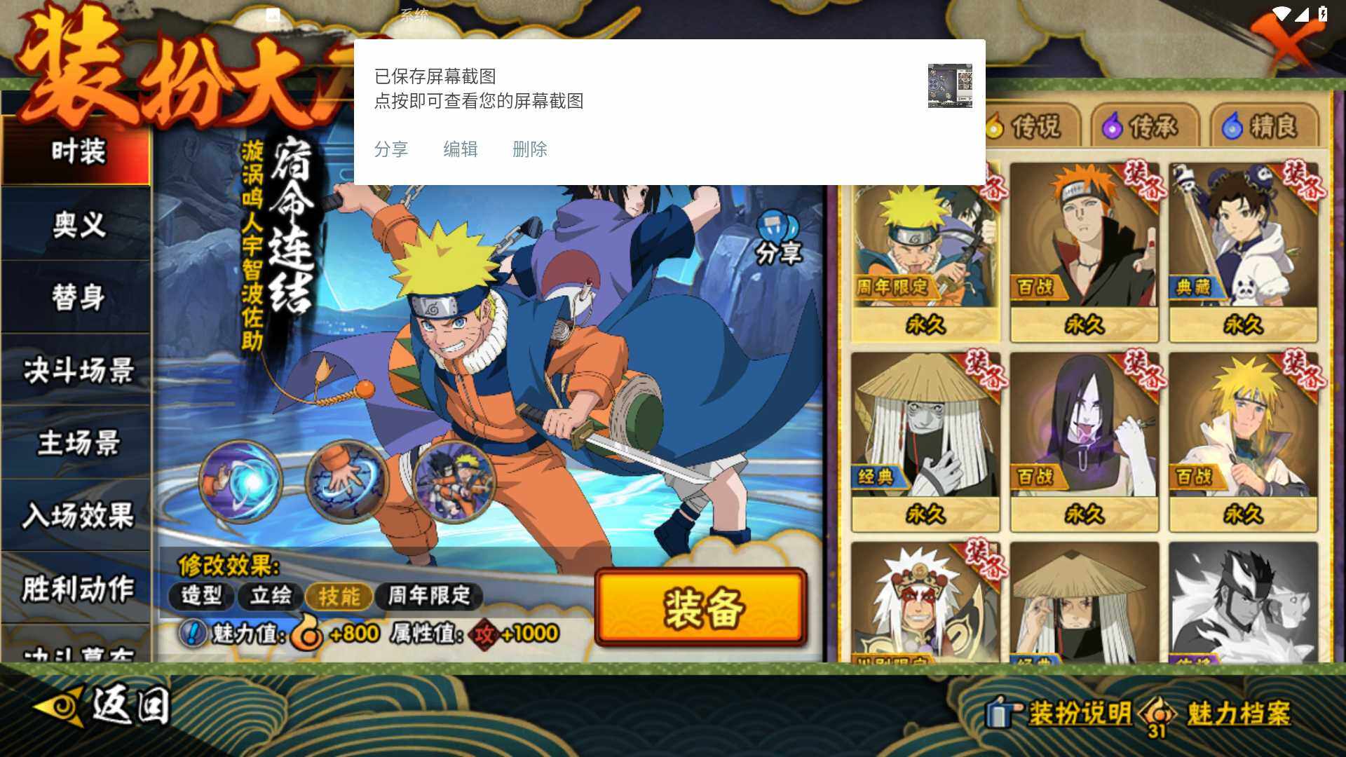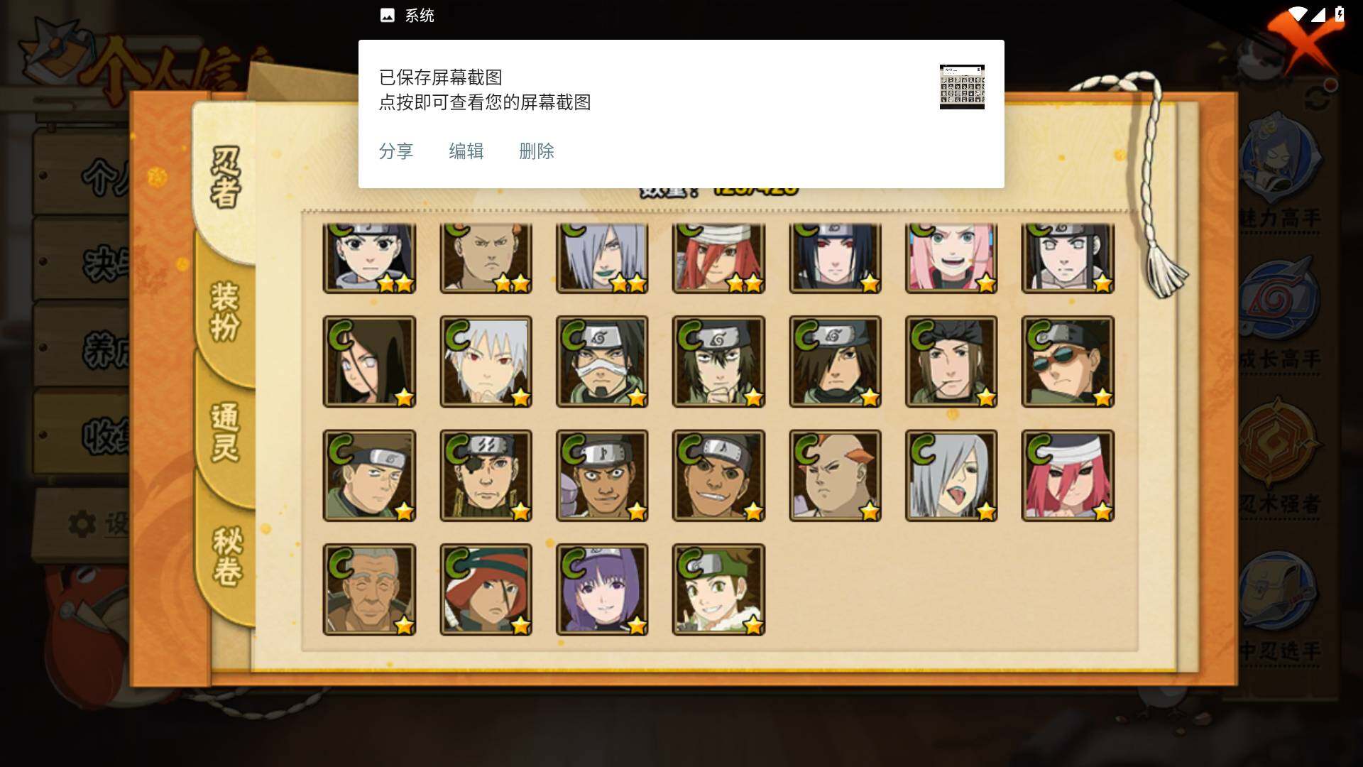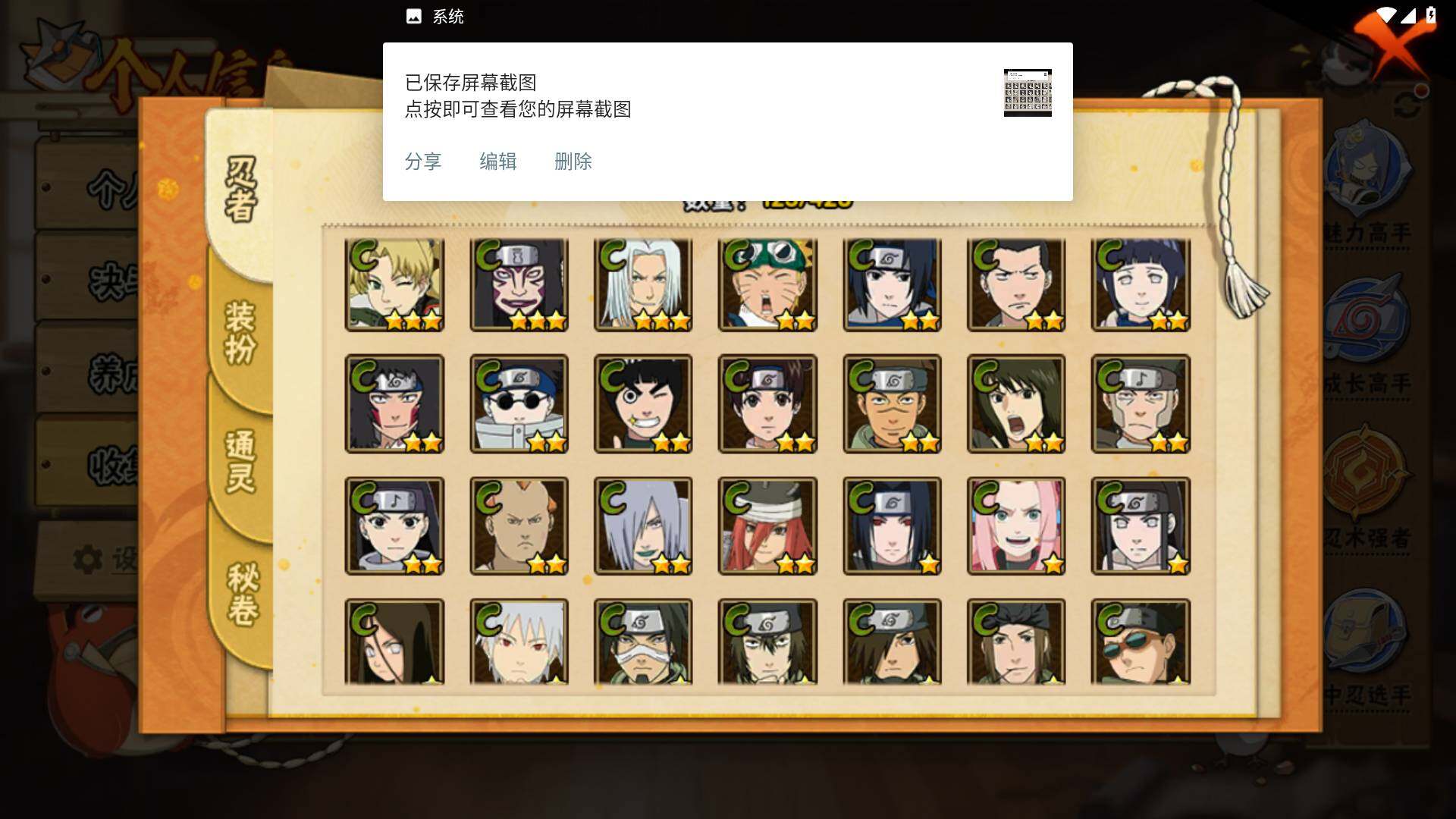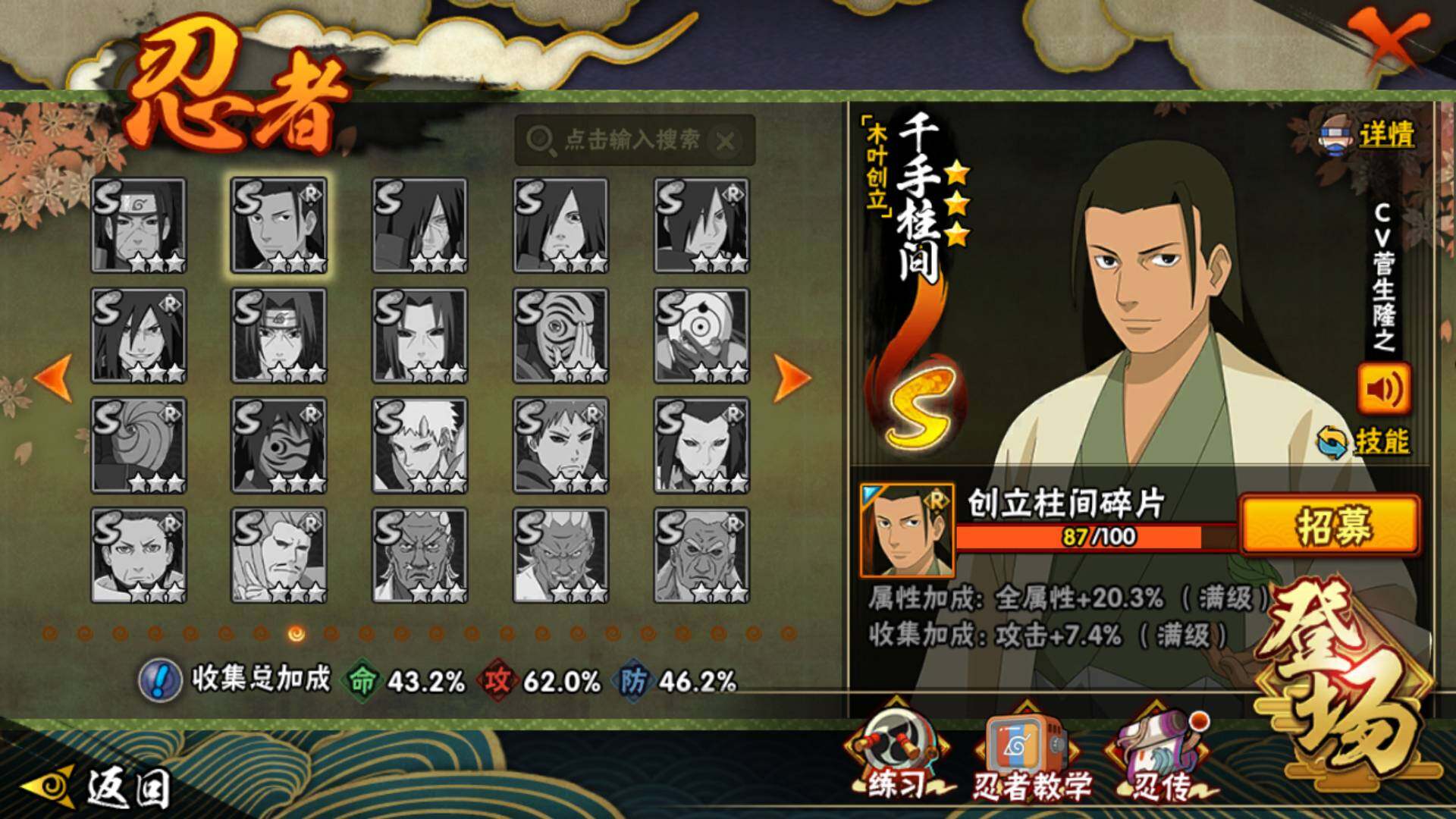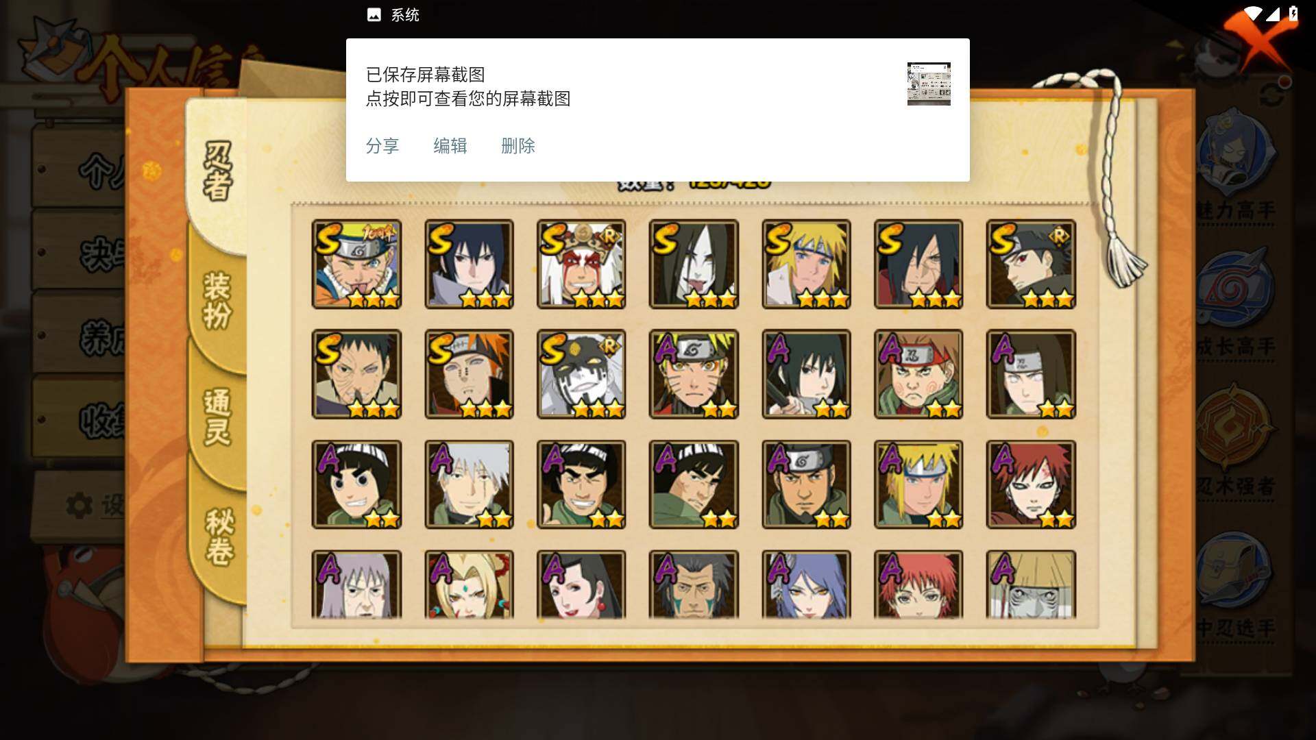 【S级忍者】:宇智波斑「秽土转生·解」(3星),宇智波带土「忍界大战」(3星),宇智波止水「须佐能乎」(3星),自来也「舞之豪杰」(3星),大蛇丸(3星),波风水门(3星),佩恩「天道」(3星),宇智波佐助「永恒万花筒」(3星),大筒木桃式(3星),漩涡鸣人·宇智波佐助(3星)
