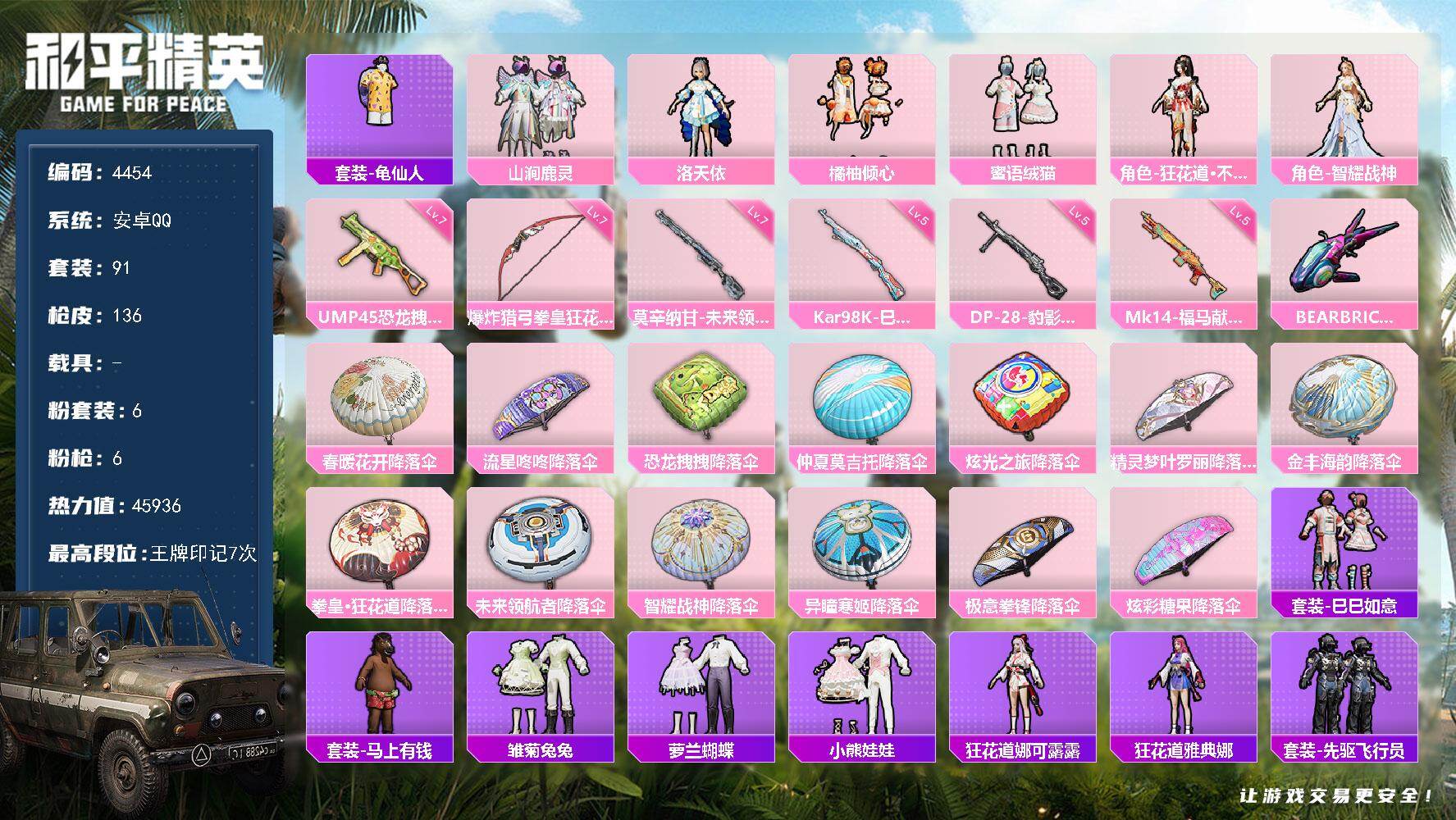 安卓 手Q-6粉装-6特效枪-0载具-1粉色飞行器-45936热力值-7王牌印记-91套装-136枪皮