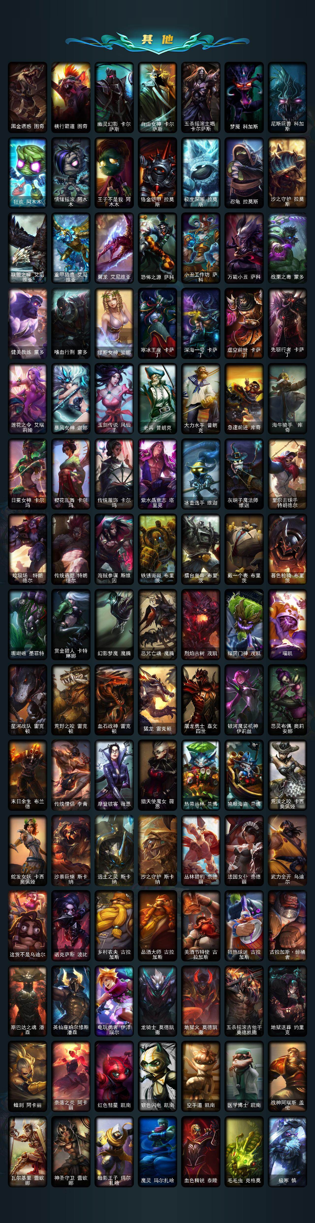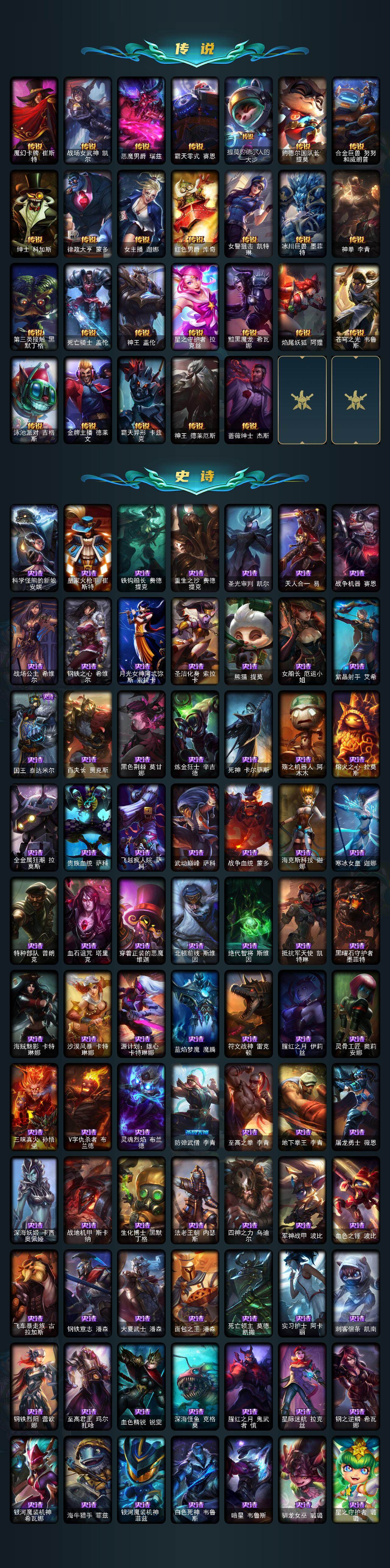 【冰雪限定】:幸福女神乐芙兰,圣诞开心鬼提莫,圣诞精灵崔丝塔娜,圣诞狂欢努努和威朗普,圣诞糖果棒厄运小姐,圣诞狂欢基兰,阿木木“主人不要我了”,胡桃夹子萨科,平安夜女神娑娜,英勇玩具兵普朗克,冬季仙境
