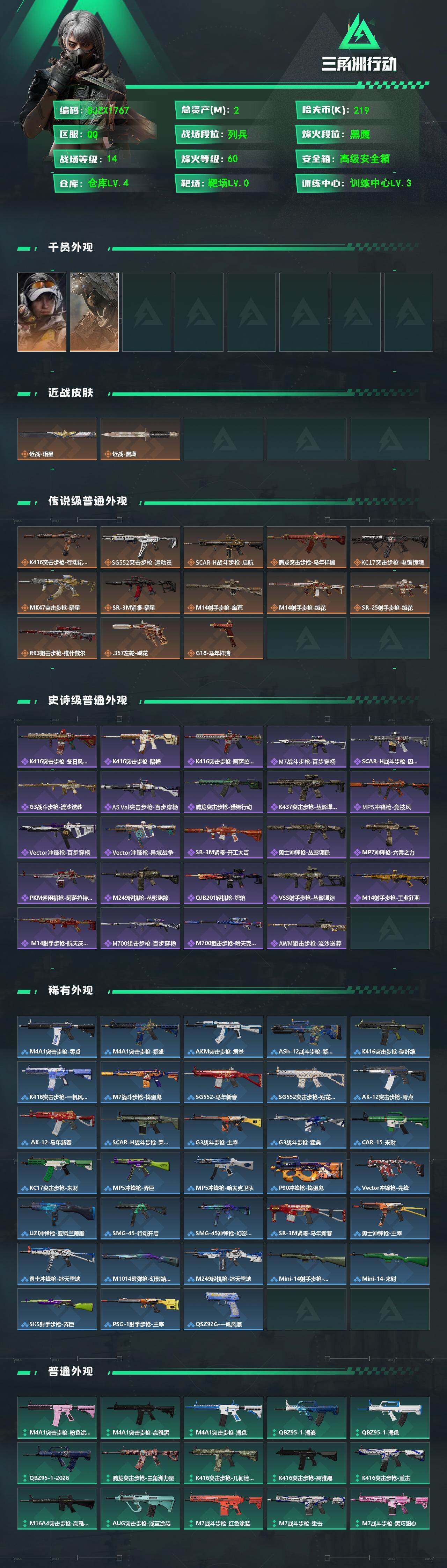 【SJZX1767】总资产(M):2M/哈夫币(K):219K/哈夫币(K):219K/传说枪皮数:13/全面战场等级:14_段位:列兵/烽火地带等级:60_段位:黑鹰/露娜-金牌射手/乌鲁鲁-荒原猎手/近战-暗星/近战-黑鹰/K416突击步枪-行动记录/SG552突击步枪-运动员/SCAR-H战斗步枪-启航/腾龙突击步枪-马年祥瑞/KC17突击步枪-电锯惊魂/MK47突击步枪-暗星/SR-3M紧凑突击步枪-暗星/M14射手步枪-蛮荒/M14射手步枪-缄花/SR-25射手步枪-缄花/R93狙击步