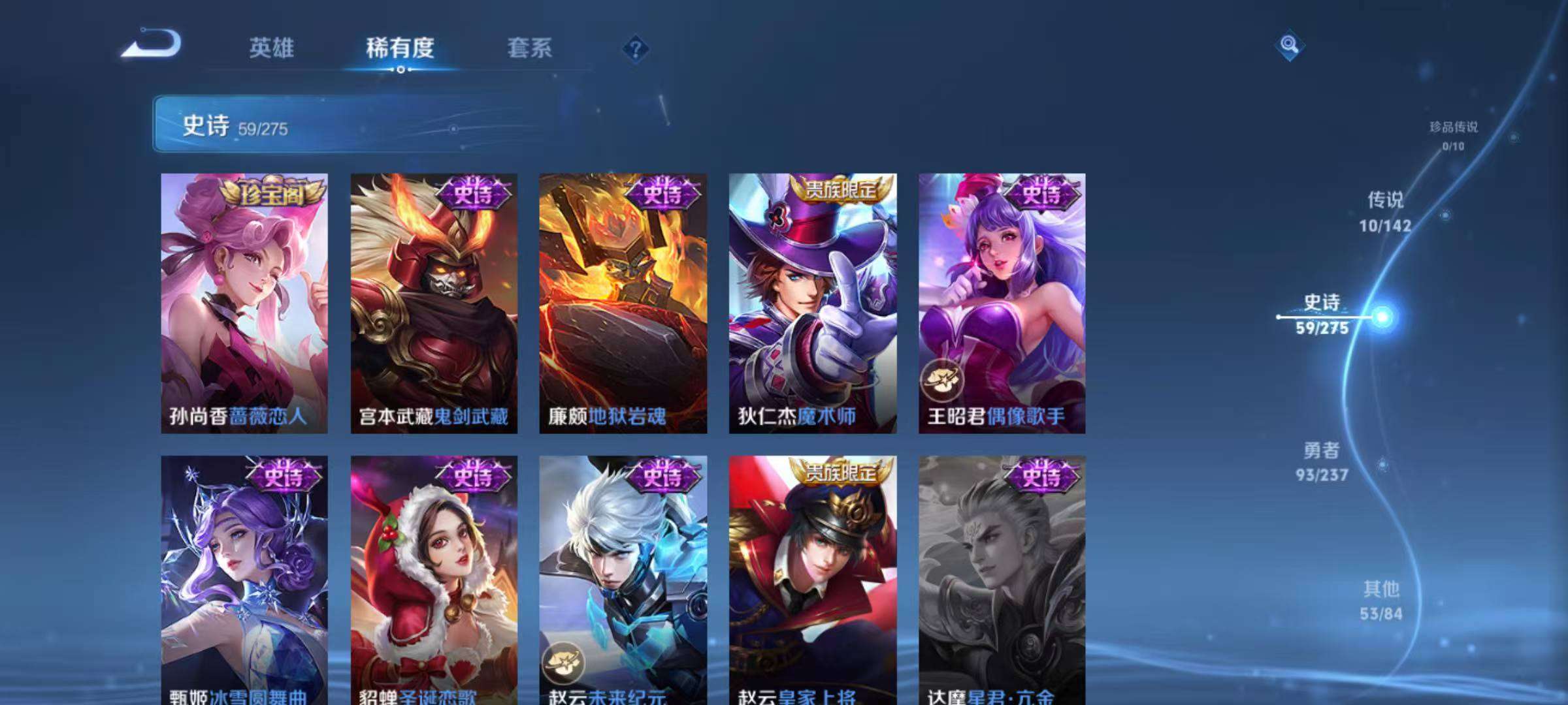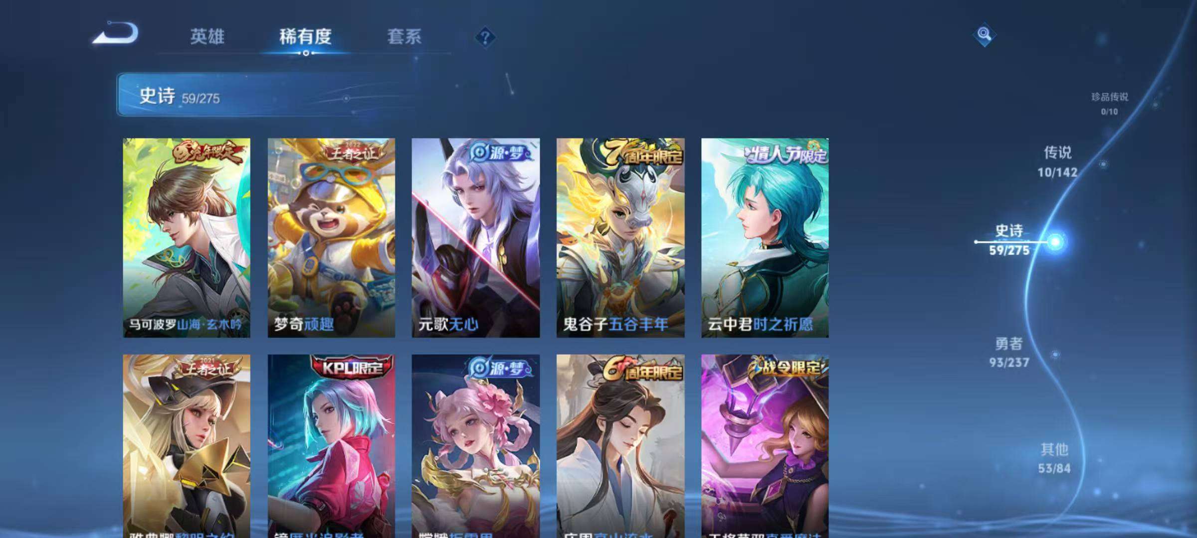 【史诗皮肤】 星界战将 默契交锋 青龙志 谧流熔炉 至尊宝 龙之律动 线条小狗 时之祈愿 山海·玄木吟 踏浪烽翎 聚星闪耀 江河有灵 百解令 荣光圣徽 万灵启世 奇幻香踪 顽趣 驭风魔法 魅语 幽灵船长 拒霜思 魅力维加斯 猫狗日记 魔术师 鹰眼统帅 圣诞恋歌 箭羽