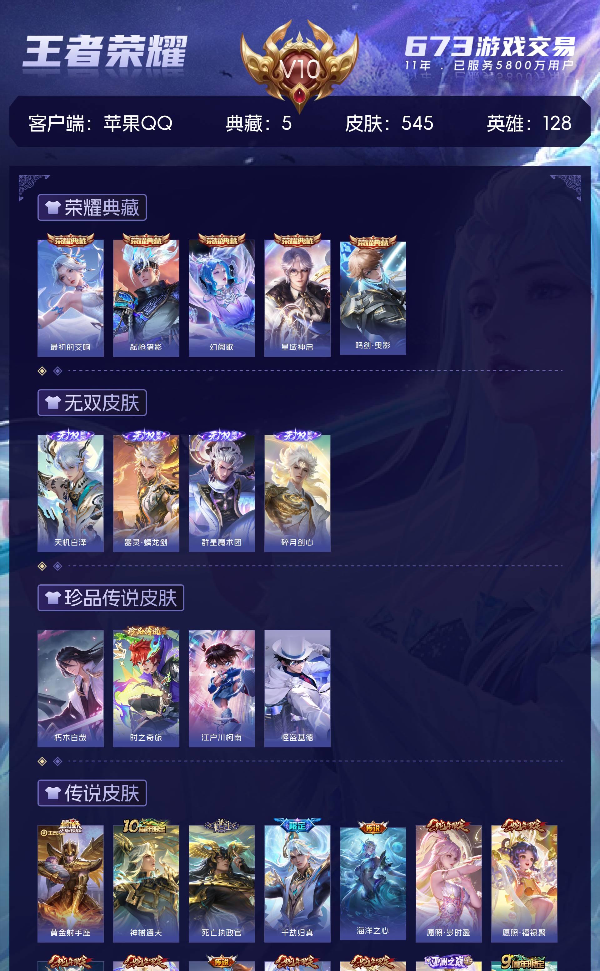 苹果QQ/永恒钻石/545皮肤/128英雄/5典藏/0珍品无双/4无双/4珍品传说/75传说/177