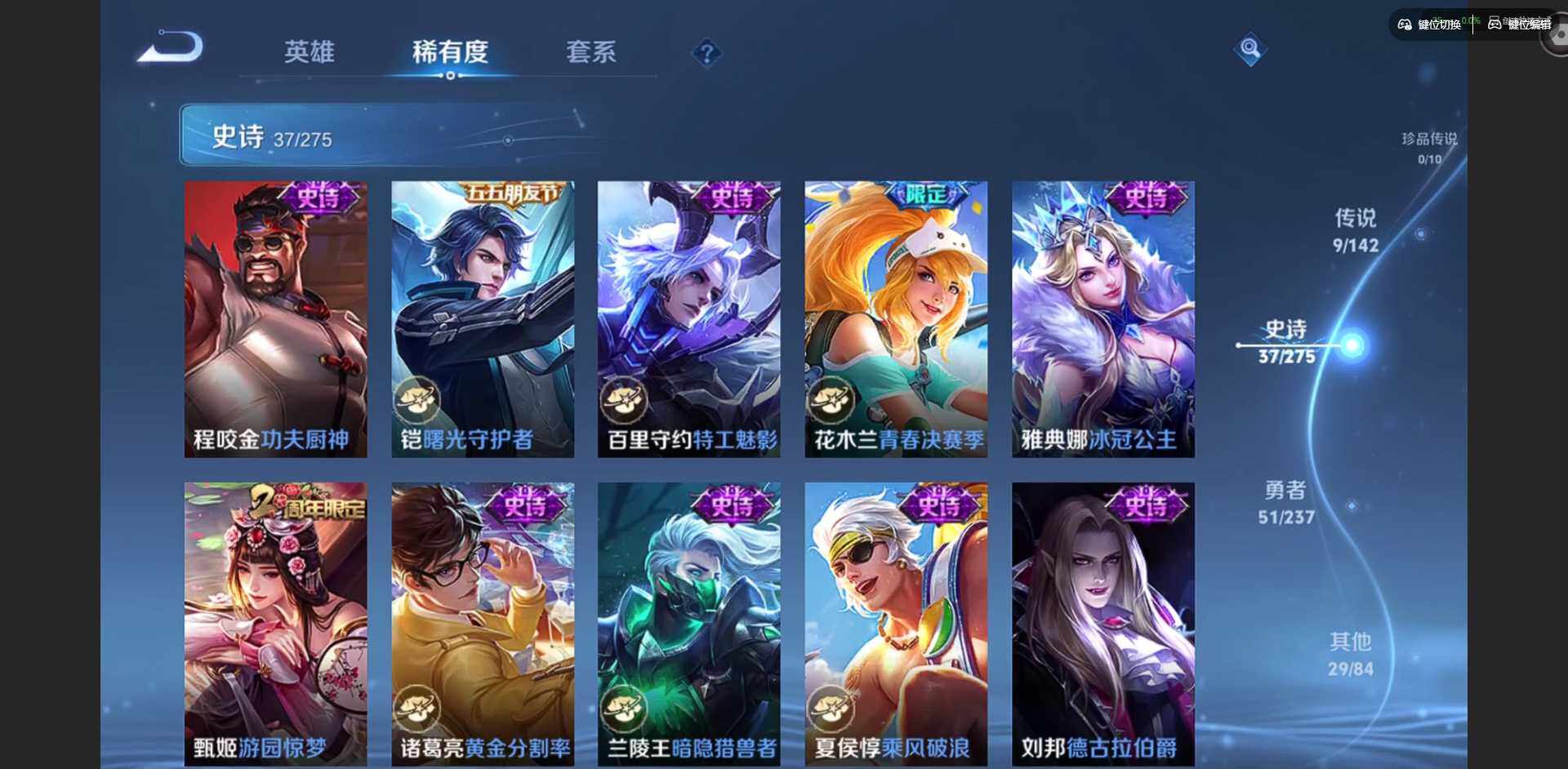 实名: 可修改 贵族等级: V7 英雄数: 118 皮肤数: 126 传说皮: