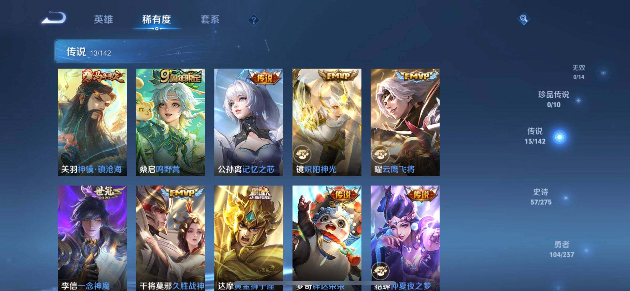 【传说皮肤】:关羽神骥镇沧海,桑启鸣野蒿,公孙离记忆之芯,镜炽阳神光,曜云鹰飞将,李信一念神魔,干将莫邪久胜战神,达摩黄金狮子座,梦奇胖达荣荣,貂蝉仲夏夜之梦,宫本武藏地狱之眼,孙悟空地狱火,狄仁杰超时空战士