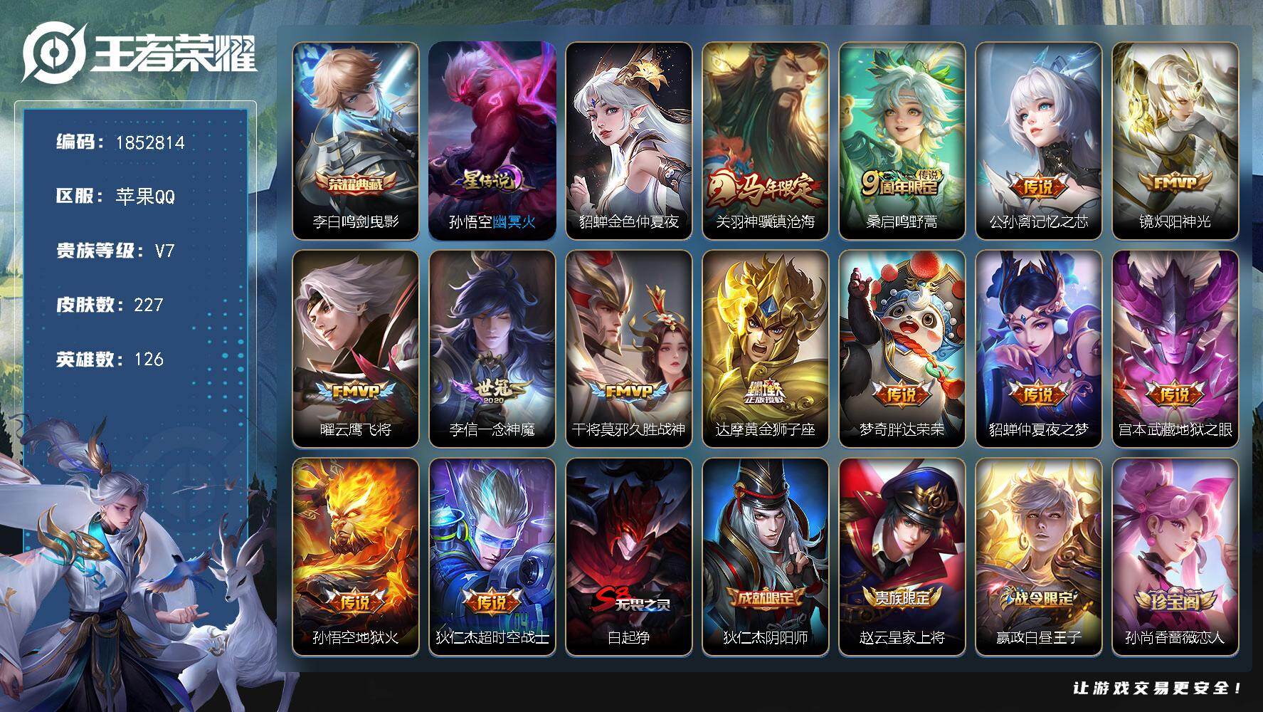 W15194,,可立即换绑无需挂单养号,,,铭文满级,,典藏1,,传说13,,星传说2,,按键3,,夺宝52,,,苹果Q-V7-最强王者段位-126英雄-227皮肤-1典藏皮肤-13传说-56史诗