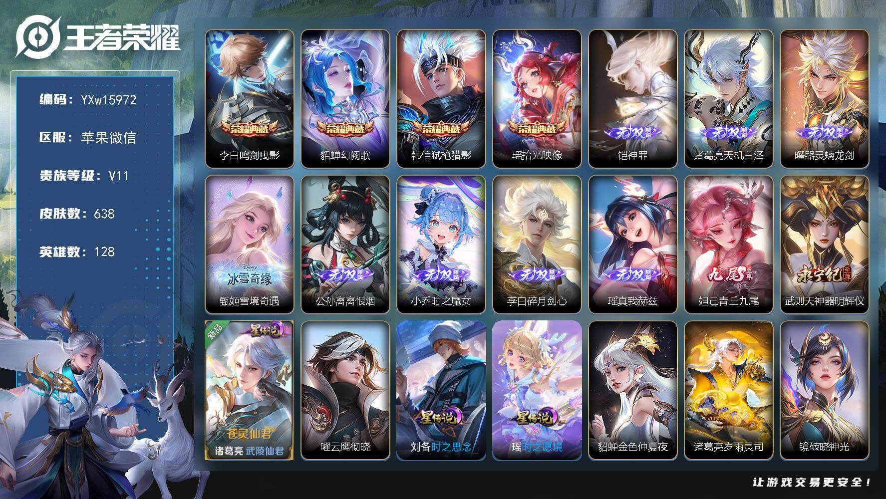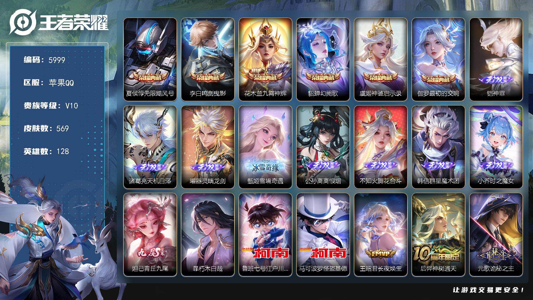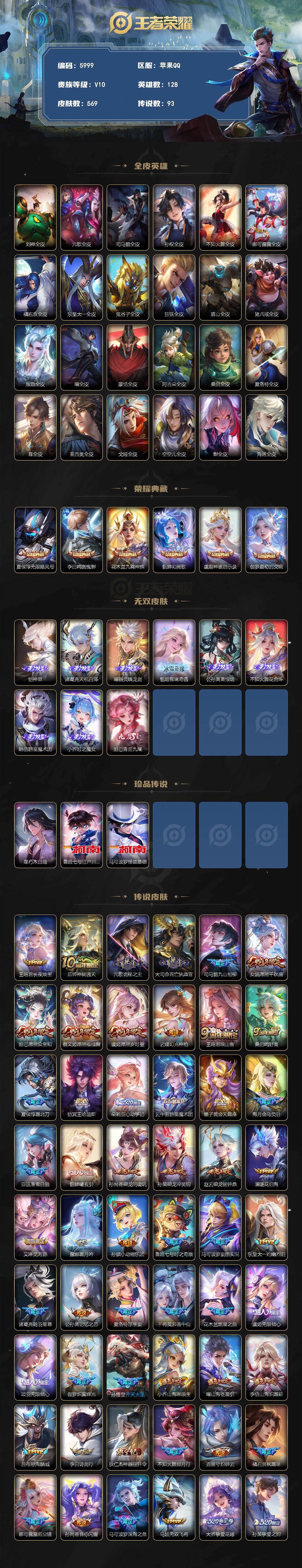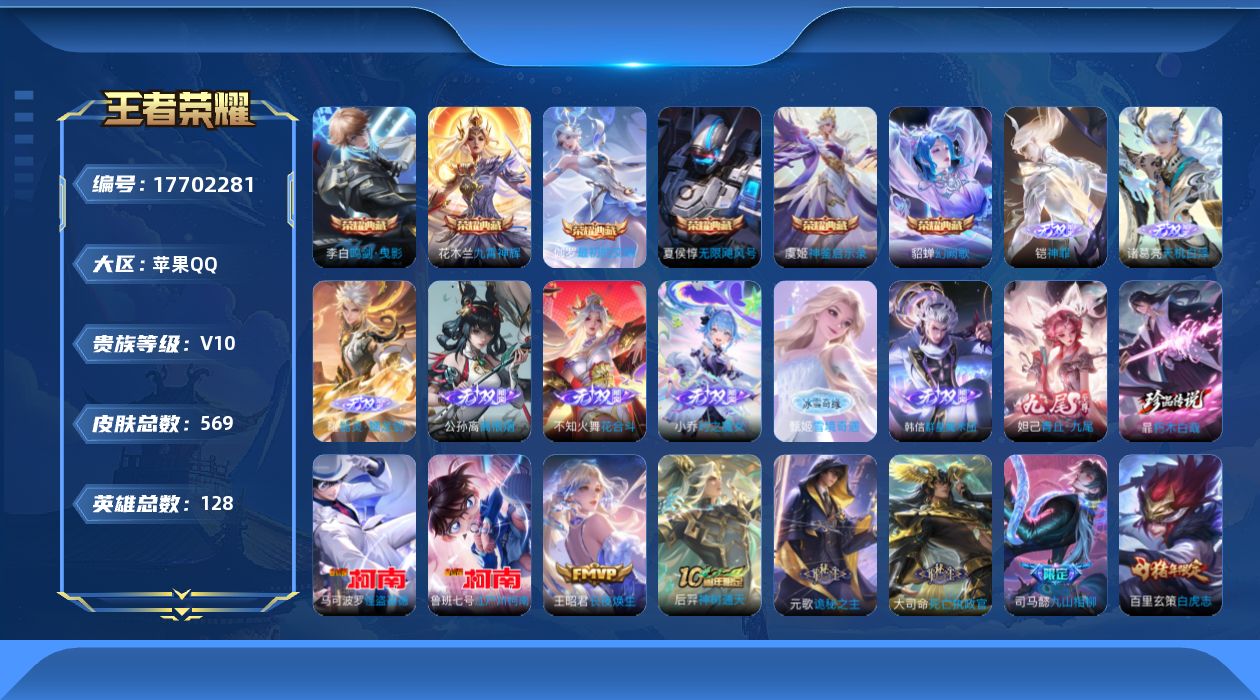 237-[17702281]贵族10-流光积分10921-贵族积分355867-569皮6典藏93传说9无双3珍品传说 皇冠号 无尽之约天幕 金虎啸春天幕 苹果手Q111区569皮6典藏93传说9无双3珍品传说V10 营地ID214650223至尊星耀V【珍品传说皮肤】:朽木白哉,江户川柯南,怪盗基德【无双皮肤】:神罪,天机白泽,器灵·螭龙剑,雪境奇遇,离恨烟,花合斗,群星魔术团,青丘·九尾,时之魔女【荣耀典藏】:最初的交响,神鉴启示录,幻阙歌,九霄神辉,鸣剑·曳影,无限飓风号【优质限定皮