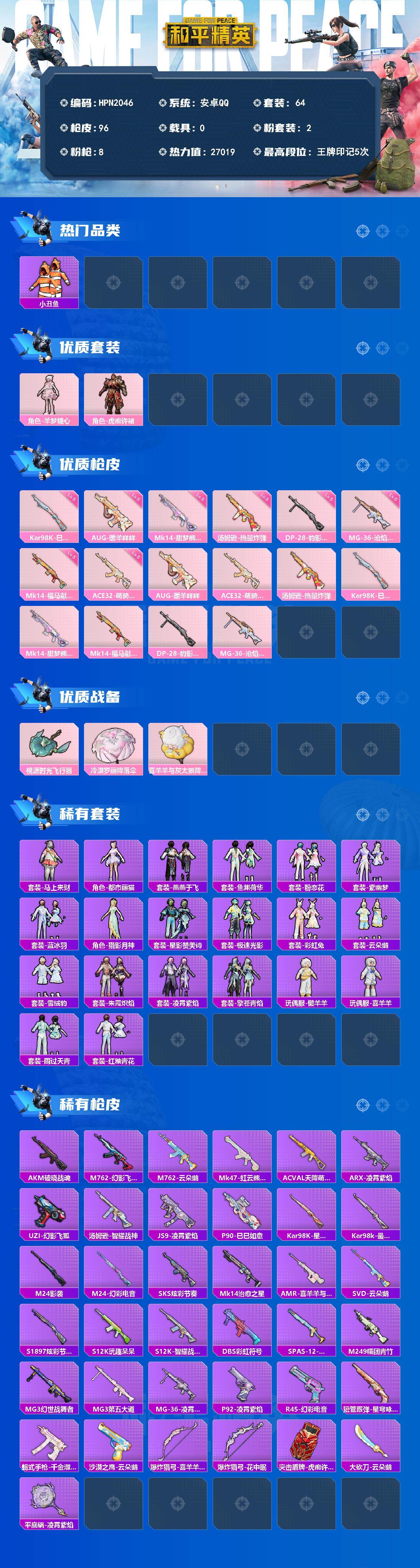 【HPN2046】64套装/枪械8/装备112/战备77/王牌印记5/热力值27019/五级AUG-暖羊咩咩/五级ACE32-萌骑漫游/五级汤姆逊-热量炸弹/五级Kar98K-巳巳如意/五级Mk14-甜梦熊击/五级Mk14-福马献瑞/五级DP-28-豹影疾电/五级MG-36-沧焰双生/小丑鱼/角色-羊梦糖心/角色-虎痴许褚/AUG-暖羊咩咩/ACE32-萌骑漫游/汤姆逊-热量炸弹/Kar98K-巳巳如意/Mk14-甜梦熊击/Mk14-福马献瑞/DP-28-豹影疾电/MG-36-沧焰双生/桃源时光