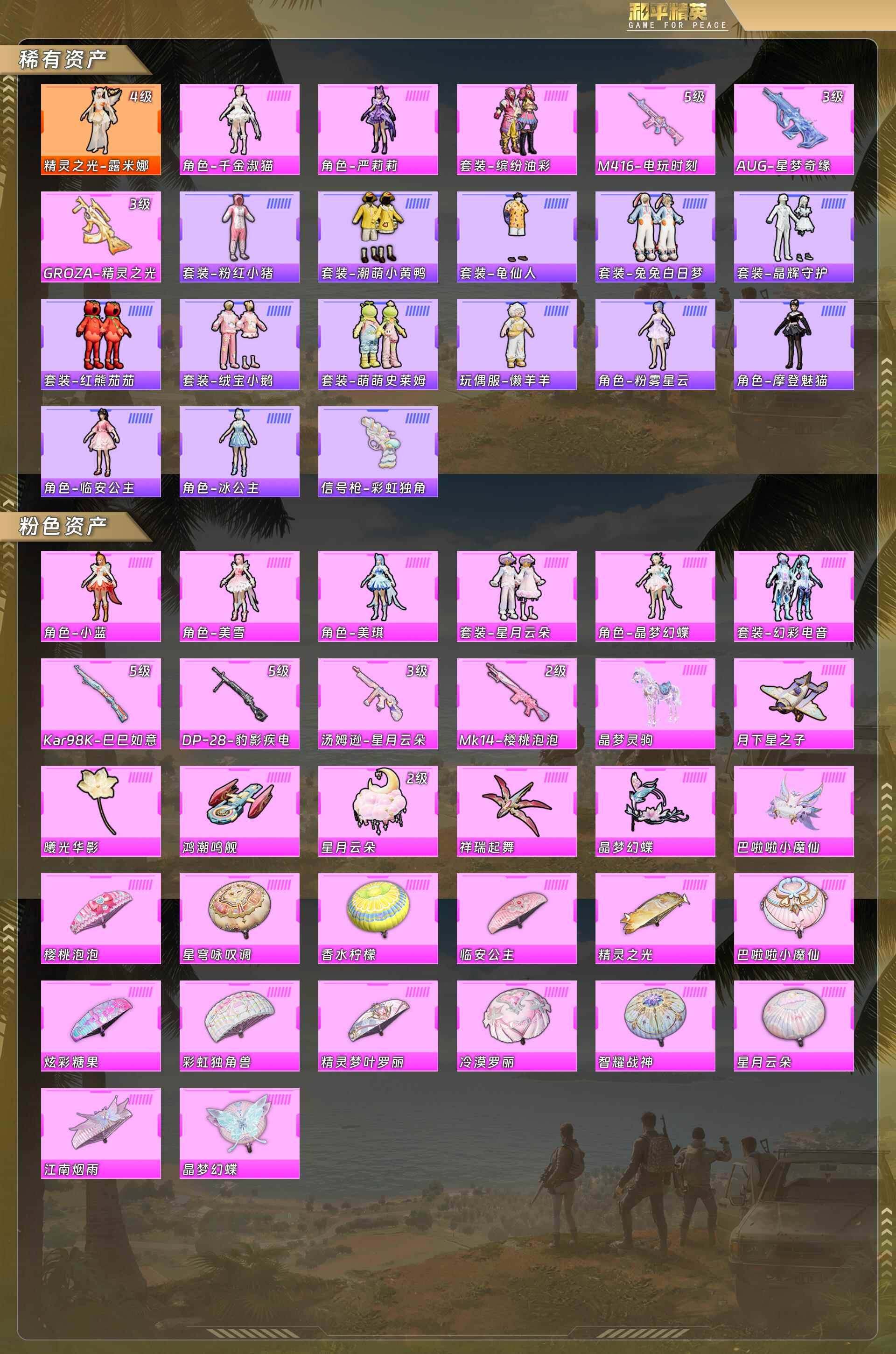 公主号-4级露米娜/千金淑猫/严莉莉/猪脸/AUG星梦奇缘3级/狗砸精灵之光3级/小黄鸭/兔兔白日梦/小番茄/小蓝/美雪/美琪/星月云朵/晶梦幻蝶/幻彩电音/M4电玩时刻5级/汤姆逊星月云朵3级/Mk樱桃泡泡2级/晶梦灵驹(1神装9粉套7粉枪1载具)没战神框HP6607-7粉色飞行器-59982热力值-6王牌印记-123套装-158枪皮