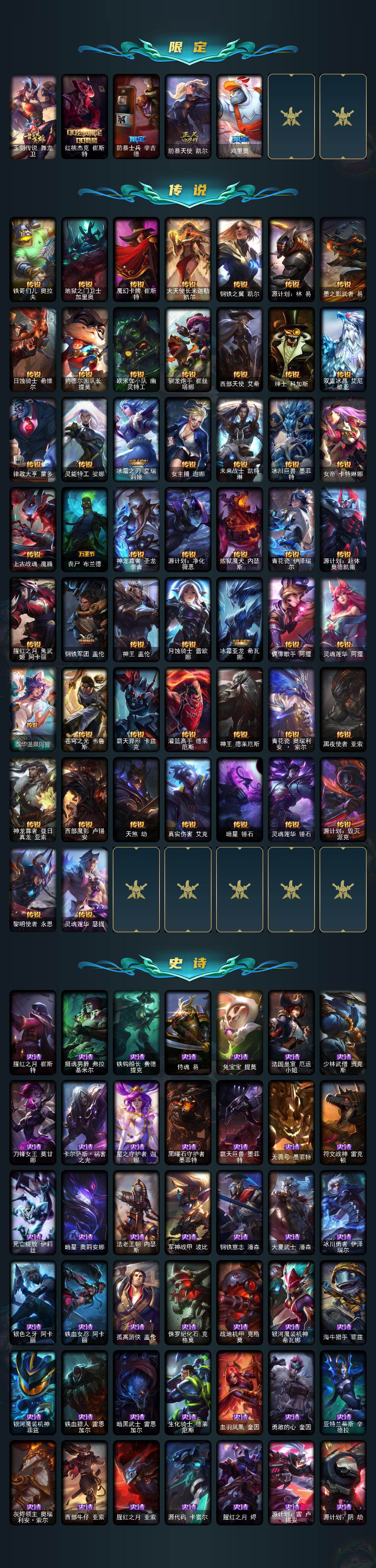 【神话皮肤】:十周年纪念安妮,源代码乐芙兰,暗星科加斯,开天龙神青花瓷奥瑞利安索尔,创世黑夜使者亚索,灰烬骑士派克,西部魔影炽天使永恩,至臻北极星使者沃里克,至臻西部魔影猎天使恶魔泰隆