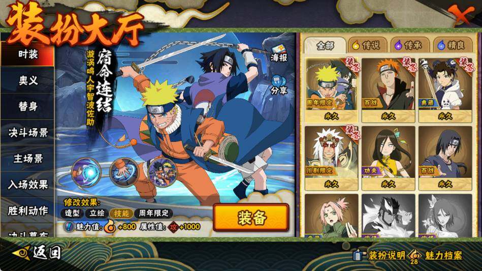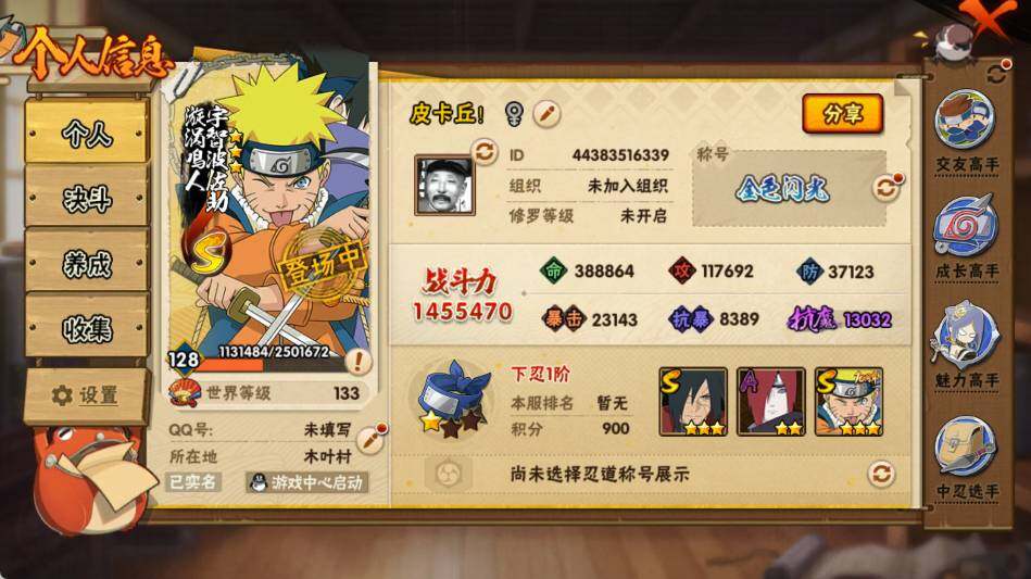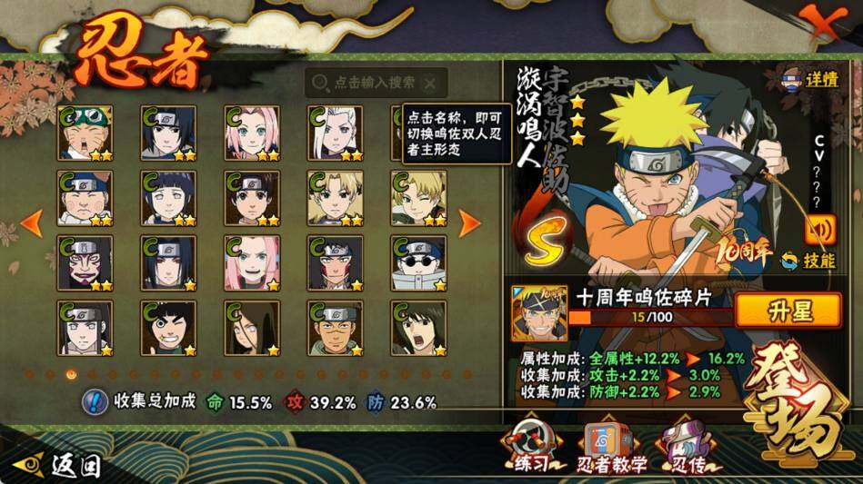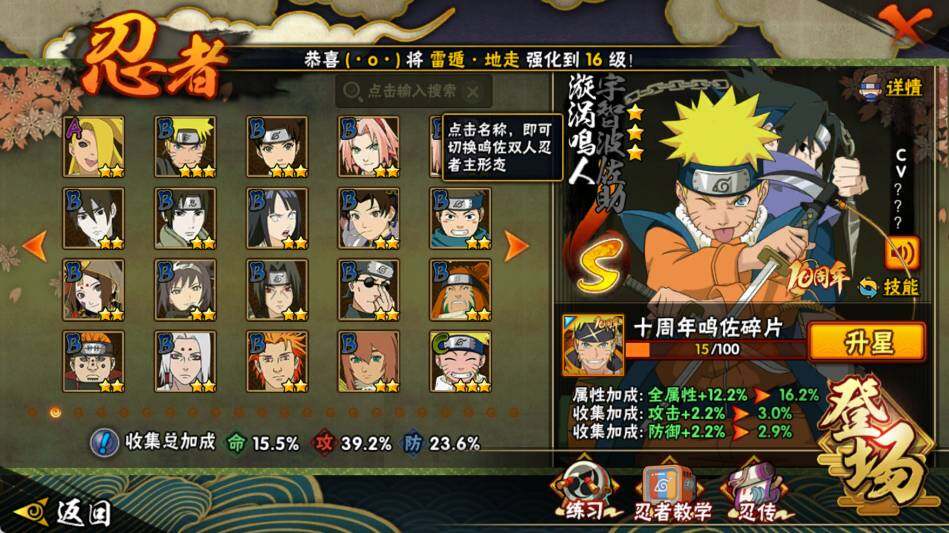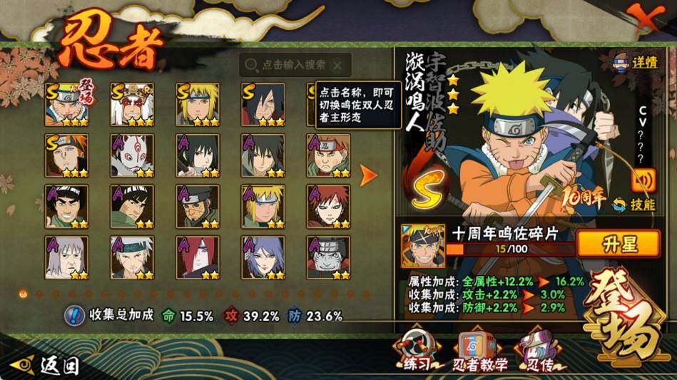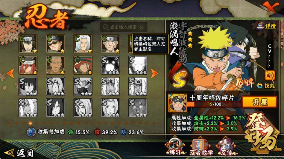 【S级忍者】:宇智波斑「秽土转生·解」(3星),宇智波鼬「须佐能乎」(3星),自来也「舞之豪杰」(3星),波风水门(3星),佩恩「天道」(3星),漩涡鸣人·宇智波佐助(3星)