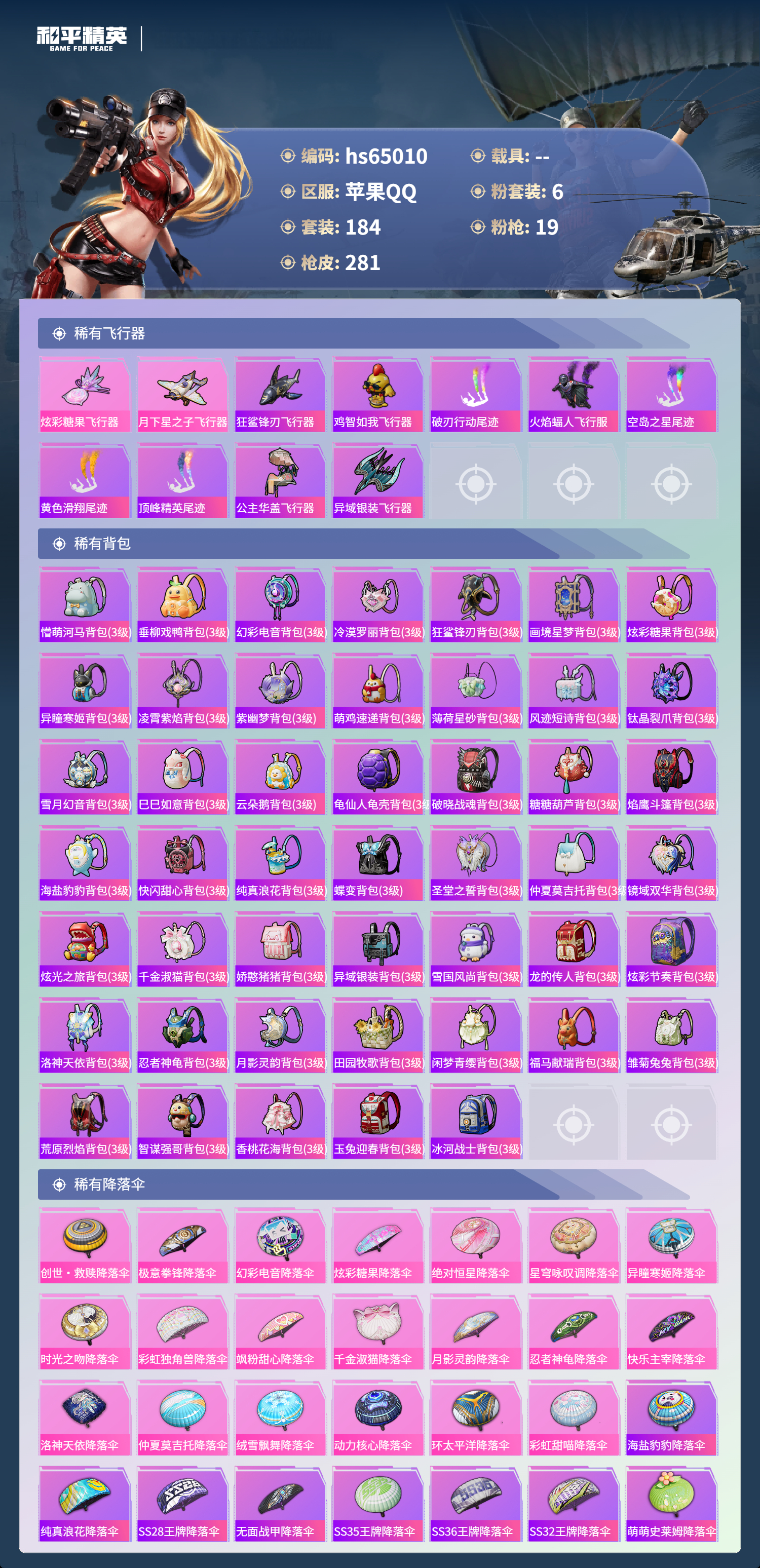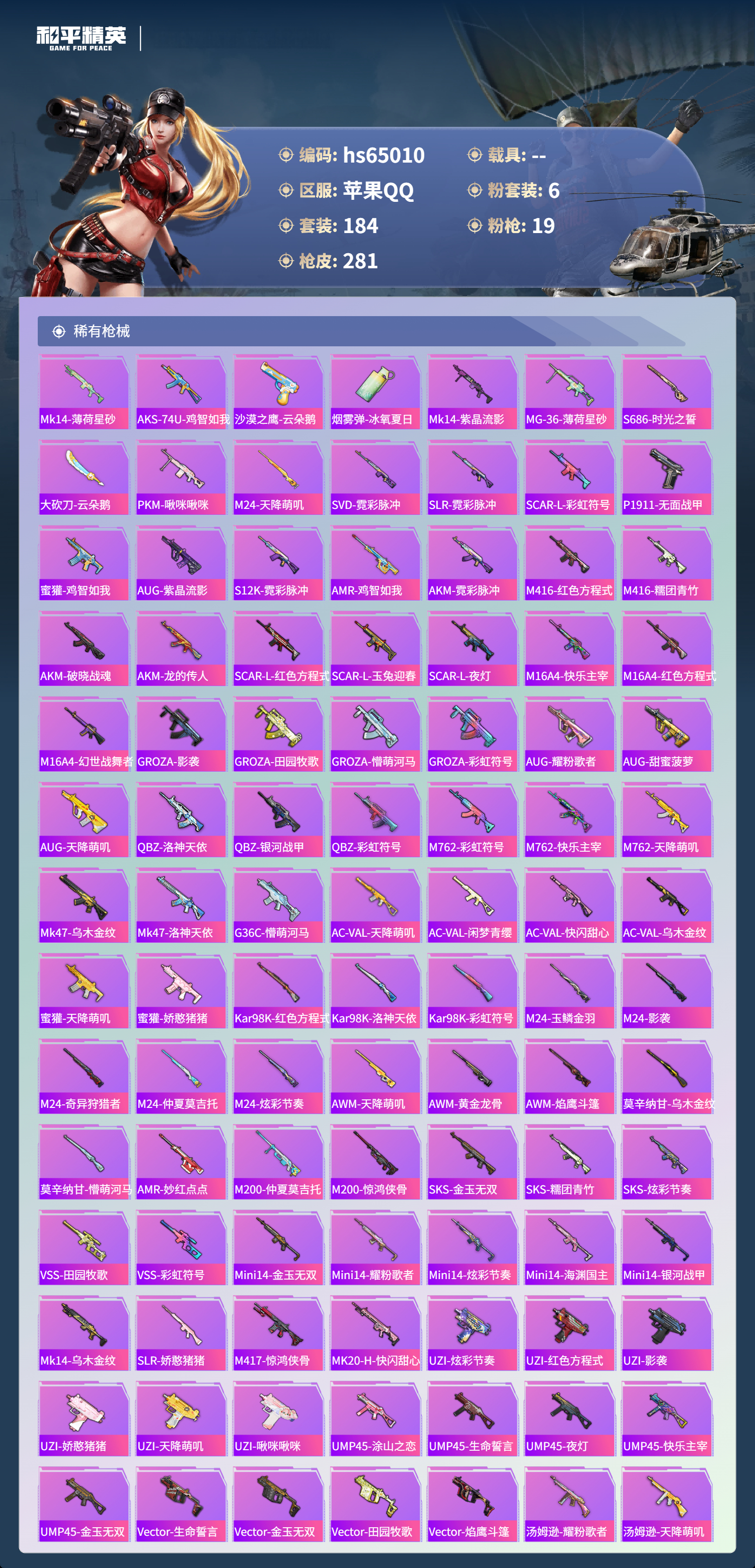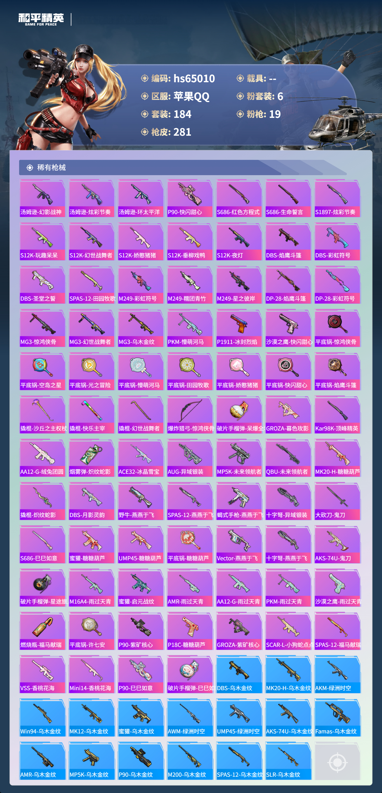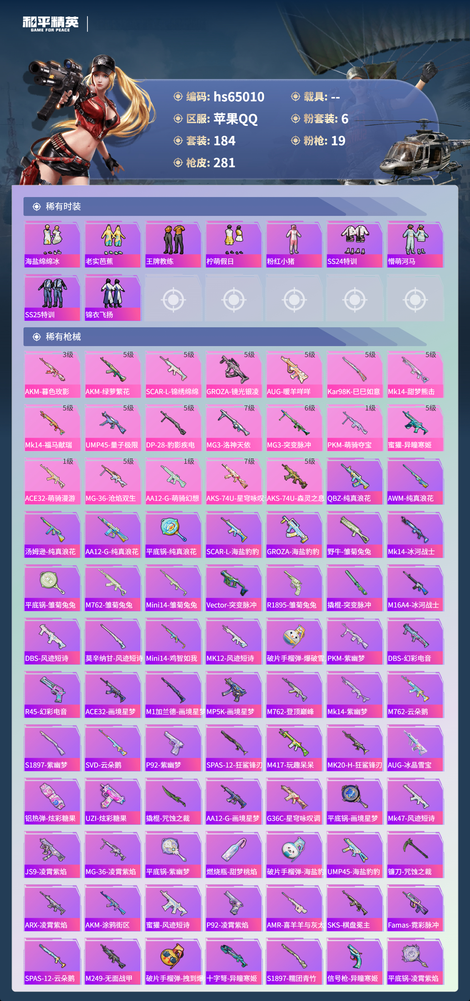 hs65010 苹果手Q-17王牌印记-6粉装-19特效枪-84357热力值-184套装-281枪皮-10卓越印记-3传奇印记