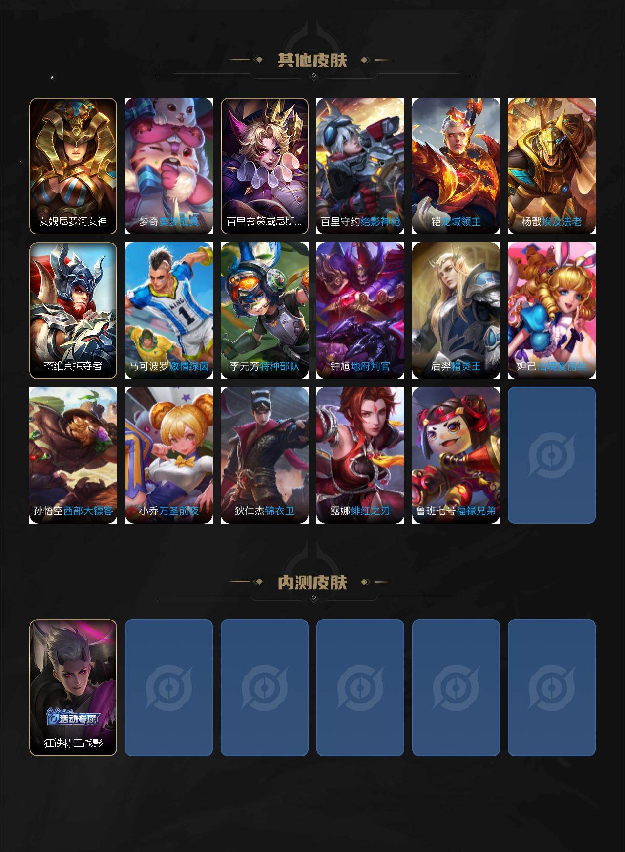 【传说皮肤】:狄仁杰神骥赴朔漠,马超神骥逐星野,后羿神树通天,司空震愿照山河定,澜愿照九州拓,云缨幻光神枪,裴擒虎祥瑞亨通,桑启鸣野蒿,东皇太一灼幽烈阳,梦奇胖达荣荣,宫本武藏地狱之眼,狄仁杰超时空战士