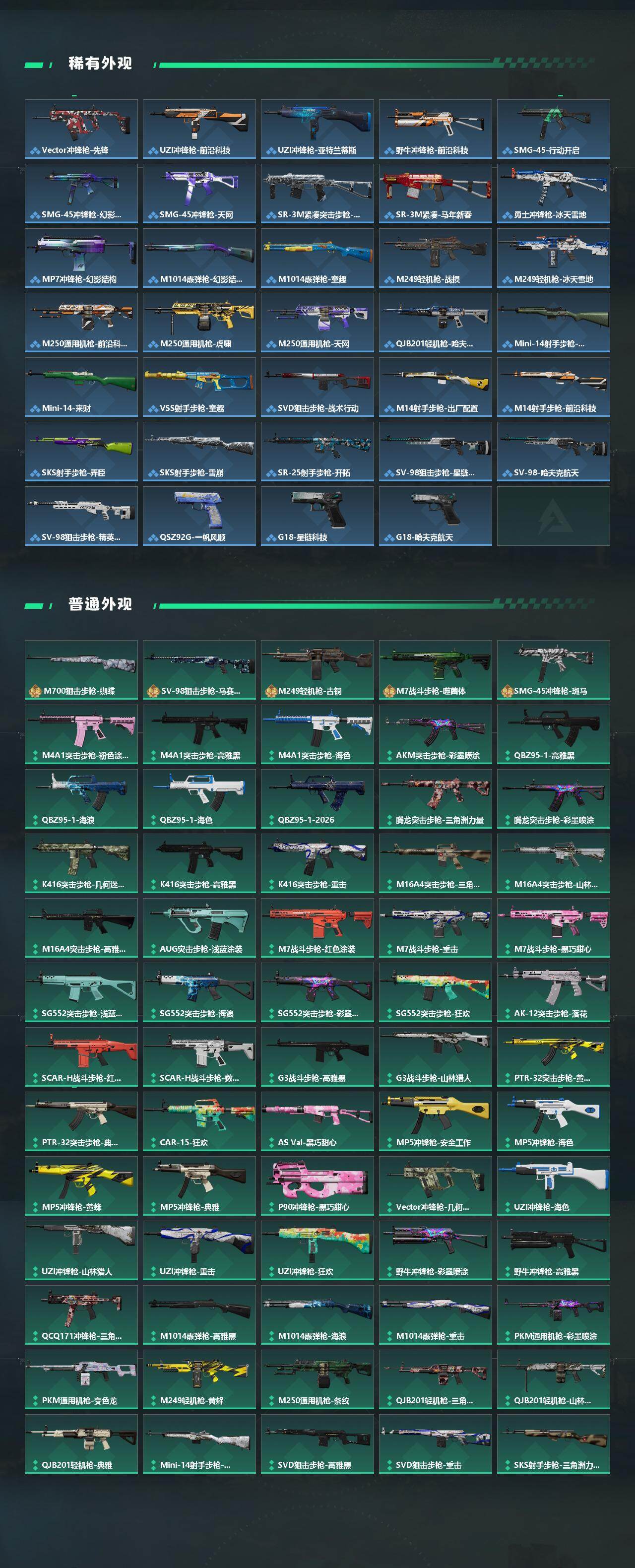 【传说外观】:M4A1突击步枪-阿米娅,AKM突击步枪-锦绣,ASh-12战斗步枪-鹅鸭杀,K416突击步枪-行动记录,AUG突击步枪-悠然茶歇