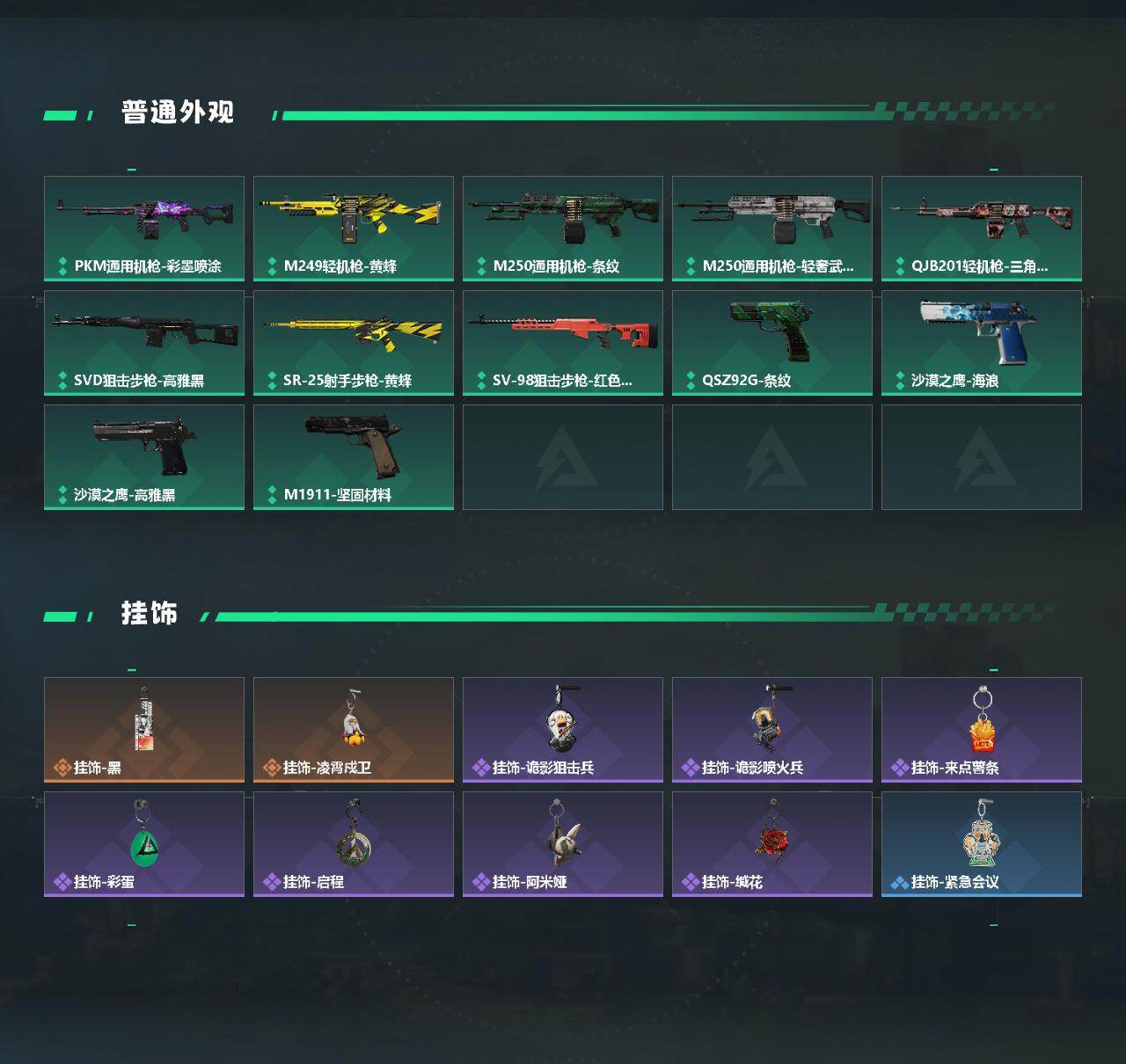 【传说外观】:M4A1突击步枪-阿米娅,SCAR-H战斗步枪-启航,CAR-15突击步枪-阿米娅,腾龙突击步枪-捞点薯条,勇士冲锋枪-能天使-午夜邮差,M14射手步枪-缄花,SR-25射手步枪-缄花,AWM狙击步枪-捞点薯条,.357左轮-缄花,93R-捞点薯条,复合弓-黑·天际线