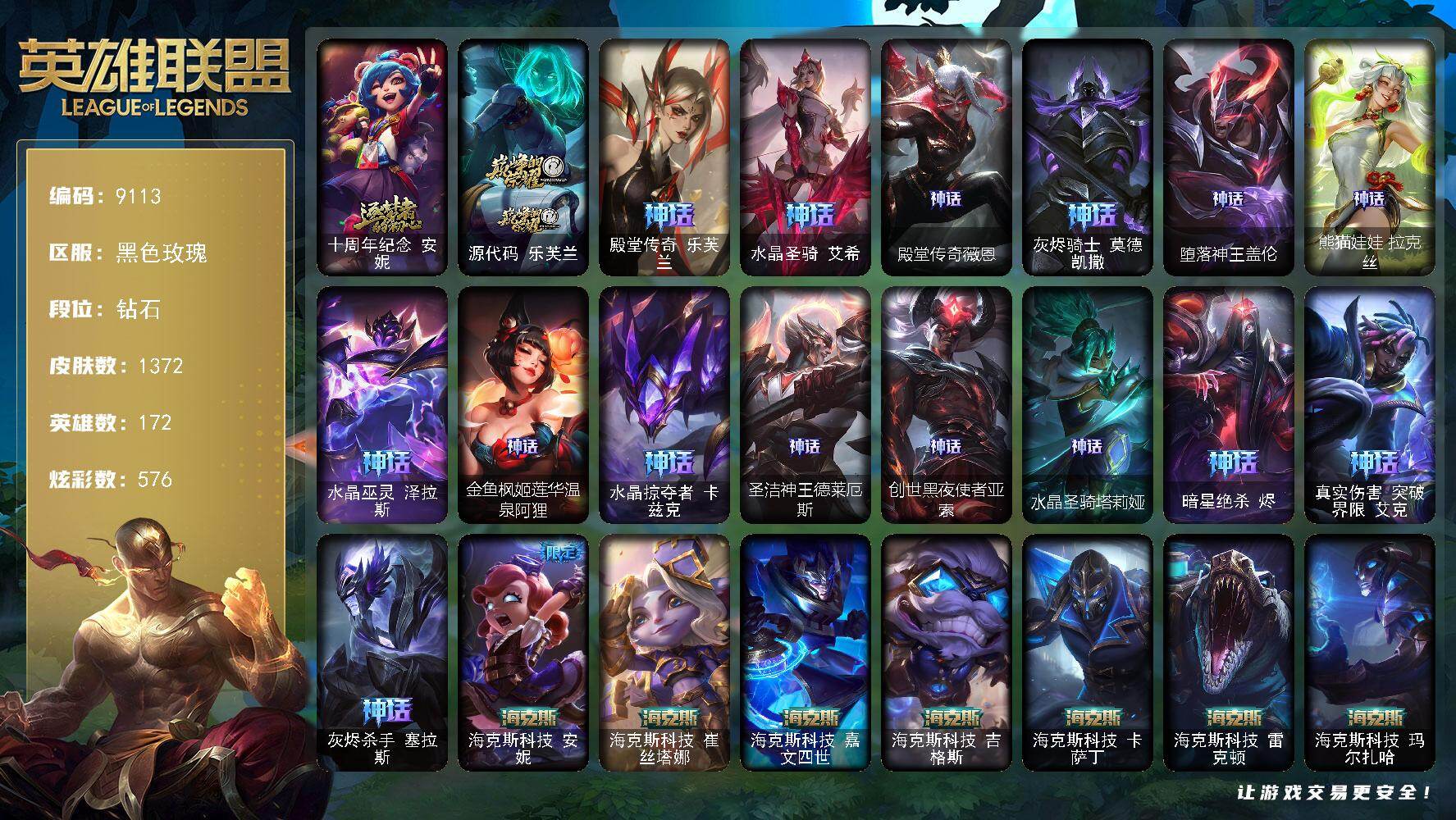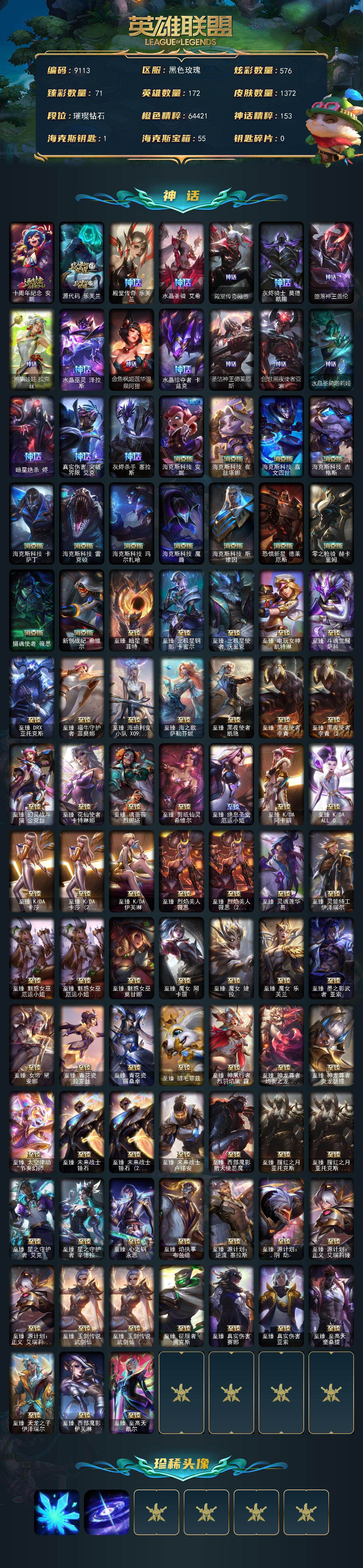 【签名卡莎,,,王佛耶戈】钻石段位-172英雄-1372皮肤-576炫彩-4终极-1