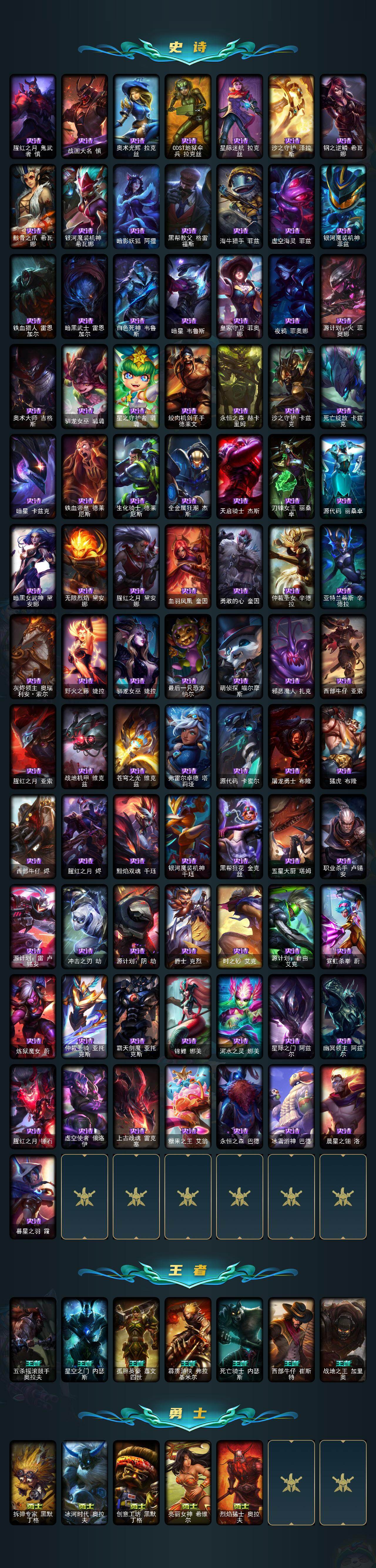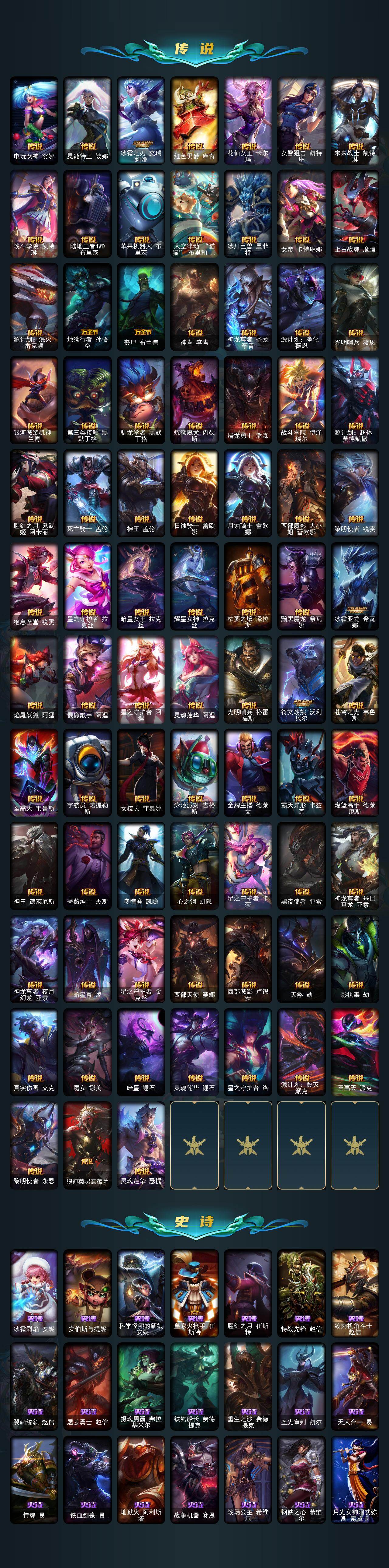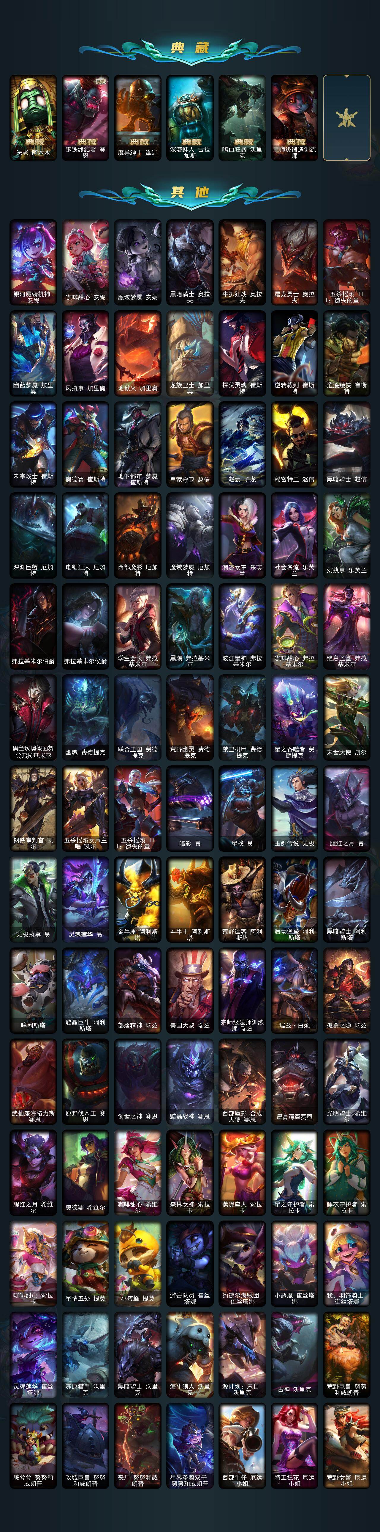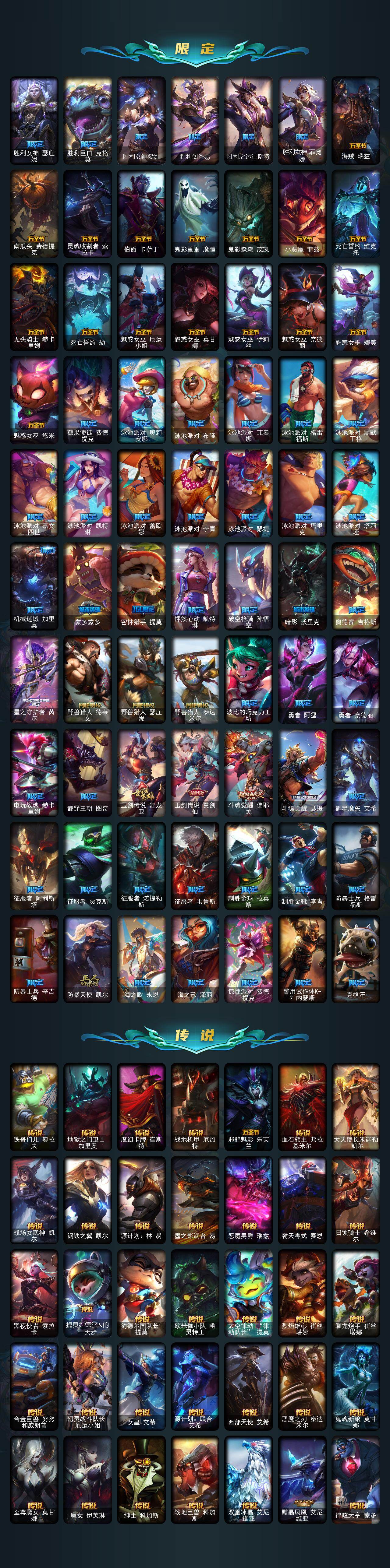 【神话皮肤】:十周年纪念安妮,源代码乐芙兰,殿堂传奇乐芙兰,水晶圣骑艾希,殿堂传奇薇恩,灰烬骑士莫德凯撒,堕落神王盖伦,熊猫娃娃拉克丝,水晶巫灵泽拉斯,金鱼枫姬莲华温泉阿狸,水晶掠夺者卡兹克,圣洁神王德莱厄斯,创世黑夜使者亚索,水晶圣骑塔莉娅,暗星绝杀烬,真实伤害突破界限艾克,灰烬杀手塞拉斯,海克斯科技安妮,海克斯科技崔丝塔娜,海克斯科技嘉文四世,海克斯科技吉格斯,海