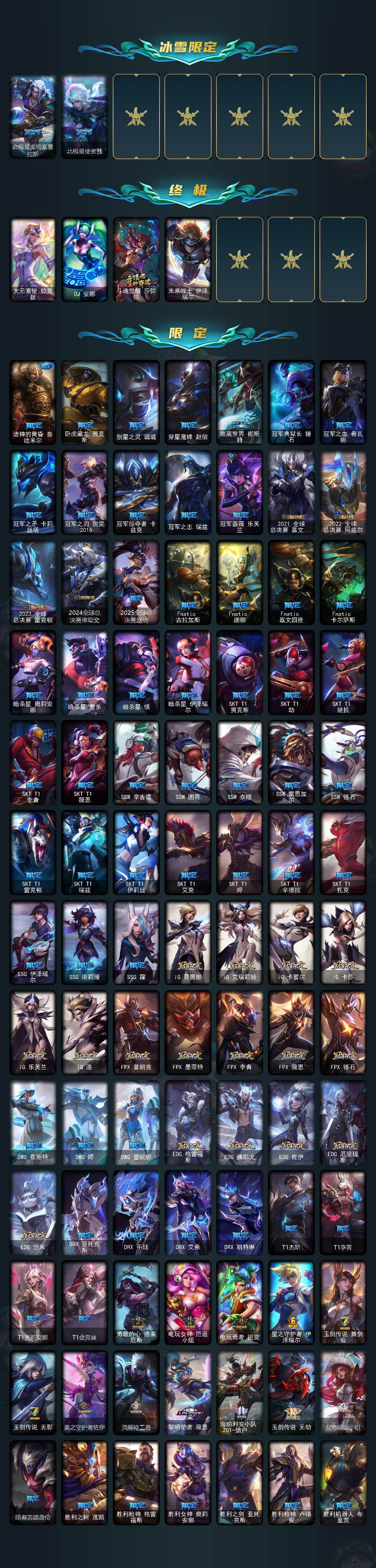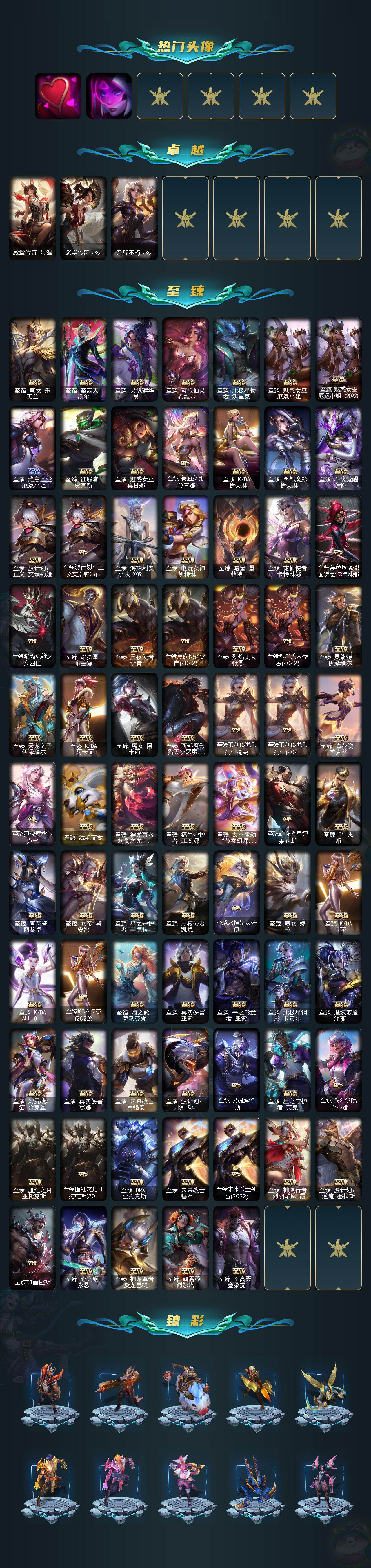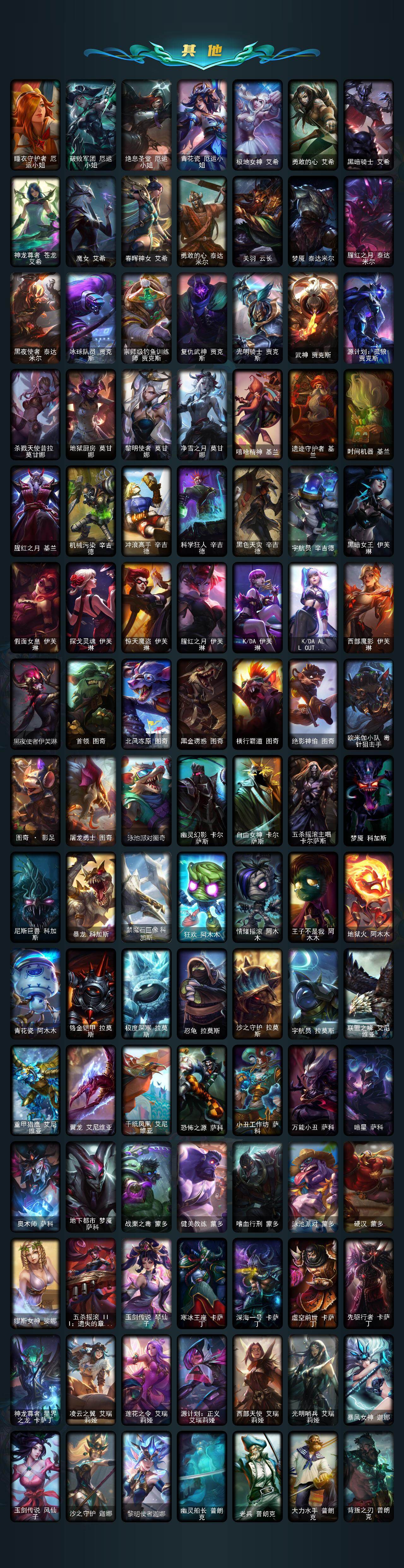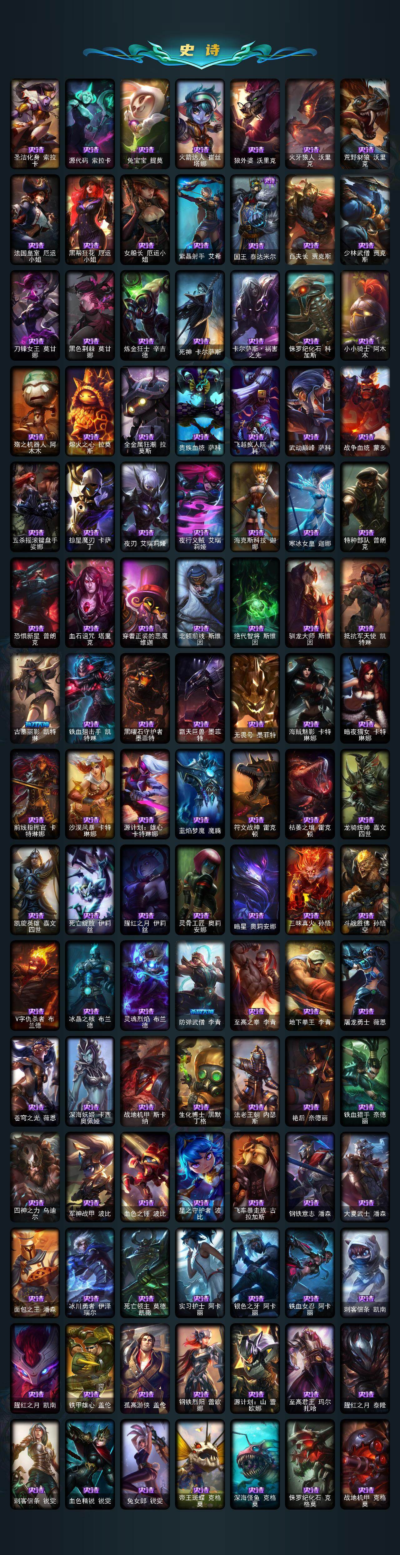 【神话皮肤】:十周年纪念安妮,源代码乐芙兰,殿堂传奇乐芙兰,水晶圣骑艾希,殿堂传奇薇恩,灰烬骑士莫德凯撒,堕落神王盖伦,熊猫娃娃拉克丝,水晶巫灵泽拉斯,金鱼枫姬莲华温泉阿狸,水晶掠夺者卡兹克,圣洁神王德莱厄斯,创世黑夜使者亚索,水晶圣骑塔莉娅,暗星绝杀烬,真实伤害突破界限艾克,灰烬杀手塞拉斯,海克斯科技安妮,海克斯科技崔丝塔娜,海克斯科技嘉文四世,海克斯科技吉格斯,海