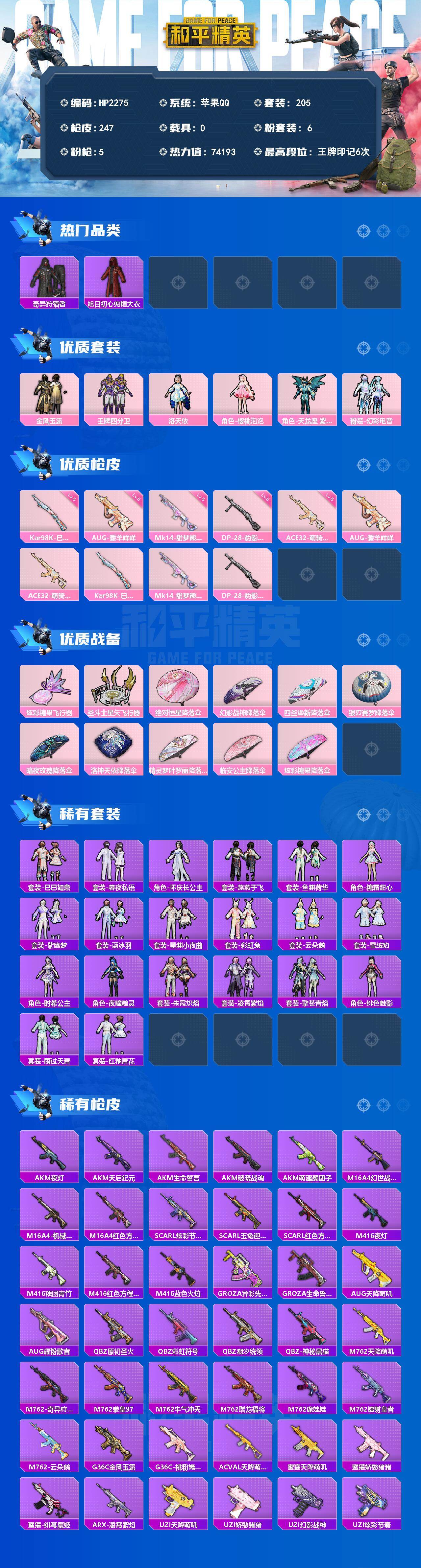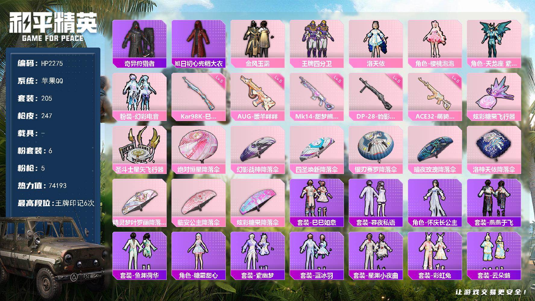 【HP2275】205套装/枪械5/装备276/战备159/王牌印记6/热力值74193/五级AUG-暖羊咩咩/五级ACE32-萌骑漫游/五级Kar98K-巳巳如意/五级Mk14-甜梦熊击/五级DP-28-豹影疾电/套装-奇异狩猎者/旭日初心兜帽大衣/粉装-金风玉露/粉装-王牌四分卫/角色-洛天依/角色-樱桃泡泡/角色-天龙座 紫龙/粉装-幻彩电音/AUG-暖羊咩咩/ACE32-萌骑漫游/Kar98K-巳巳如意/Mk14-甜梦熊击/DP-28-豹影疾电/炫彩糖果飞行器/圣斗士星矢飞行器/绝对恒星