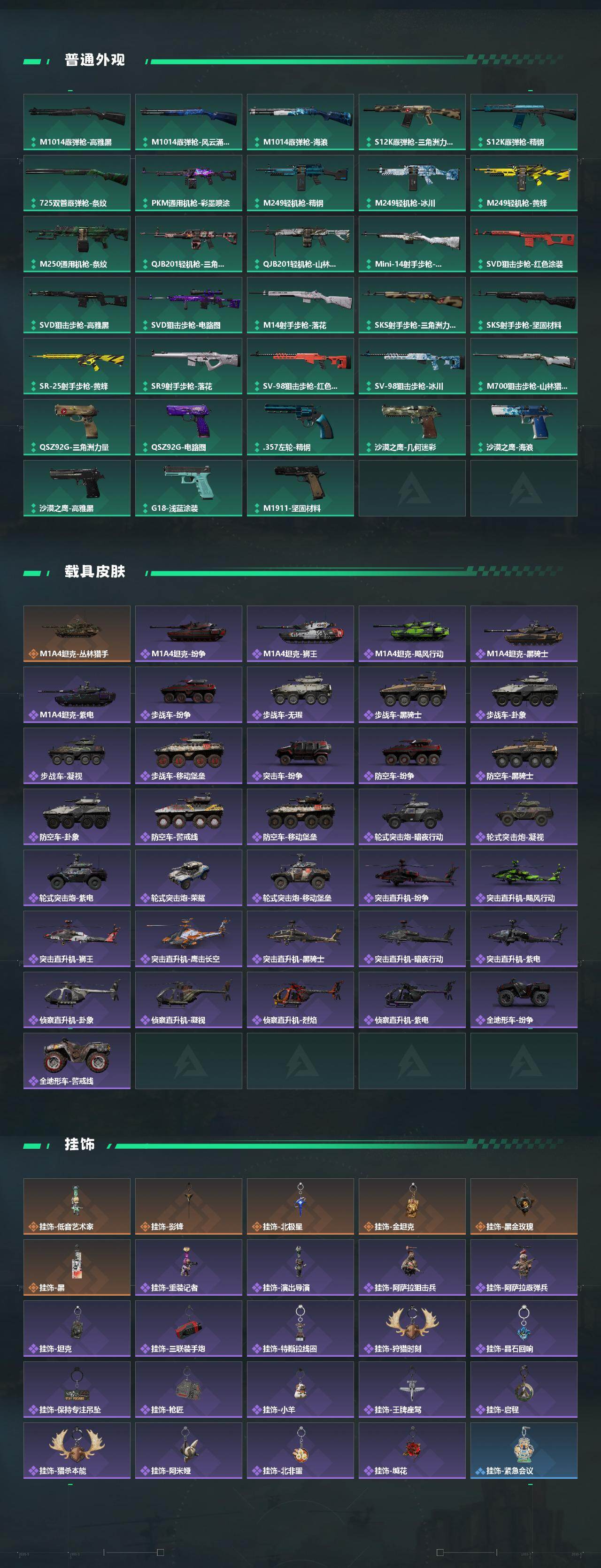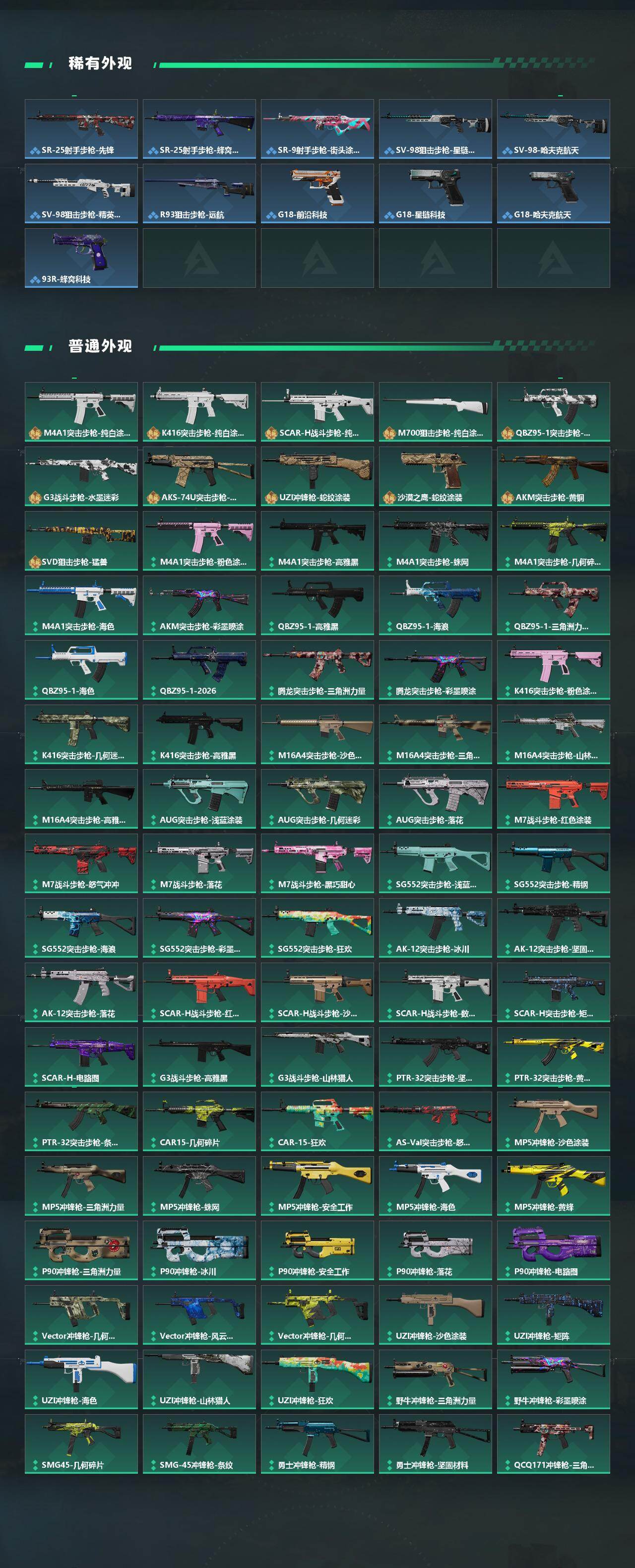 【传说外观】:M4A1突击步枪-蚀金玫瑰,M4A1突击步枪-阿米娅,AKM突击步枪-黎明警戒,QBZ95-1突击步枪-破军,M16A4突击步枪-狩猎时刻,M7战斗步枪-神秘艺术,AK-12突击步枪-夜鹰,AK-12突击步枪-特