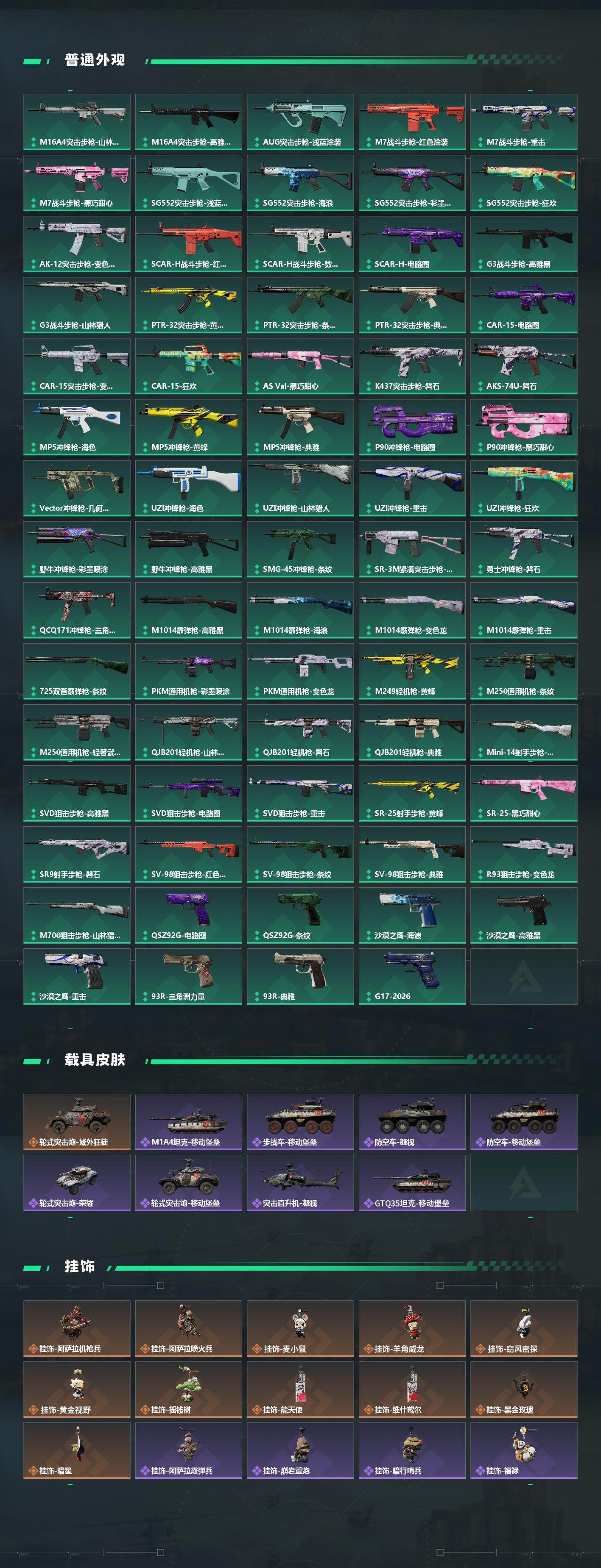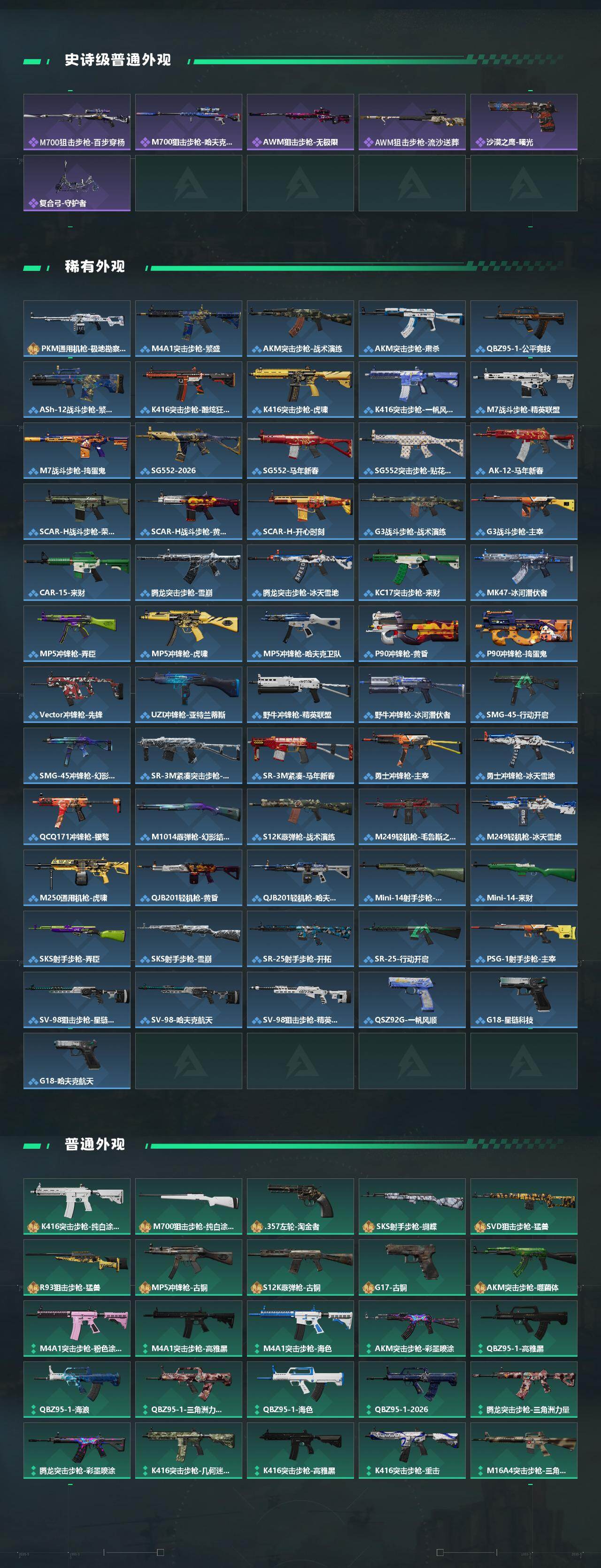 【传说外观】:M4A1突击步枪-蚀金玫瑰,M4A1突击步枪-阿米娅,ASh-12战斗步枪-鹅鸭杀,K416突击步枪-行动记录,AUG突击步枪-悠然茶歇,SG552突击步枪-运动员,SC
