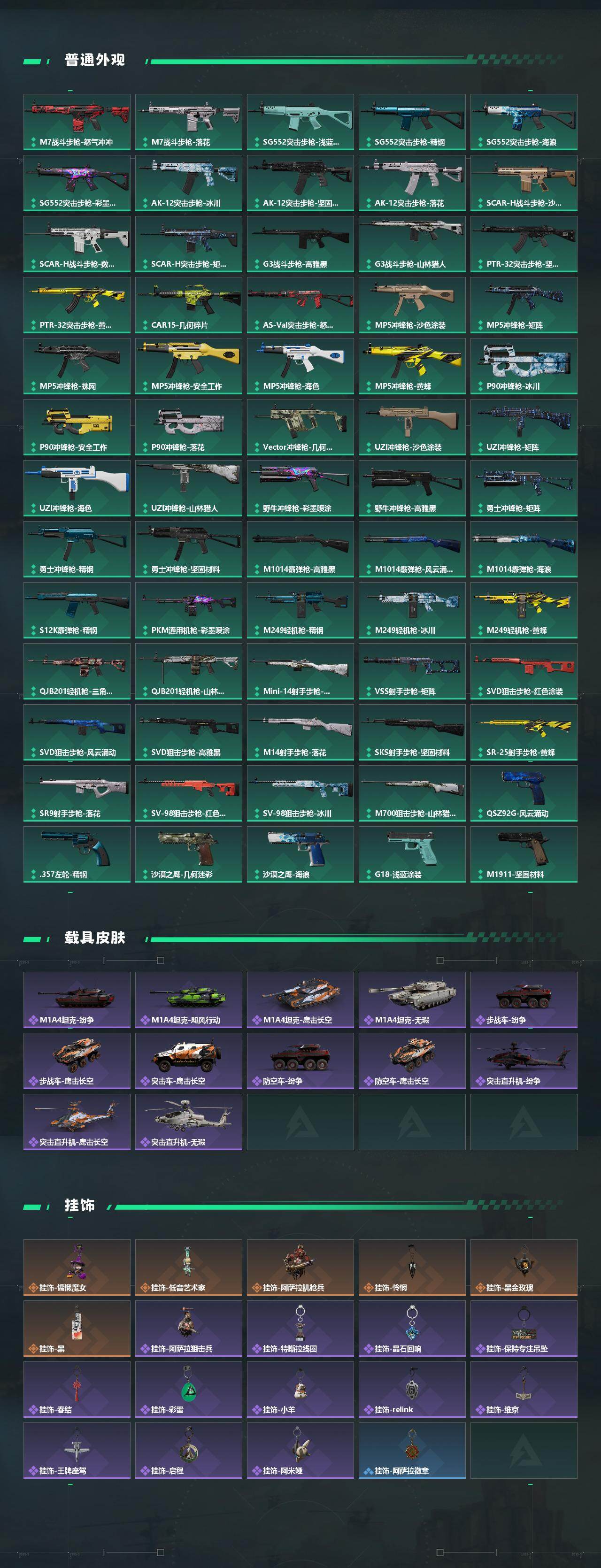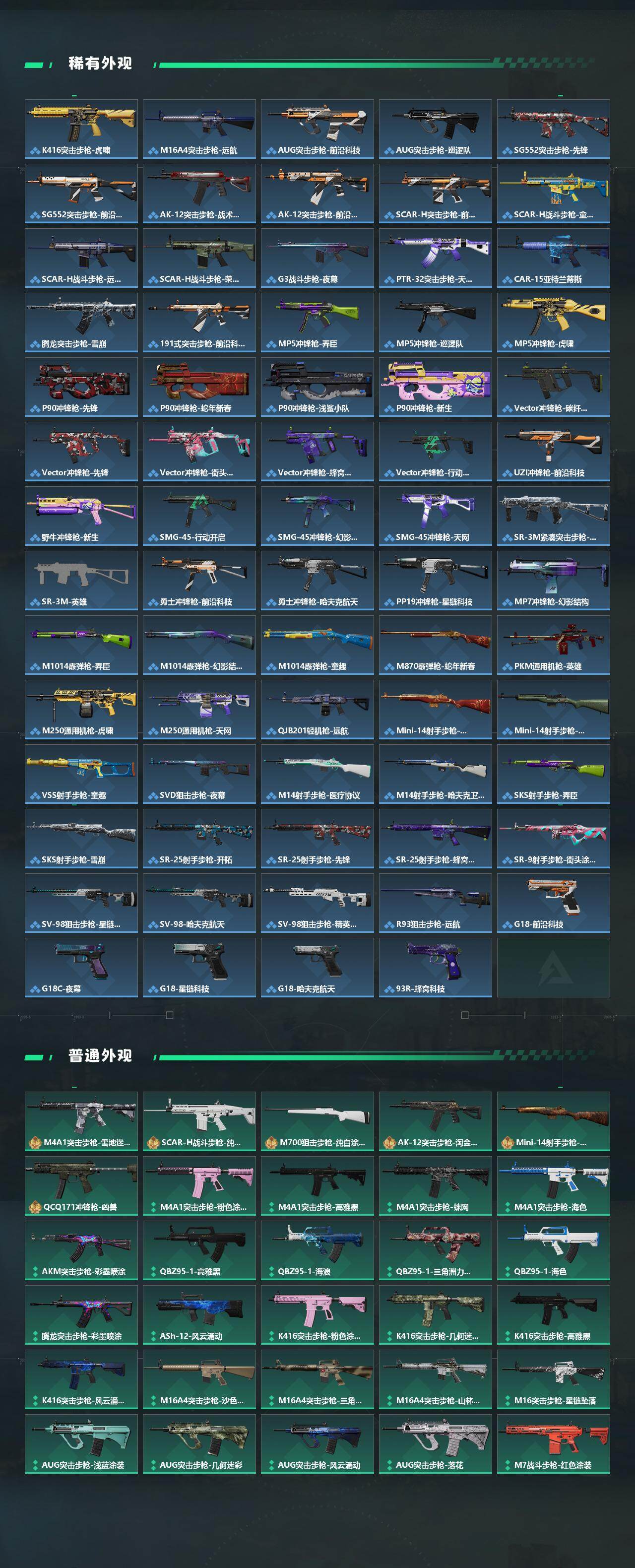 【传说外观】:M4A1突击步枪-蚀金玫瑰,M4A1突击步枪-阿米娅,QBZ95-1突击步枪-破军,ASh-12战斗步枪-怜悯,M7战斗步枪-怜悯,M7战斗步枪-维京,AK-12突击步枪-夜鹰,AK-12突击